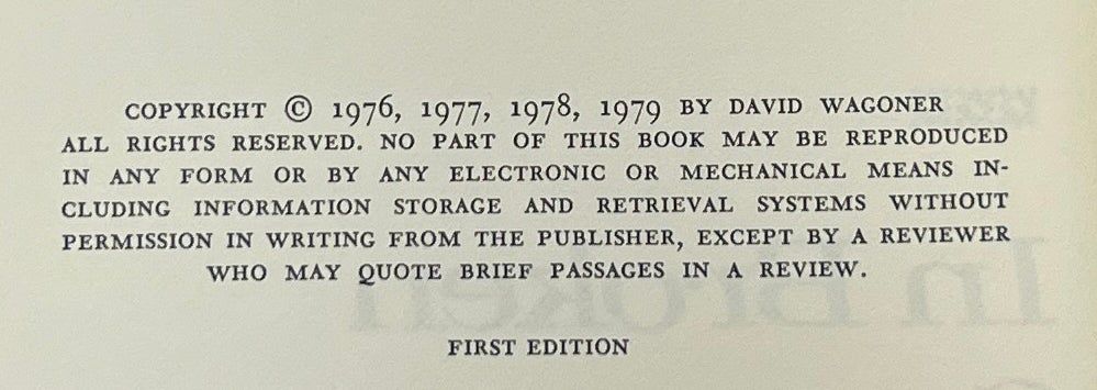 Boston: Little, Brown & Co, 1979. First Edition. Hardcover. Fine/Fine. Inscribed by Wagoner on the front endpaper. Fine in an about Fine jacket, unclipped ($8.95), rubbed at the front flap fold. Green cloth with silver gilt lettering on the spine. Square and firmly bound, clean internally. Wagoner's National Book Award-nominated collection of poems.