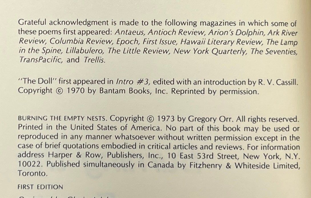 New York: Harper and Row, Publishers, 1973. First Edition. Paperback. Near Fine. Inscribed by Orr on the half-title page. Near Fine. Wraps lightly rubbed, toned at the spine. Square and firmly bound, clean internally. The first collection by the Guggenheim Fellow poet.