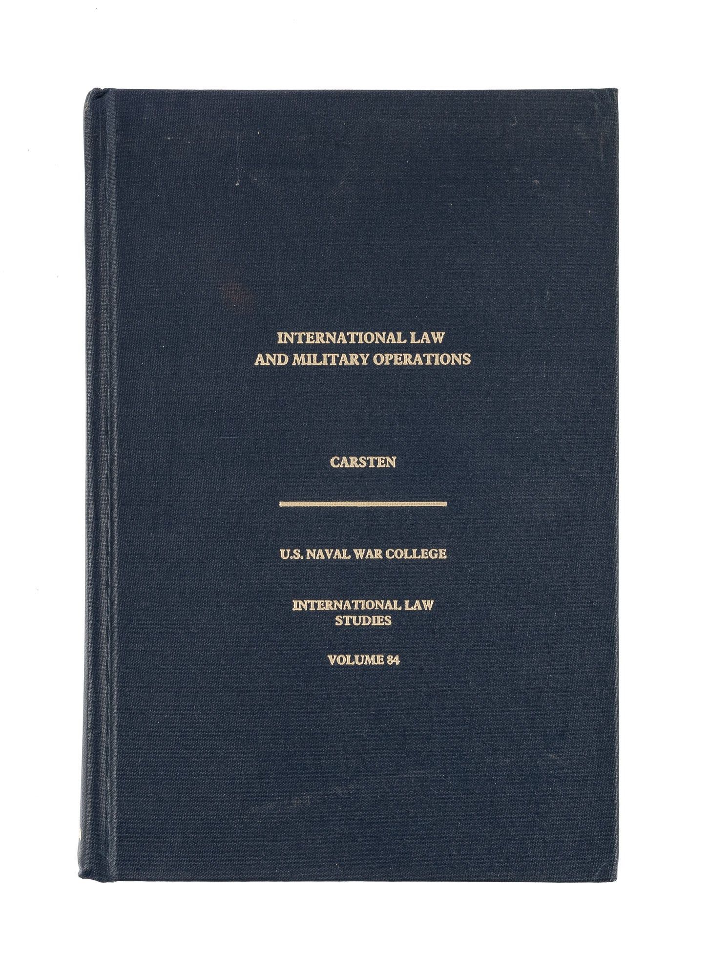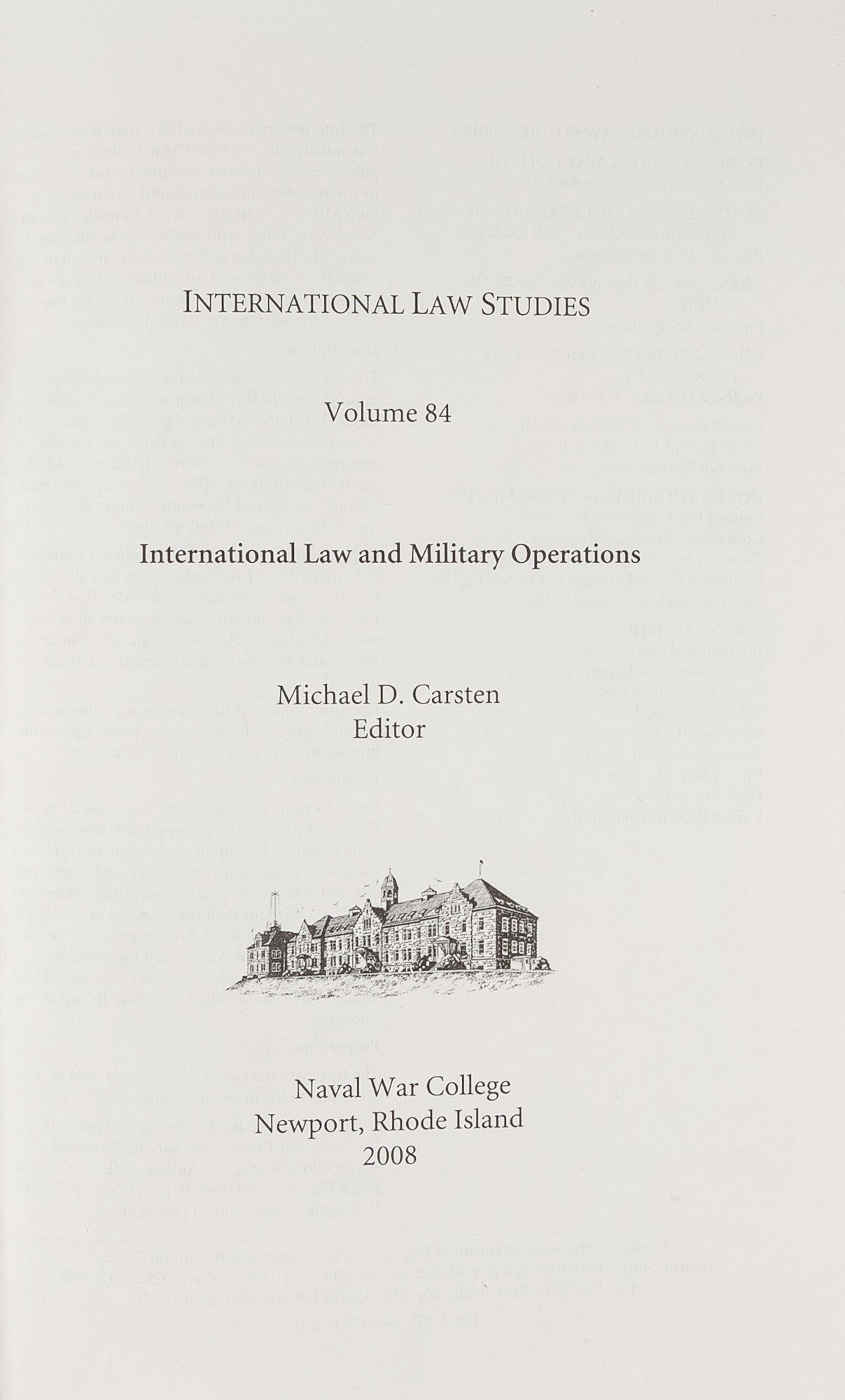 2008. International Law Studies. Volume 84. International Law Studies. Volume 84. Carsten, Michael D. International Law Studies. Volume 84, International Law and Military Operations. Newport, R.I.: Naval War College, 2008. xxiii, 319 pp. Cloth with gilt lettered spine and front cover. Light shelfwear and soiling. Internally clean. $45. * Contents: The Influence of Law on Sea Power Doctrines: The New Maritime Strategy and the Future of the Global Legal Order, Craig H. Allen; Conditions on Entry of Foreign-flag Vessels into US Ports to Promote Maritime Security, William D. Baumgartner and John T. Oliver; Encroachment on Navigational Freedoms, Raul (Pete) Pedrozo; China and the Law of the Sea: An Update, Guifang Xue; The 1982 United Nations Convention on the Law of the Sea: An Historical Perspective on Prospects for US Accession, Horace B. Robertson, Jr.; The Unvarnished Truth: The Debate on the Law of the Sea Convention, William L. Schachte, Jr.; Conflicts Between United Nations Security Council Resolutions and the 1982 United Nations Convention on the Law of the Sea, and Their Possible Resolution, Robin R. Churchill; Starting From Here, Ashley S. Deeks; Distinction and Loss of Civilian Protection in International Armed Conflicts, Yoram Dinstein; The Treatment of Detainees and the "Global War on Terror": Selected Legal Issues, David Turns; Issues Arising From Coalition Operations: An Operational Laywer's Perspective, Neil Brown; Coalition Operations: A Compromise or an Accommodation, Vicki McConachie. Coalition Operations: A Canadian Perspective, Kenneth Watkin; "Change Direction" 2006: Israeli Operations in Lebanon and the International Law of Self-defense, Michael N. Schmitt.