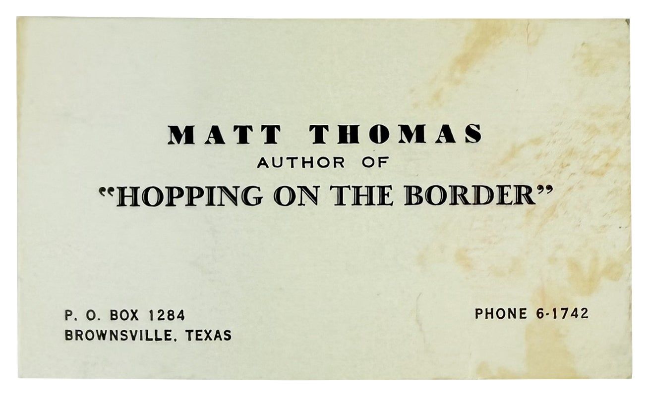 This copy offered with the author's business card listing him simply as "author of 'Hopping on the Border'" and giving his PO box in Brownsville, TX.