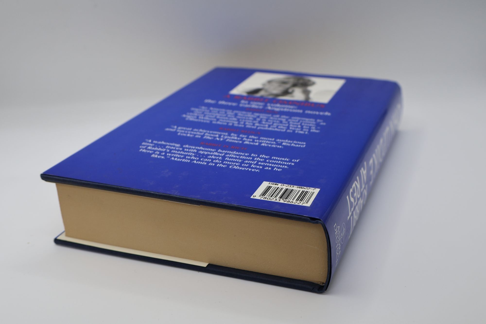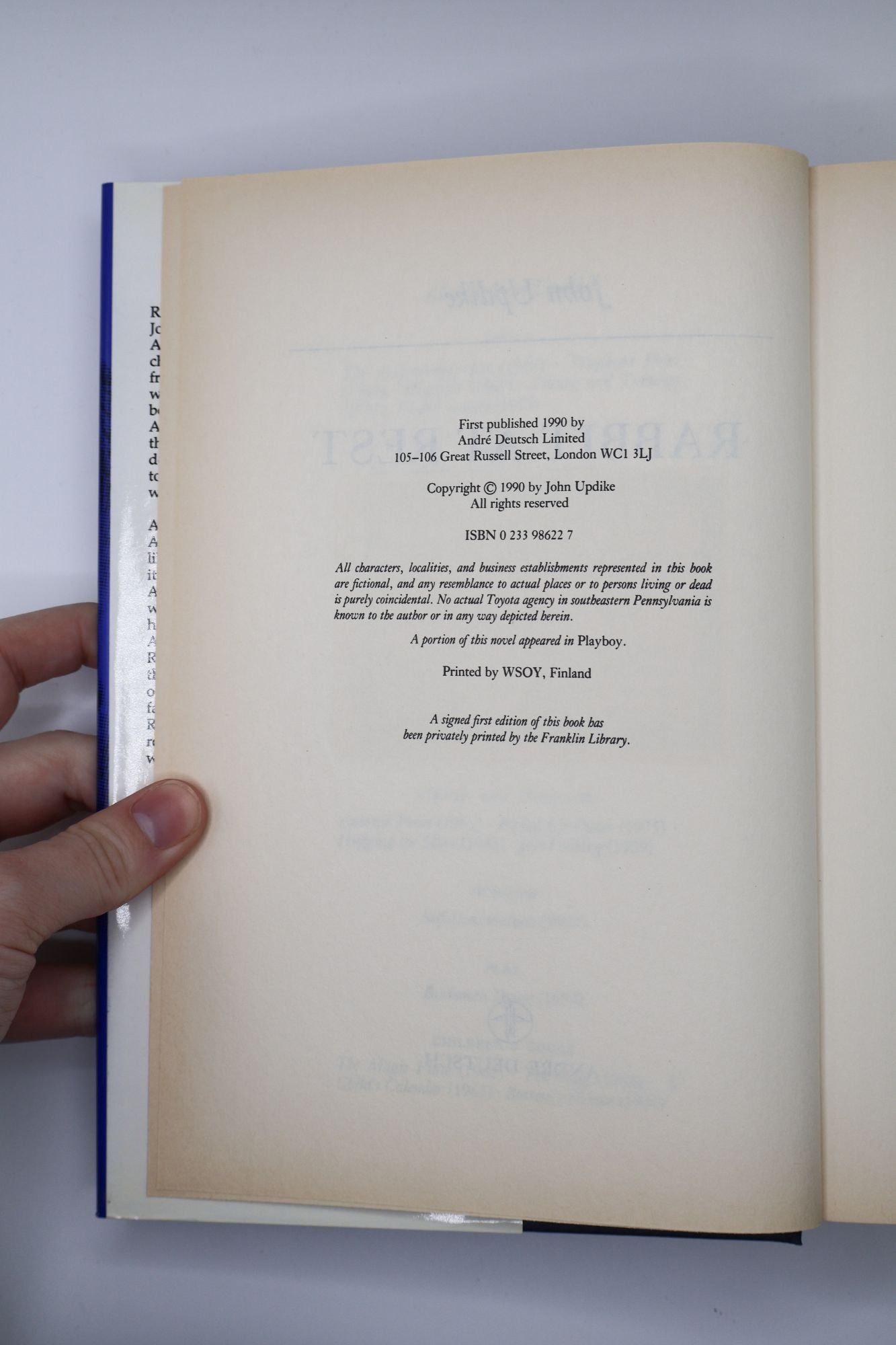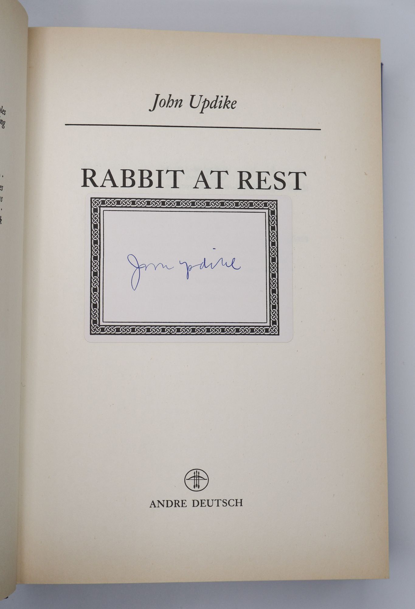 London: Andre Deutsch, 1990. First British Edition. Hardcover. Octavo, 505 pages. In Very Good condition with a Very Good dust jacket. Spine blue with gold and white lettering. Dust jacket protected in mylar covering, with price uncut: "£14.99 net." Light scuffing to covers. Toning to textblock and interior pages. Signed by John Updike on bookplate adhered to title page. Shelved in HC Fiction. 1396571. Shelved Dupont Bookstore.