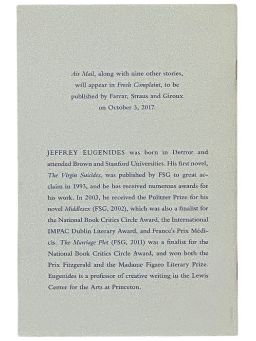 New York: Farrar, Straus & Giroux, 2017. Limited Edition. Stapled Binding. Fine. An exceptional copy. 2017 Stapled Binding. 27 pp. This limited edition chapbook contains the story 'Air Mail' from Jeffrey Eugenides's forthcoming book Fresh Complaint to be published in October 2017. Eugenides won