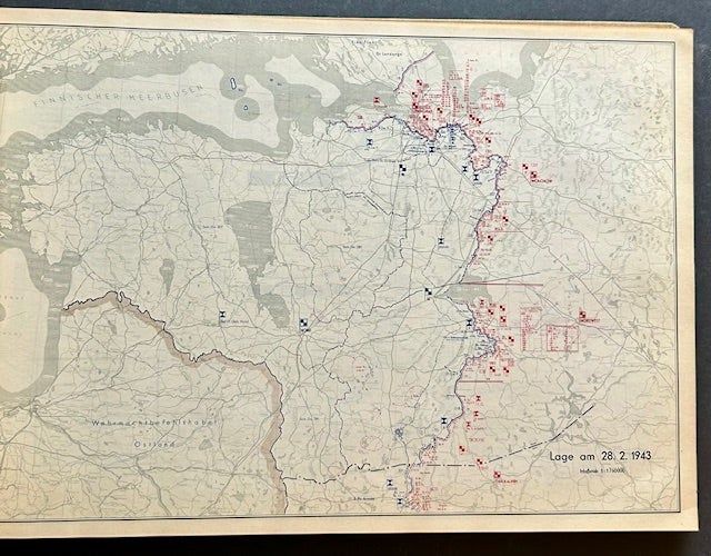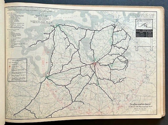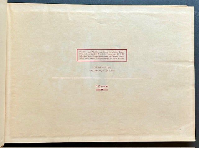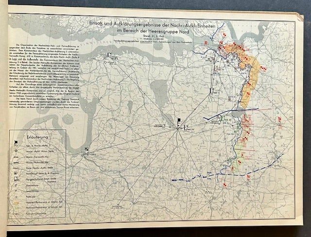 The Supreme Command of Army Group North, 1944. Cloth. Near Fine. Very scarce, painstakingly-detailed 1944 examination (with exacting maps and charts) of the German campaign against the Soviet Union of Army Group North. Clean, solid and Near Fine in its string-tied oatmeal cloth. Oblong folio, 149 printed pages, including dozens and dozens of maps, charts and color transparencies along the rectos, and text (exclusively in German) usually at the facing verso. Both written and edited by 1st Lieutenant Heinemeyer, also includes a full-page expression of appreciation to the troops at the rear by Field Marshall General von Kuchler. Extensive, keen look at the Army Group North's penetration along the Eastern front into the Soviet Union (near Leningrad).