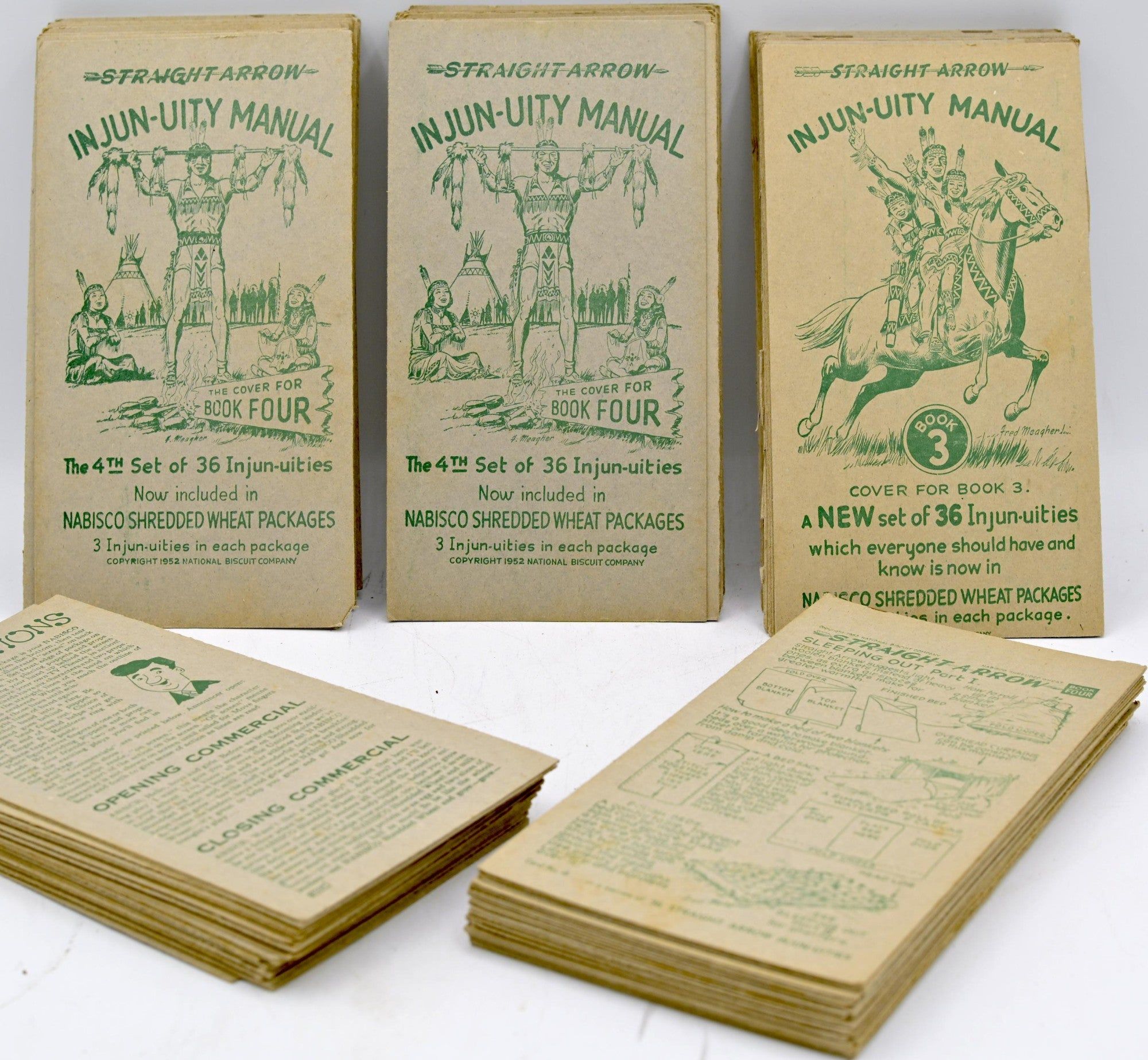 1952. From 1949-1952, the National Biscuit Company, also known as Nabisco, ran a radio program in coordination with advertising cards in packages of Shredded Wheat. The subject of this campaign was Straight Arrow, a fictional Comanche orphan raised as Steve Adams. Each tale involved him assuming his secret Indian identity to pursue justice, often with his horse Fury and sidekick, Packy McCloud. The Shredded Wheat cards came in sets of 3 separating the layers of biscuits, totally 4 books of 36 cards each. The cards contained “Indian lore and know-how” – or Indian ingenuity, from which the portmanteau title was drawn. ~~Fred Meagher of Magazine Enterprises drew the cards, printed in green ink on 7 ¼” x 4” grey cardboard. This collection includes 29 cards from Book 3, the full set of Book 4, an almost complete Book 4 (missing one), and a set of 28 cards from Book 4, and 28 more duplicates form Book 4. It also includes 2 of the cards from the later special edition in which Straight Arrow broke into the world of television through finger puppet crafts. One is the instructions, and the other is a script entitled, “Who Stole My Hoss?”. The character also found his way into comic books and toys.~~An early example of merchandising. All 158 cards are in good+ condition.