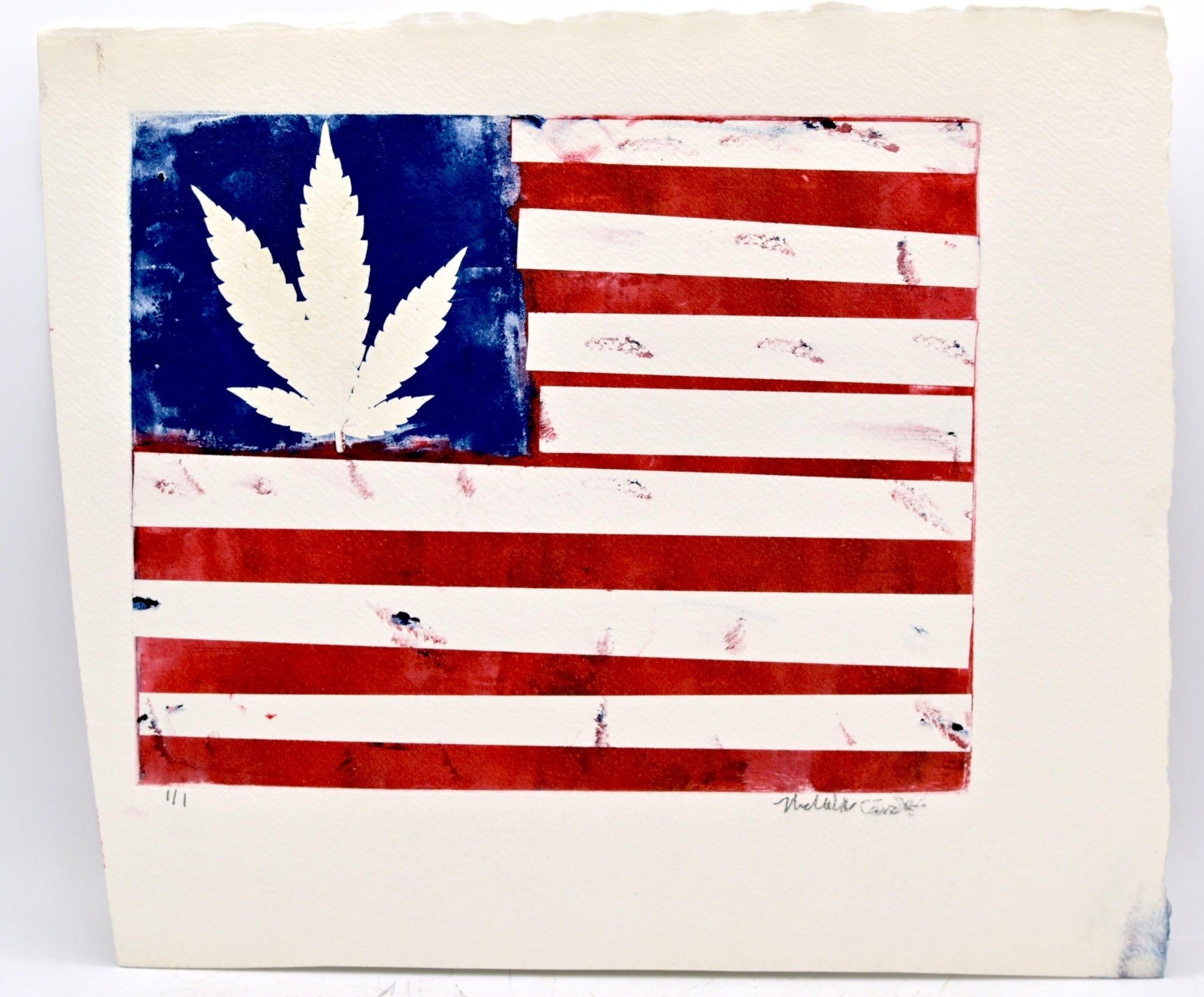 [MONOTYPE] MARIJUANA AMERICAN FLAG By Nicholas Cassitt 11” X 13” oil board monotype depicting an American flag with a marijuana leaf in place of the stars. Created by Richmond, VA artist, Nicholas Cassitt. This dope work is 1 of 1, a unique piece just in time for 420.