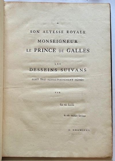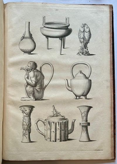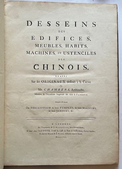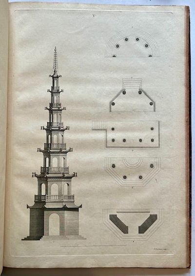 London: J. Haberkorn, 1757. Full calf. Very Good. The scarce 1757 1st edition of what is widely considered the first Western study of Chinese architecture. Published out of London (though text is entirely in French) in a regal elephant folio, including its lavish 21 full-page engravings (as called for) by "Mr. Chambers, Architecte". Bound in either the publisher's full calf or, at the very least, in a contemporary-to-the-period calf binding. Light, forgiveable scuffing to the panels, very light bowing to the front board. Wonderful marbled pastedowns. Internally very clean, with just a touch of minor spotting along the rear endsheet. All plates crisp and bright and presenting very well. Translated (in part) from the lengthy title page: "Engraved on the orignals drawn in China by Mr. Chambers" and "added are descriptions of Chinese temples, houses, gardens, etc." A major 18th century study of Chinese architecture.