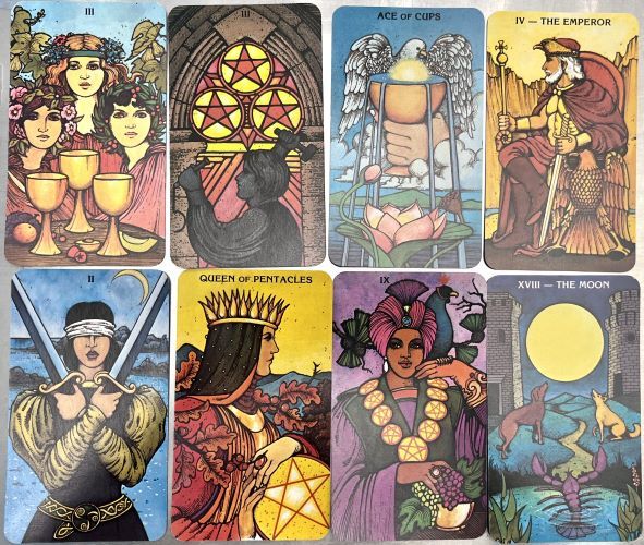 Stamford, CT: U.S. Games Systems, Inc, 1993. Near Fine. [12.5 x 7.5cm]. Complete 78 card tarot deck. With instructional booklet. All in an illustrated box, with light rubbing to extremities. Inspired by the classic Rider-Waite deck, these richly hued, borderless cards offer a close-up view of each subject, lending an intimate feel.