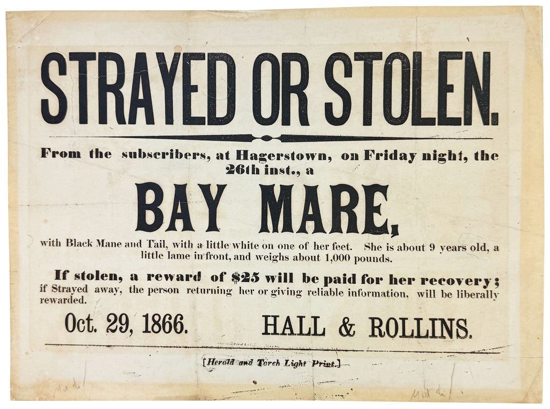 Unrecorded Reconstruction Era broadside dated Oct. 29, 1866, regarding a strayed or stolen bay mare "with Black mane and Tail, with a little white on one of her feet. She is about 9 years old, a little lame in front, and weighs about 1,000 pounds." The broadside promises $25 to whoever returns the mare if she has been stolen, and "if Strayed away, the person returning her or giving reliable information, will be liberally rewarded." Signed in text by Hall & Rollins, local businessmen and subscribers to the local newspaper the "Herald and Torch Light."