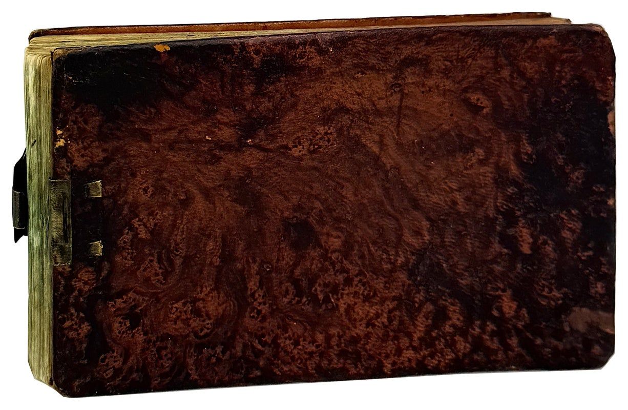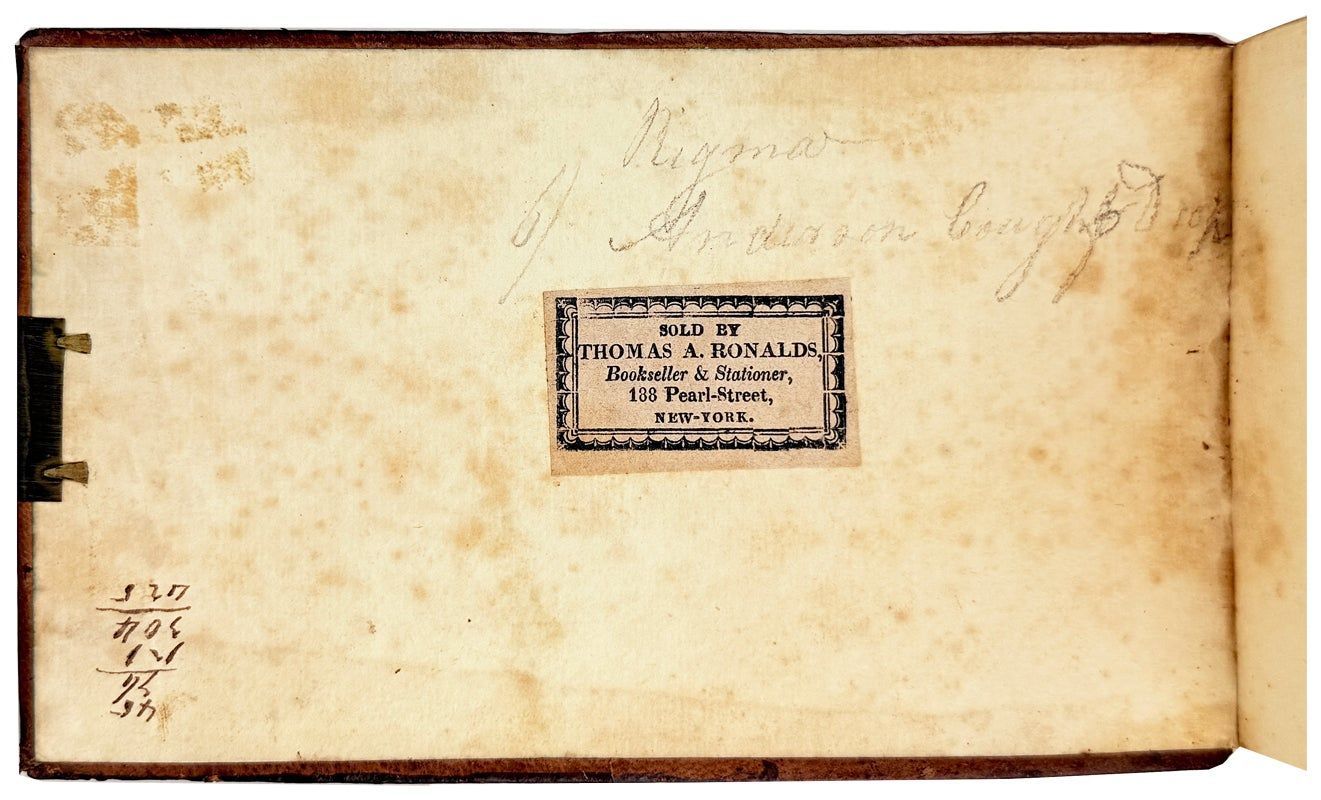 New York, 1815. Very Good. New York: 1815-1833. Small oblong octavo (10x17cm.); full contemporary flame calf, retaining original steel clasp; [75]ll. filled to completion. Joints cracked, original spine leather perished and replaced with later paper spine to match; Good to Very Good, contents clean and legible throughout. Binding retaining original stationer's ticket of Thomas A. Ronalds, Bookseller & Stationer, 188 Pearl-Street, New-York. Ticket surrounded by faint pencil ownership marking "Rigman [?] of Anderson Cough Drops."