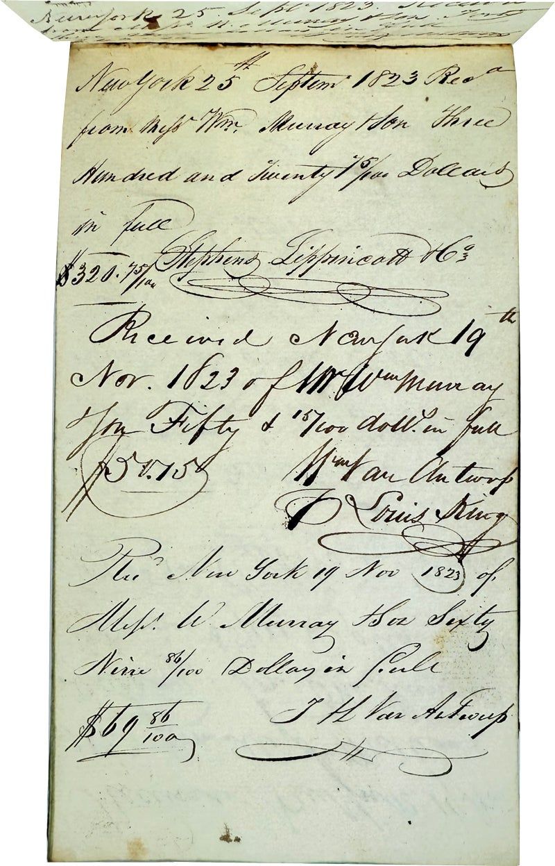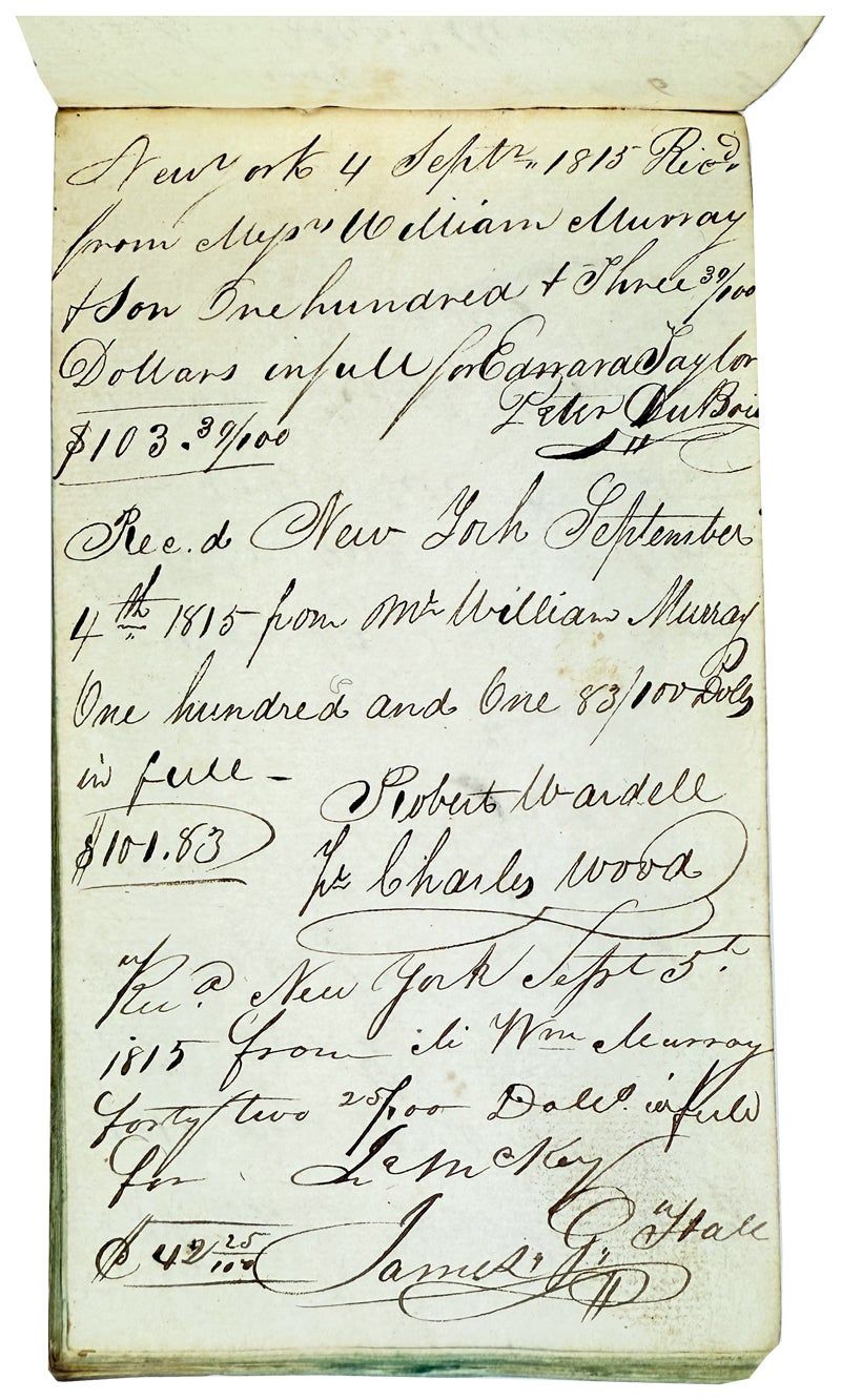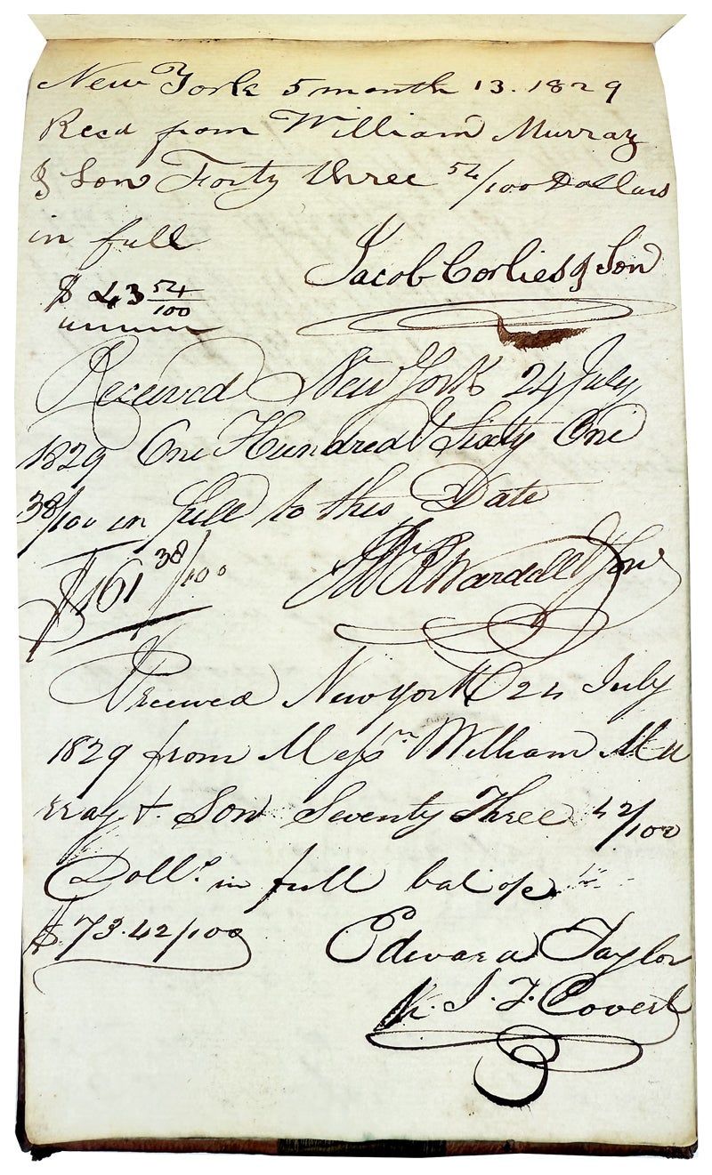 Complete record of transactions logged by a New York City wholesaler between 1815 and 1833 providing 376 individual entries, generally entered by the customer, providing the researcher with a rainbow of American penmanship samples. Most entries provide the date, the company or individual, and the dollar amount of the transaction. The same names and businesses occur throughout the volume, including merchants Van Winkle & Van Antwerp (36 entries) whose dissolution in the 1820s is reflected by the disappearance of their business name half-way through the volume. Another similar situation concerns local company Stephens & Lippincott (54 entries) who disappear from the record midway through as well. Very few goods are listed by name, though we caught sight of a bale of cloth returned and a hogshead of whiskey purchased. Presumably Anderson's cough drops, a popular treatment for colds and consumption in the 1820s and '30s, were also a commodity.
