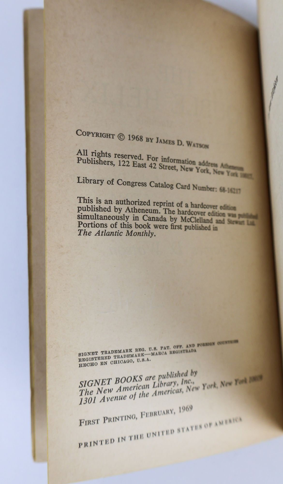 New York: Signet Books, 1969. First Paperback Edition, First Printing. Softcover. Small Octavo, 143 pages. In Very Good minus condition. Wear to covers. Slight water staining to top edge of text block. Age toning to edges of text block and interior pages. Signed by Watson on title page. DL Consignment. Shelved Case 10. 1396716. Shelved Dupont Bookstore.