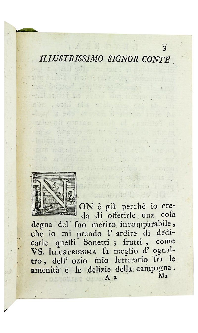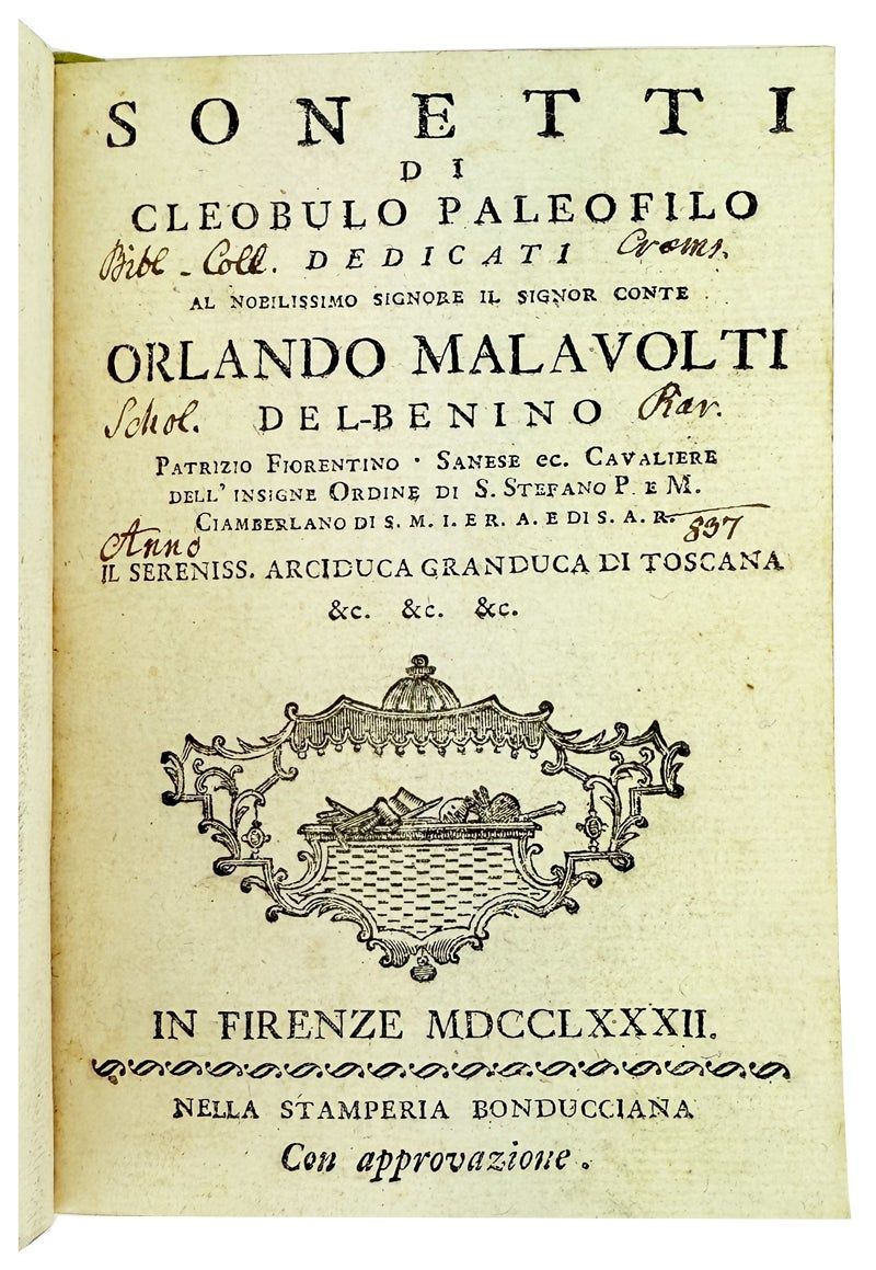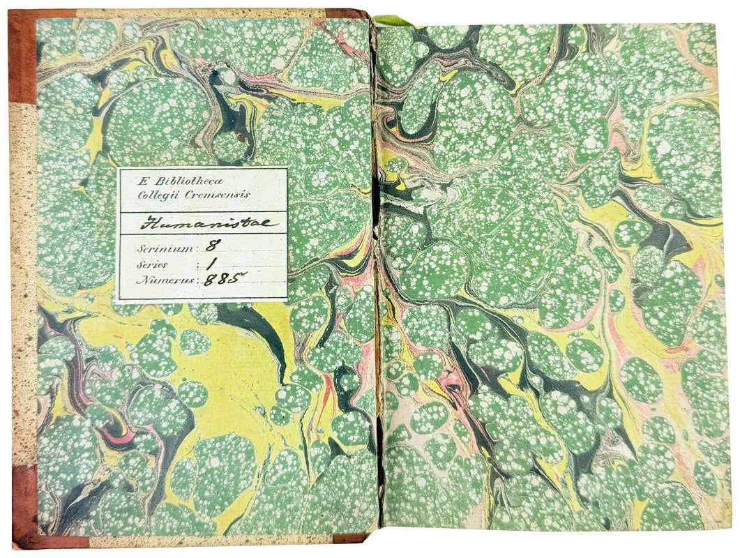 Firenze [Florence]: Nella Stamperia Bonducciana, 1782. Very Good. Firenze [Florence]: Nella Stamperia Bonducciana, 1782. First Edition. Small octavo; contemporary mottled calf over marbled paper-covered boards, green and white gilt spine labels, all edges speckled red, marbled endpapers; 378pp.; woodcut title page device, initials, head- and tail-pieces. Darkened spine leather dried and starting to crack along joints, exposure at corners, ex-Bibliotheca College Cremsensis with their 19th-century internal markings including ex libris to front pastedown; overall a Good to Very Good, internally fresh and sound copy.
