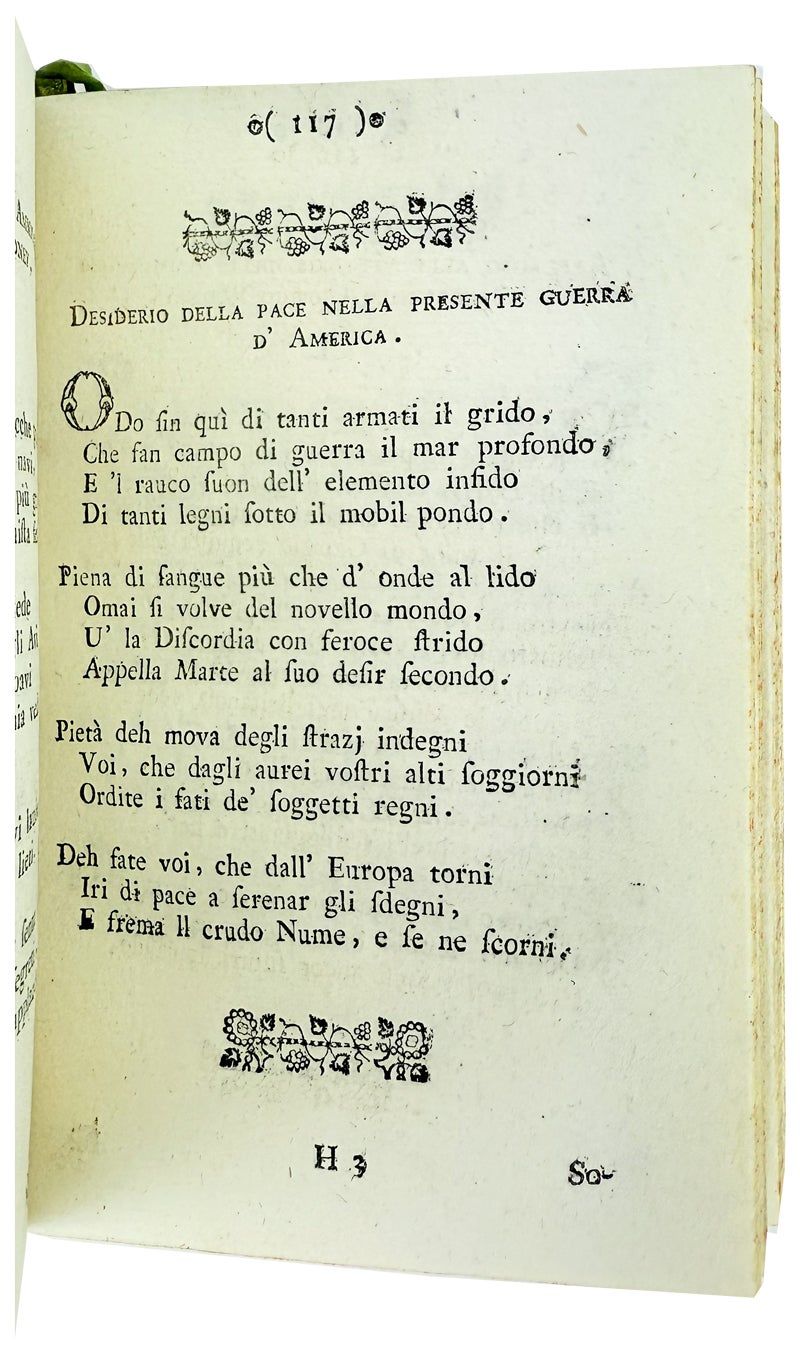 Poetry collection including several pieces relating to the ongoing Revolutionary War in the United States: "In Morte di Riccardo Montgomeri Generale degli Stati Uniti di America" (p. 99); "Al Famoso Paolo Jones [John Paul Jones]" (p. 101); "Pensieri di M. Linguet sopra le Colonie Americane" (p. 110); and "Desiderio della Pace Nella Presente Guerra d'America" (p. 117).