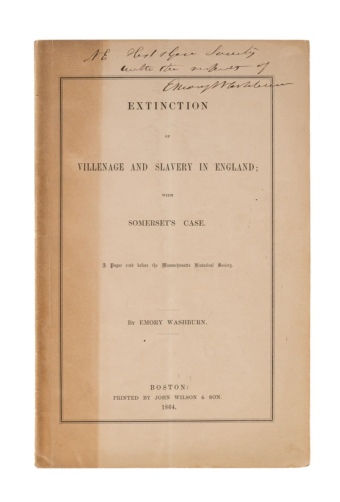 1864. Washburn, Emory, [1800-1877]. Extinction of Villenage and Slavery in England: With Somerset's Case: A Paper Read Before the Massachusetts Historical Society. Boston: John Wilson & Son, 1864. 21 pp. Printed wrappers. Moderately worn and soiled with fading to front cover. Author's presentation inscription "[NE Hist & Gene Society]/ with the respect of/ Emory Washburn" to cover. Internally clean. $125. * Provides a historical analysis of the end of servitude in England, from the medieval system of villenage to the later institution of slavery. Based on a presentation Washburn delivered to the Massachusetts Historical Society, the paper examines: The historical arc of servitude tracing how villenage, a type of feudal servitude, died out in England and how a new form of slavery later arose, particularly involving people from Africa. The Somerset case: The paper focuses on the landmark 1772 English court decision, Somerset v. Stewart. In this case, Lord Mansfield ruled that a slave could not be forcibly removed from England and sold in the colonies. Abolitionist legal theory: Washburn's work argues that the English common law was inherently hostile to the concept of slavery and that no formal statute ever needed to be passed to abolish it within England itself. As a Massachusetts lawyer and former governor, Emory Washburn [1800-1877], was writing during the American Civil War. He used the English experience to frame and complement discussions in Massachusetts about the end of slavery in his own state.