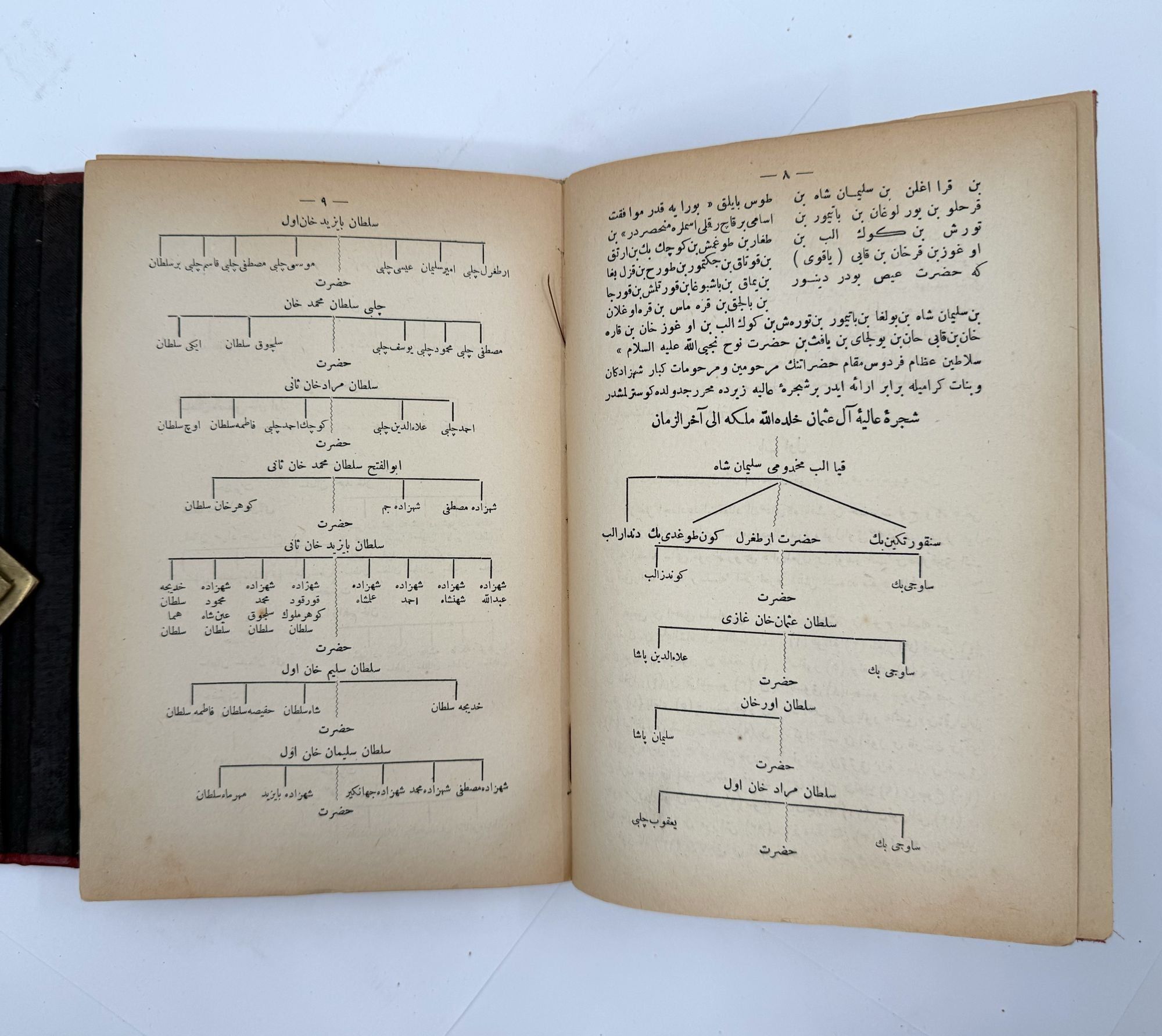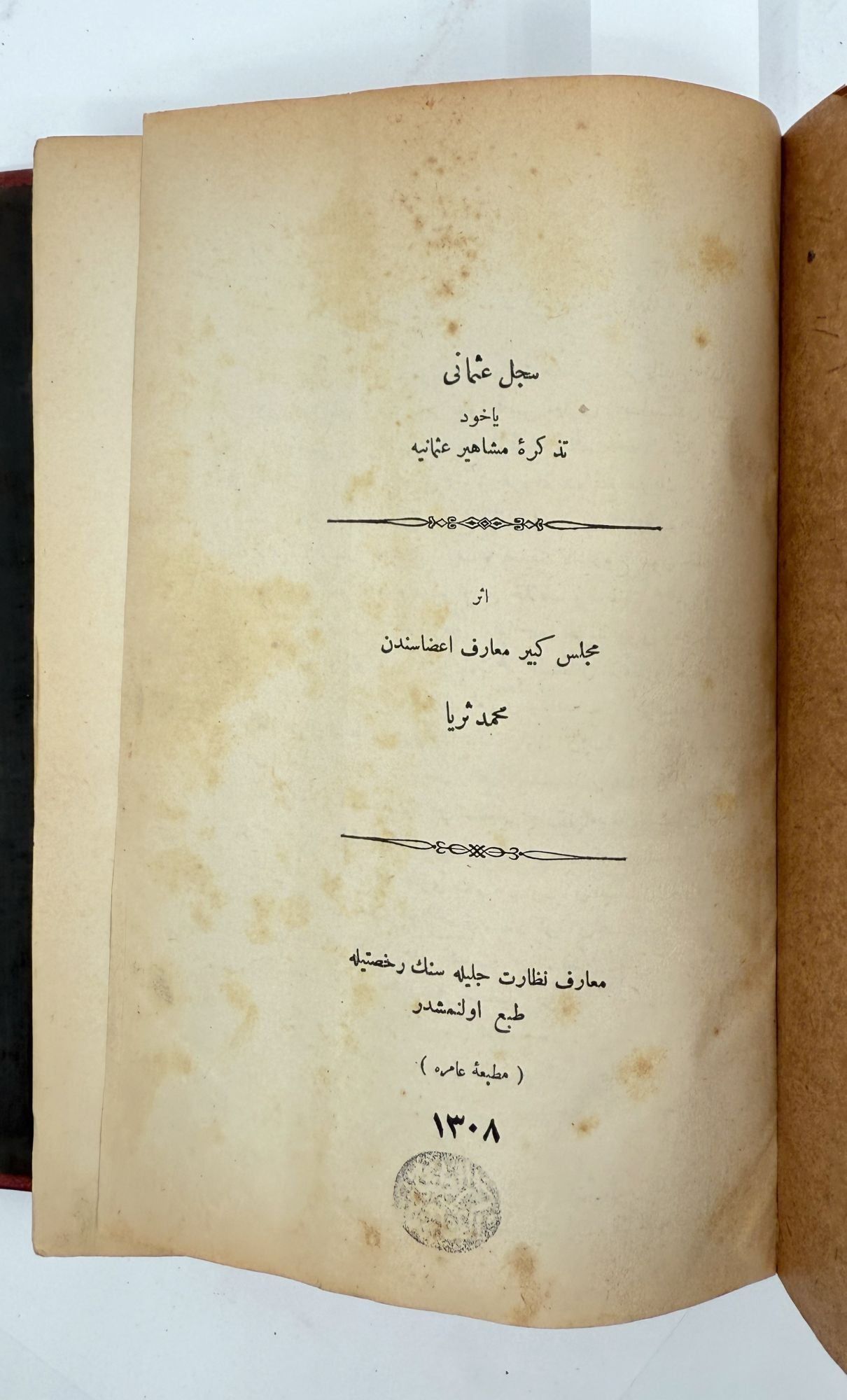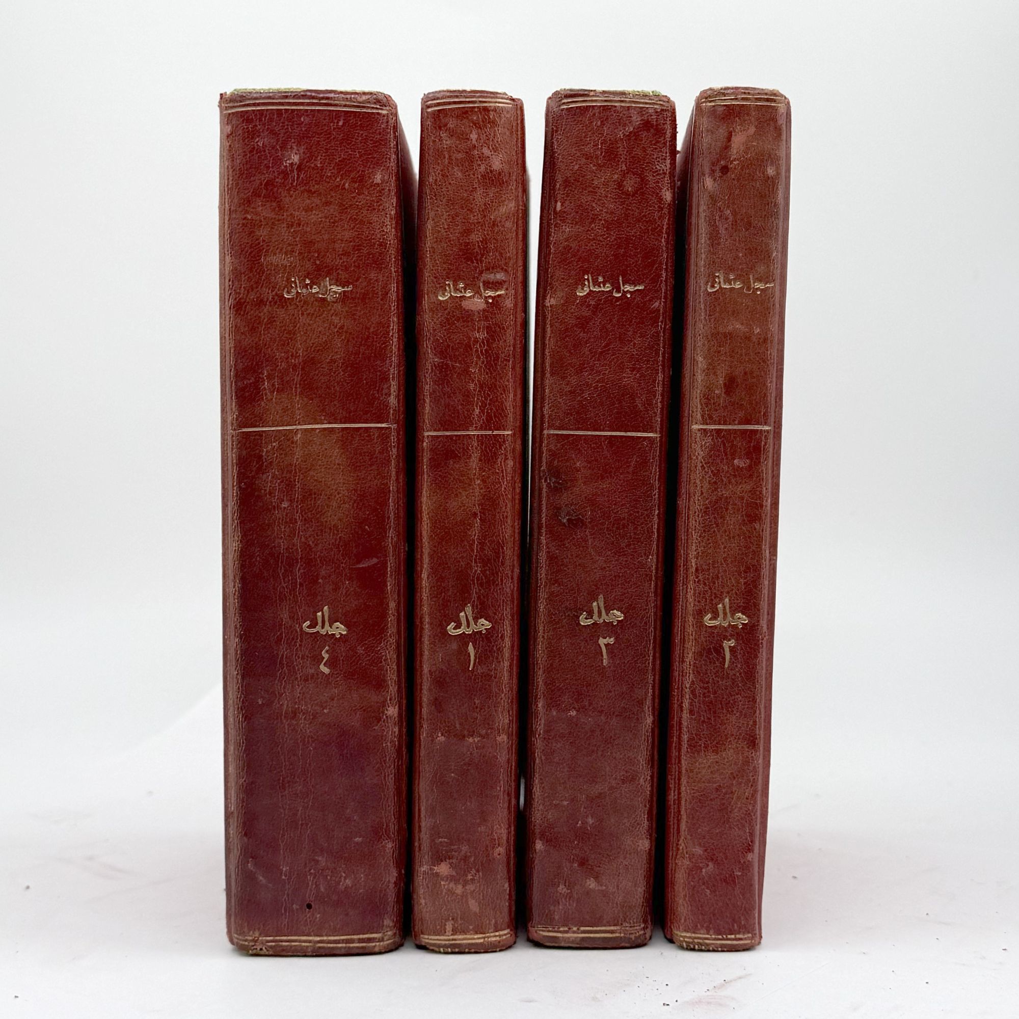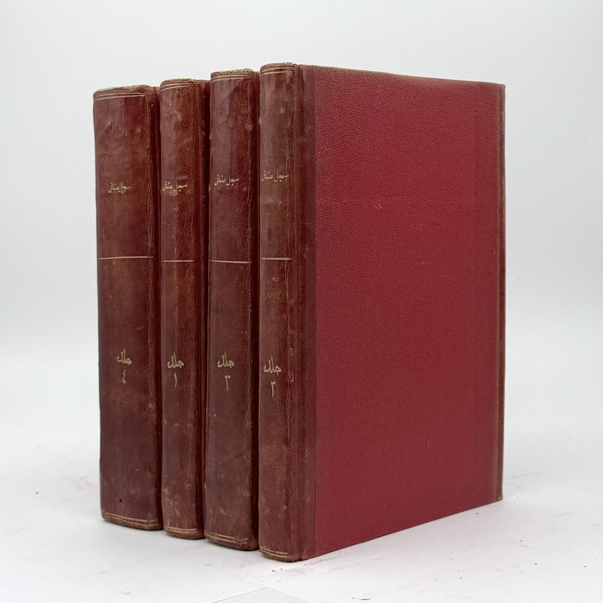 Istanbul, 1893. 451; 442; 62; 906 pp. 4 vols. 8vo. Original wallet-style binding of red leather spine, titled in gilt, cloth sides, red leather fore edge guards. Spines faded. Very good plus condition. 451; 442; 62; 906 pp. 4 vols. 8vo. Mehmed Süreyya (d. 1909), Ottoman official and renowned biographer, dedicated his life to documenting prominent figures of the Ottoman Empire. His magnum opus, Sicill-i Osmânî, is a monumental biographical dictionary covering over 20,000 entries, including Ottoman dynasty members, statesmen, scholars, artists, and more. Published in four volumes between 1890 and 1893, the work remains a cornerstone of Ottoman historiography.