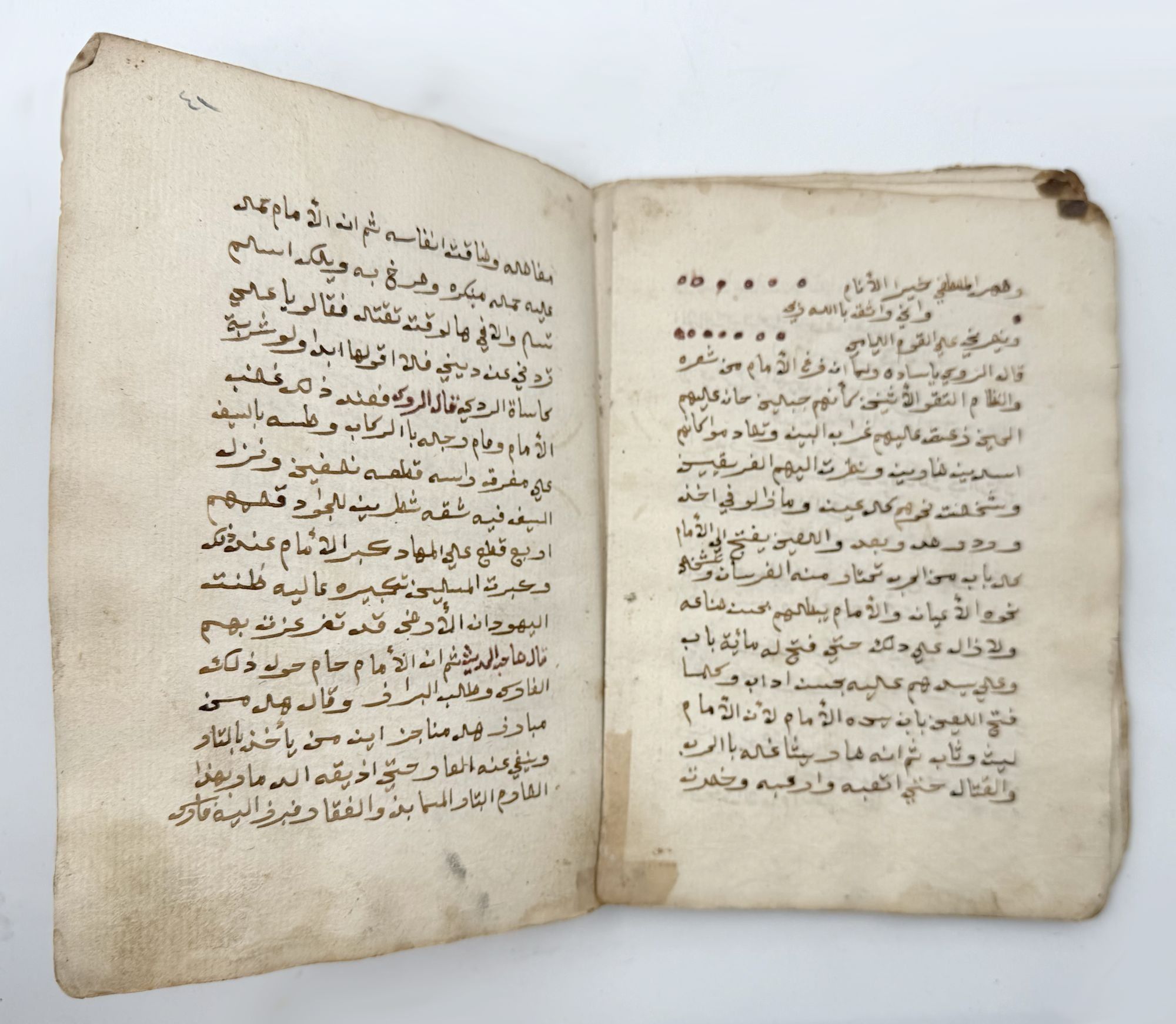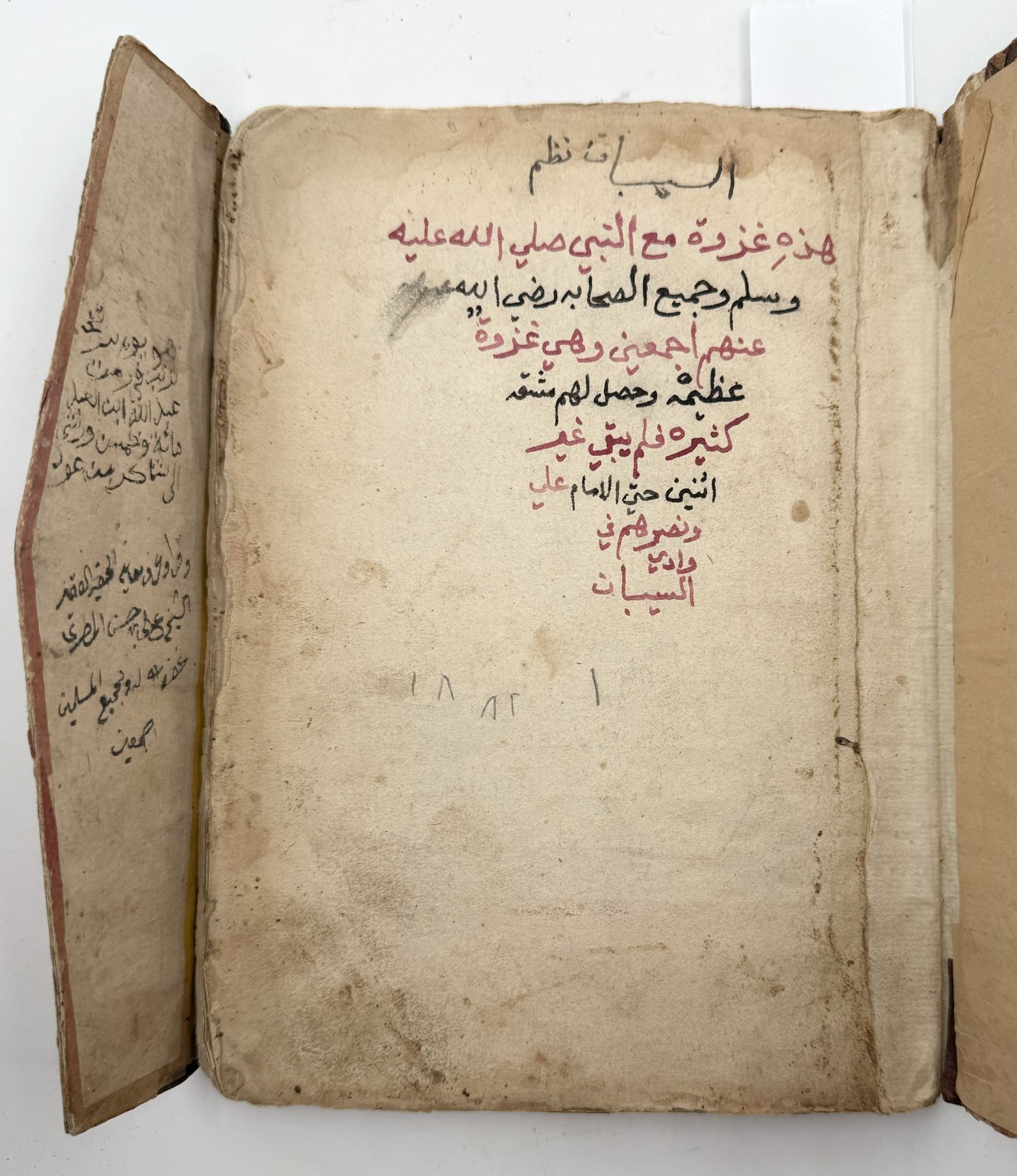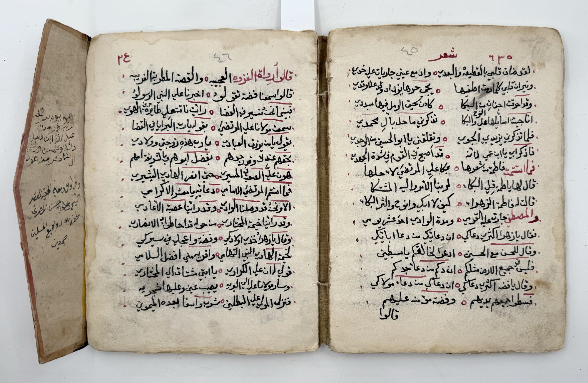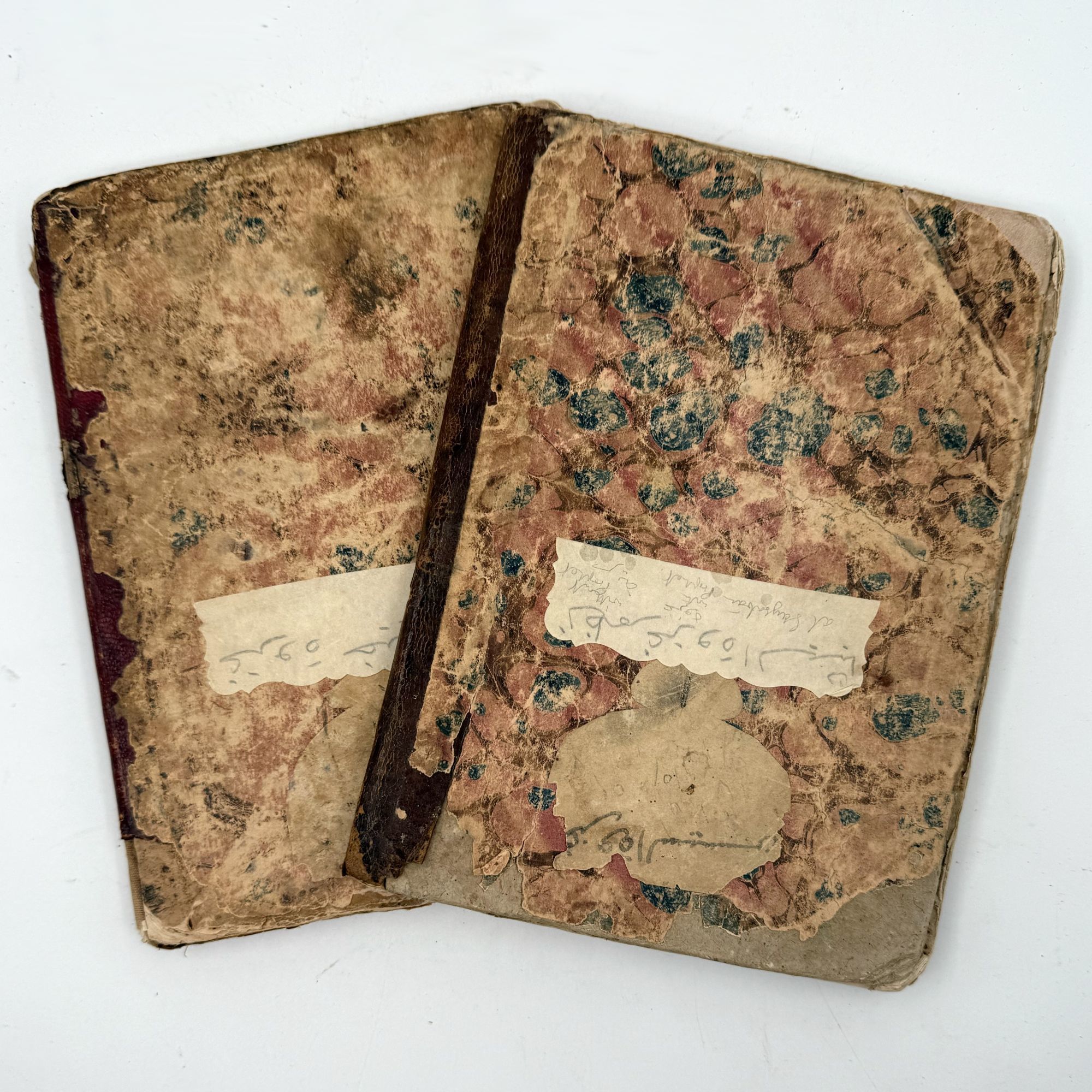1775. Ink on paper, 15 lines per page. Second work with outlining and headers in red.. 92; 61 pp. 2 vols. 6-1/2 x 8-1/2 inches. Old leather backed boards, marbled sides, later paper labels. Vernacular repairs, various ownership inscriptions. A bit rough and edgeworn, some leaves loosened. Very good. Ink on paper, 15 lines per page. Second work with outlining and headers in red.. 92; 61 pp. 2 vols. 6-1/2 x 8-1/2 inches. A rare example of 18th-century epic poetry, documenting the legendary battles of ‘Ali ibn Abi Talib, the fourth Caliph and central to Islamic history and Shiite mythology. The first volume, Ghazwah Khaybar recounts Ali’s heroism in the conquest of Khaybar (628 C.E.), a pivotal battle that solidified his reputation as Islam’s warrior par excellence (92 pp., dated at end A.H. 1189 = 1775 C.E., with an inscription indicating that the work was authored and owned by Shaykh Muhammed Baytar). The second volume, Ghazwah al-Shaybân (61 pp., undated), narrates the struggle between Arab tribes and the Shayban clan’s allegiance to ‘Ali. Both texts, likely copied by the same scribe, are early written records of oral heroic traditions that had circulated for centuries.