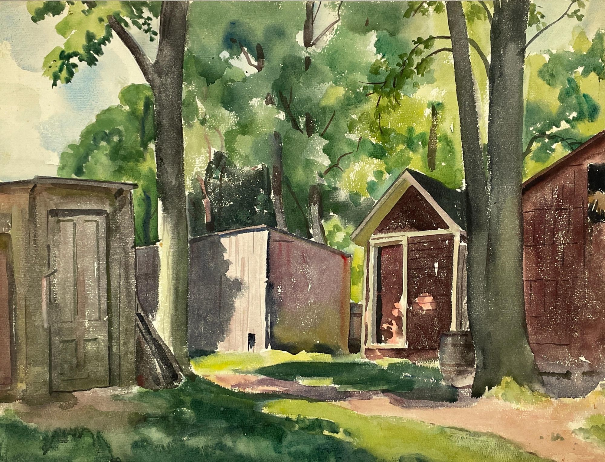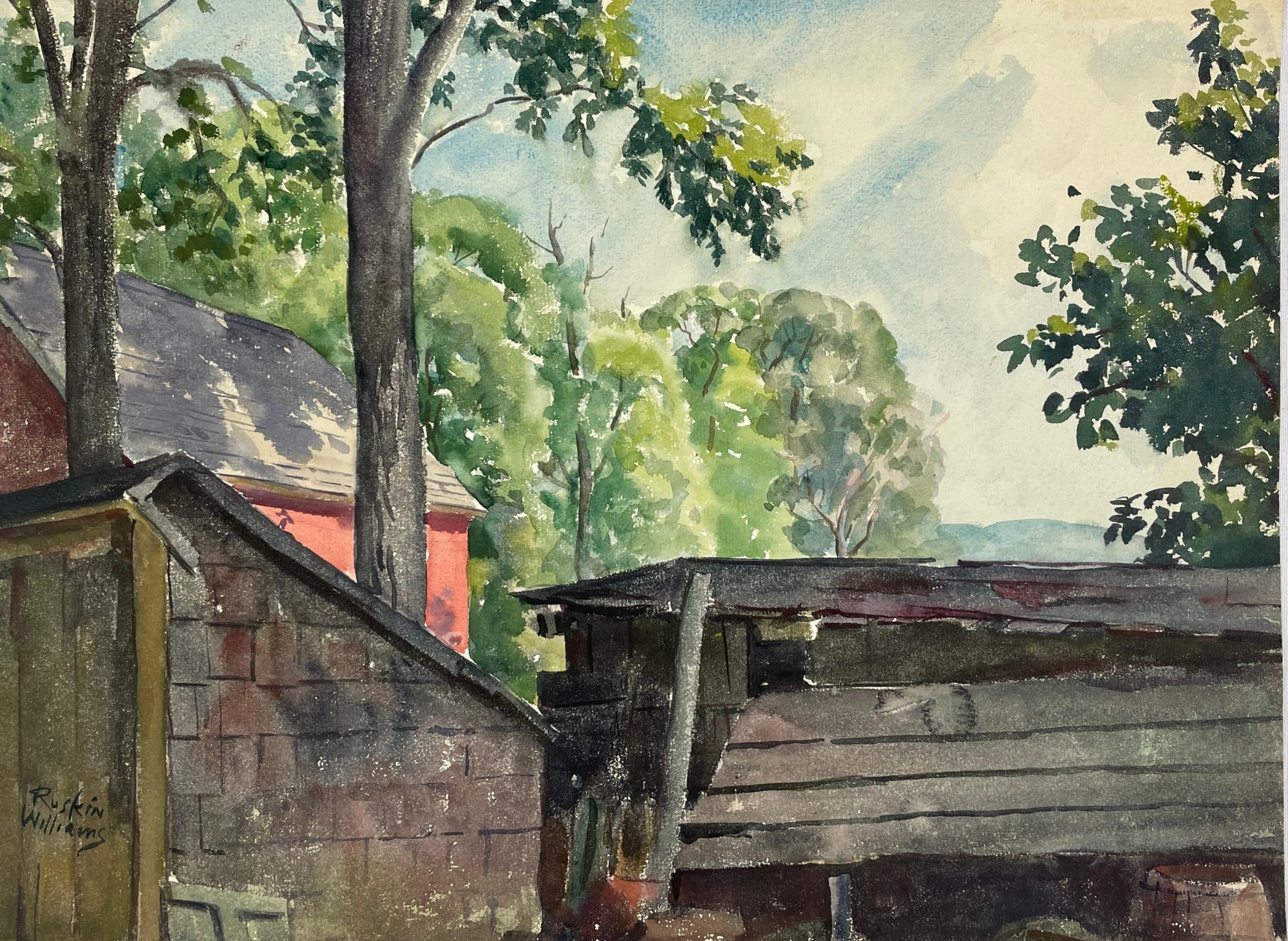 A lot of three watercolors by Ruskin Williams. "Waterfall" signed "Russ Williams" at lower left, and "Rural Rooflines" signed "Ruskin Williams" at lower left. "Sheds" is unsigned. In Very Good minus condition. Some rubbing and wear to lower corners of Waterfall. Measurements: Sheds: w 19 in x h 14.5 in. Rural Rooflines: w 19 in x h 14 in. Waterfall: w 19.5 in x h 14.25 in. RW Consignment. Shelved in Room G. 1396799. Special Collections.