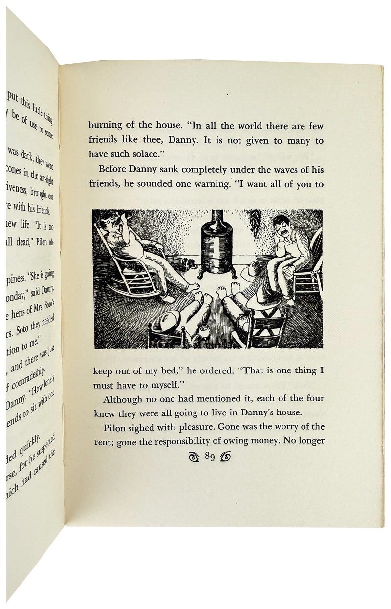 New York: Covici Friede Publishers, 1935. Very Good/Very Good. New York: Covici Friede Publishers, 1935. First Edition, one of 500 copies in printed wrappers. Octavo; publisher's pictorial card wrappers illustrated by Ruth Gannett, French flaps retaining original price ($2.50); [viii],9-317pp.; illus. throughout. Rubbing to edges with a few minor nicks and creases; spine sunned but still retaining some color; 2" split at base of upper spine edge. Binding sound and pages unmarked. A Very Good, well-preserved copy of an important Steinbeck title, following Danny and his knights of the round table as they drink, sing, and brawl their way through the worst years of the Depression around Monterrey, California. Adorned with atmospheric illustrations by Ruth Gannett, the genius author-illustrator of the children's series My Father's Dragon (1948).