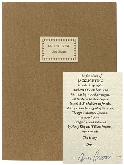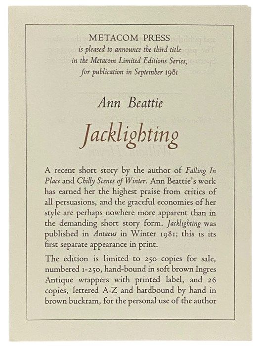 Worcester, Massachusetts: Metacom Press, 1981. Limited Edition. Soft Cover. Near Fine. 0x0x0. Signed by author. Signed by author without inscription. #34 of 250. Prospectus laid in. Near fine. 1981 Soft Cover. 20 pp. "Nicholas has died sometime during the past year from injuries incurred while he was taking a midnight ride on his Harley and a drunk, driving a van, hit him head-on. Last year, on his birthday, he was alive but in the hospital, brain-damaged from the accident. This year, on his birthday, he is dead, and the narrator and her boyfriend, Wynn, both of whom used to drive from New York to Virginia to spend Nicholas's birthday with him, have come instead to visit Nicholas's brother, Spence, who now lives alone in the house that the brothers once shared. The first half of the story takes place on the day before the anniversary of Nicholas's birthday. It is August and hot, but Spence makes jam so the narrator and Wynn can take some back with them to New York. He stays in the kitchen cooking because he does not want to talk with them. Spence's girlfriend, Pammy, sleeps upstairs with a small fan blowing on her. She is a medical student at Georgetown and has just arrived in Virginia after finishing summer school. Wynn stands in the field across from the house, pacing with his head down. At thirty-one, he thinks that he is in love with one of his students and is going through a mid-life crisis. The narrator watches Wynn from the house as he swings a broken branch and bats hickory nuts in the field. When Spence walks through the living room, he comments on Wynn's foolishness and on Wynn's September birthday, of which he wants to be reminded. The narrator tells Spence that last year she gave Wynn a Red Sox cap for his birthday. When Nicholas was hit by the van, he, presumably, was not wearing his helmet because he had established in it a nest of treasures - dried chrysanthemums, half of a robin's blue shell, a cat's-eye marble, yellow twine, a sprig of grapes, a piece of a broken ruler - while baby-sitting the neighbors' four-year-old daughter." Keywords: ANN BEATTIE AMERICAN LITERATURE JACKLIGHTING SHORT STORIES CONTEMPORARY FICTION