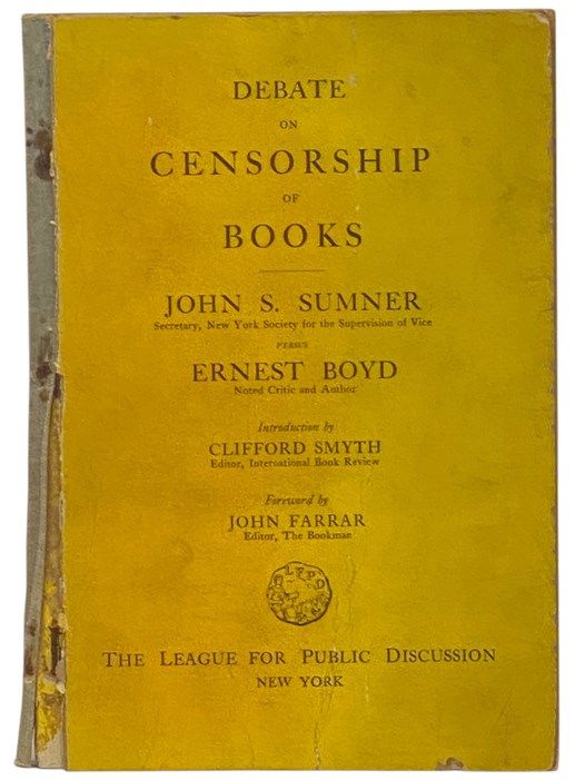 New York: The League for Public Discuisson [sic], New York [Discussion], 1924. Trade Paperback. Fair. A few creases on front cover, front wrapper loose and slightly discolored, rear hinge loosening, though it appears never to have been properly attached (staples did not continue through to the rear of the spine cloth). 1924 Trade Paperback. 77, [3] pp. Review copy, with publisher's slip tipped in on title page. Stiff cardstock boards with cloth spine, stapled binding. A publication of a debate pitting a critic and author against the secretary for the New York Society for the Supervision of Vice, with an introduction by the editor of the International Book Review, and a foreword by the editor of The Bookman.