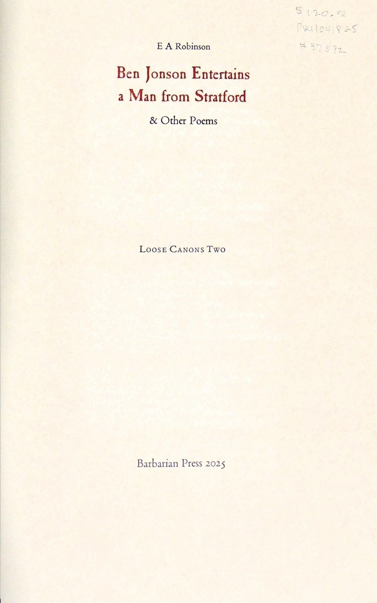 Mission, British Columbia: Barbarian Press, 2025. Softcover. Fine. Softcover. One of 120 copies Writes the press: Two of our Loose Canons pamphlets featuring neglected poets will be published in 2025: the first, a second edition of the poetry of Elinor Wylie from our earlier version of Loose Canons One, is expanded from 6 poems to 18; Loose Canons Two features poems by Edwin Arlington Robinson, with a focus on his long dramatic monologue ‘Ben Jonson Entertains a Man from Stratford’. This revival of the Loose Canons series is devoted to refreshng the reputations of once celebrated poets and poems that over time have become blurred by distance, overlooked, or simply ignored.As will be the case with later additions to the series, each of these issues is intended to give a concise overview of the style and concerns of the poet in question. All the pamphlets will be hand-set in various types from the best editions of the texts, and each will offer a brief biographical note with other information as necessary. They will be sewn into a variety of cover papers and will be of a uniform size. The Loose Canons series will continue intermittently, but dependably. We intend them to provide a mix of writers in English from England, Canada, and America, and we may possibly introduce some translations from other languages as the series gather strength.