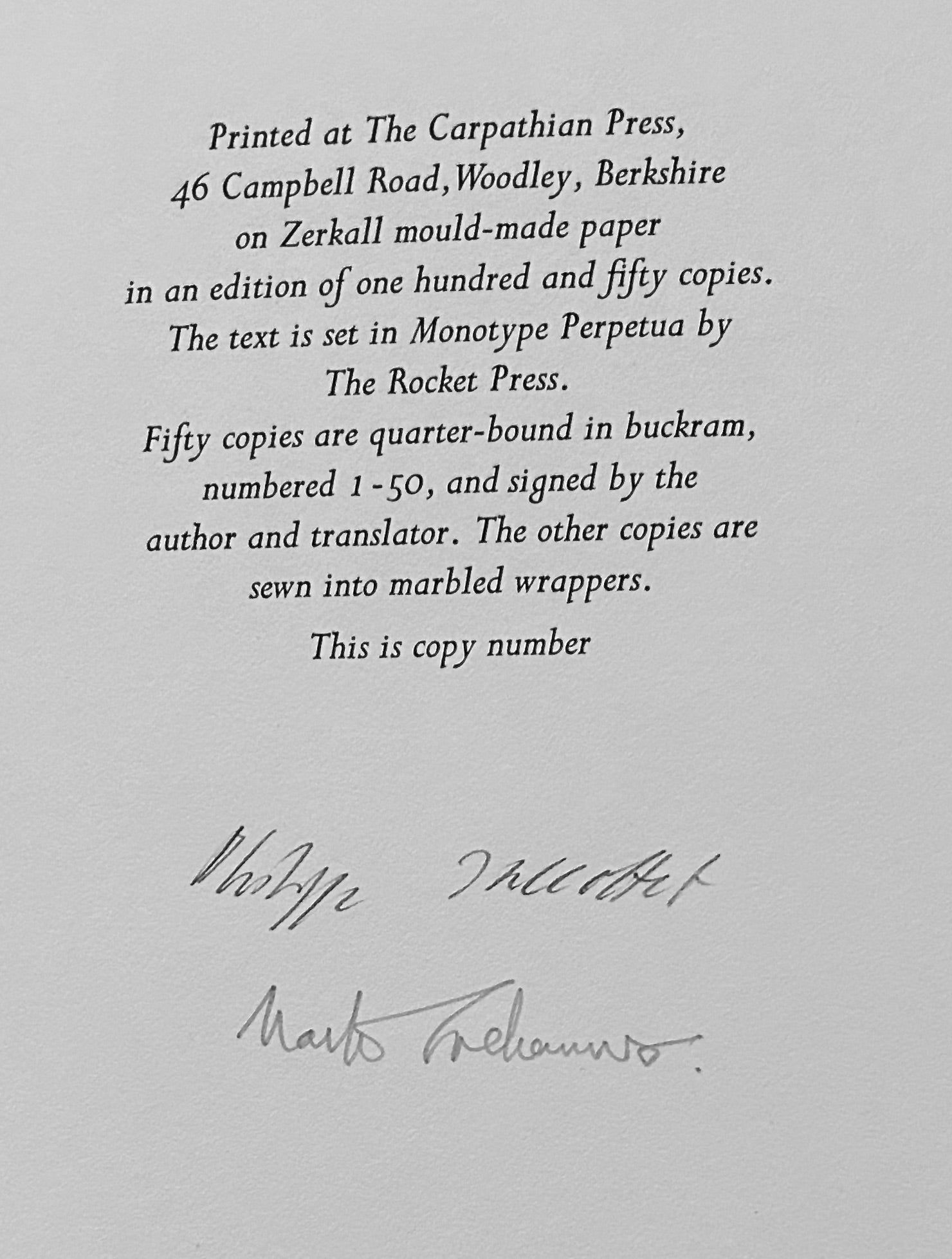 Birmingham: The Delos Press, 1991. Hardcover. Orig. quarter navy cloth and marbled boards, front cover and spine paper labels. Fine in fine slipcase. 14 pages. 27 x 20 cm. Limited edition 1 of 50 and signed by the author and translator on colophon page, not numbered. Printed on Zerkall mould made paper. Title page printed in red and black. Jaccottet, Swiss born was one of the most prominent figures of the immediate post-war generation of French poets.