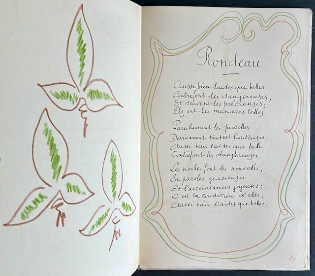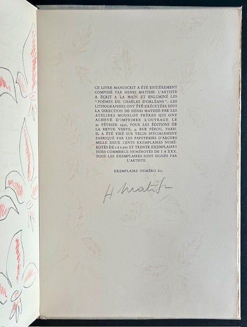 Paris: Teriade Editeur, 1950. Original wraps. Near Fine/Near Fine. Henri Matisse. Lovely 1950 collection of Henri Matisse's lithographed color pages, playfully rendered in soft blues and greens and oranges. #605 OF 1,200 COPIES SIGNED BY MATISSE at the limitation. A very sharp copy to boot, sparkling in the publisher's glassine jacket. Folio, signatures loose, as issued. The lithographs were executed under the direction of Matisse by Les Ateliers Mourlot Freres.