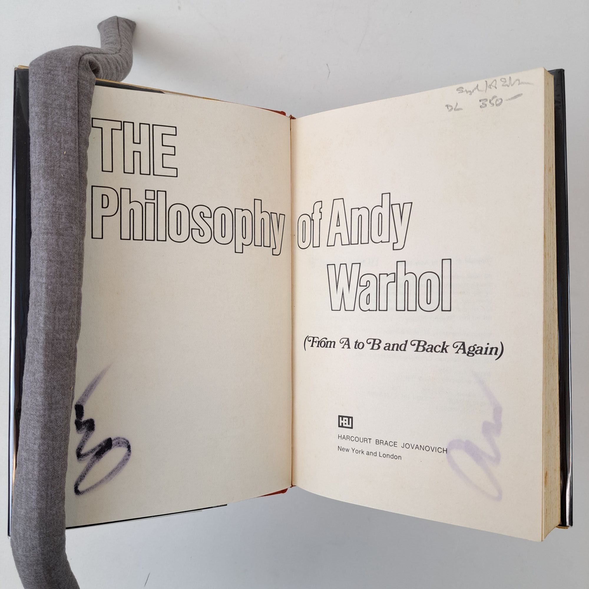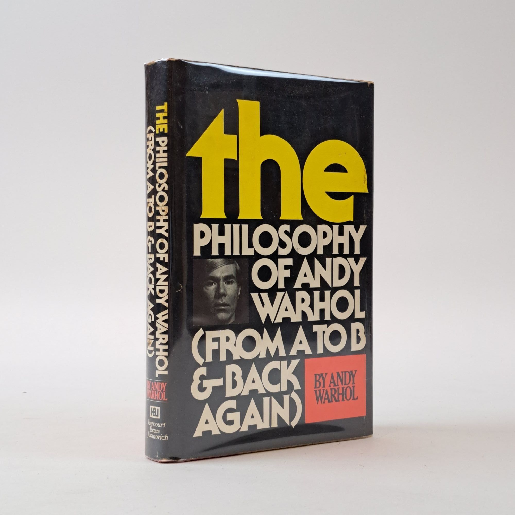 New York, New York and London, UK: Harcourt, Brace, Jovanovich, 1975. First Edition, Second Printing. Hardcover. Octavo, 241 pages. In Very Good minus condition with Very Good minus condition dust jacket. Spine is black with yellow, white, and red lettering. Dust jacket protected by mylar covering, price cut, has mild general scuffing and soiling, mild shelving wear along head edges, mild surface tearing along spine tail and front tail joint, and a ~4.25in. long hairline closed cut along fore edge of front cover. Boards have mild shelving wear along extremities, mild age toning and soiling along tail edges, rubbing wear to tail fore corners, and moderate soiling and age-toning along head edge; spine mildly cocked. Text block has mild foxing along edges, mild dust burning along head edge, and faint brown staining along tail edge; moderate signature bleedthrough on title page. Inscribed "For Betty, With Love, Gloria 1977" on half-title page head edge by previous owners. Signed flat by Andy Warhol on half-title page. DL Consignment. Shelved Room C. 1397019. Special Collections.