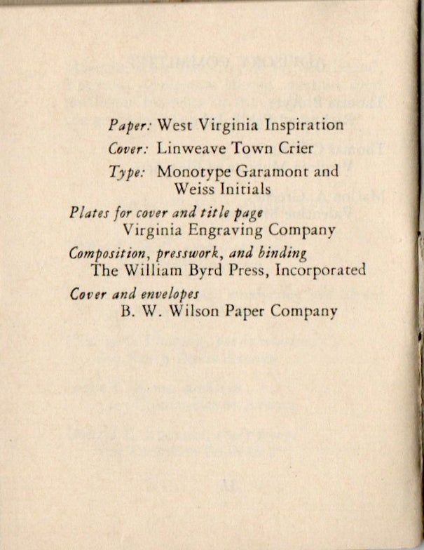 Richmond, VA, 1941. 3” x 2 ½” pamphlet dated March 14, 1941. The fourth volume of miscellaneous notes covering the first 6 meetings held by the new Richmond club, as well as a concise review of their future hopes and plans. The Executive Committee of the club comprised Willis A. Shell, General Chairman, Martin James Barbie, Charles C. Fleming, Leslie L. Jones, and Donald E. Rheutan. Thomas P. Ayer, Thomas C. Colt, and Marion A. Green formed the Advisory Committee. Membership applications were to be sent to Valentine museum. ~~Shell was an illustrator and printer who founded the Attic Press with his wife, and worked at the William Byrd Press for decades. Colt was the first Director of the Virginia Museum of Fine Arts, from 1935-1948. ~~32 pages, bound with 1 staple. Grey cover w/ red stripe. Nibbled at bottom edge, loss to bottom spine corner. ~.