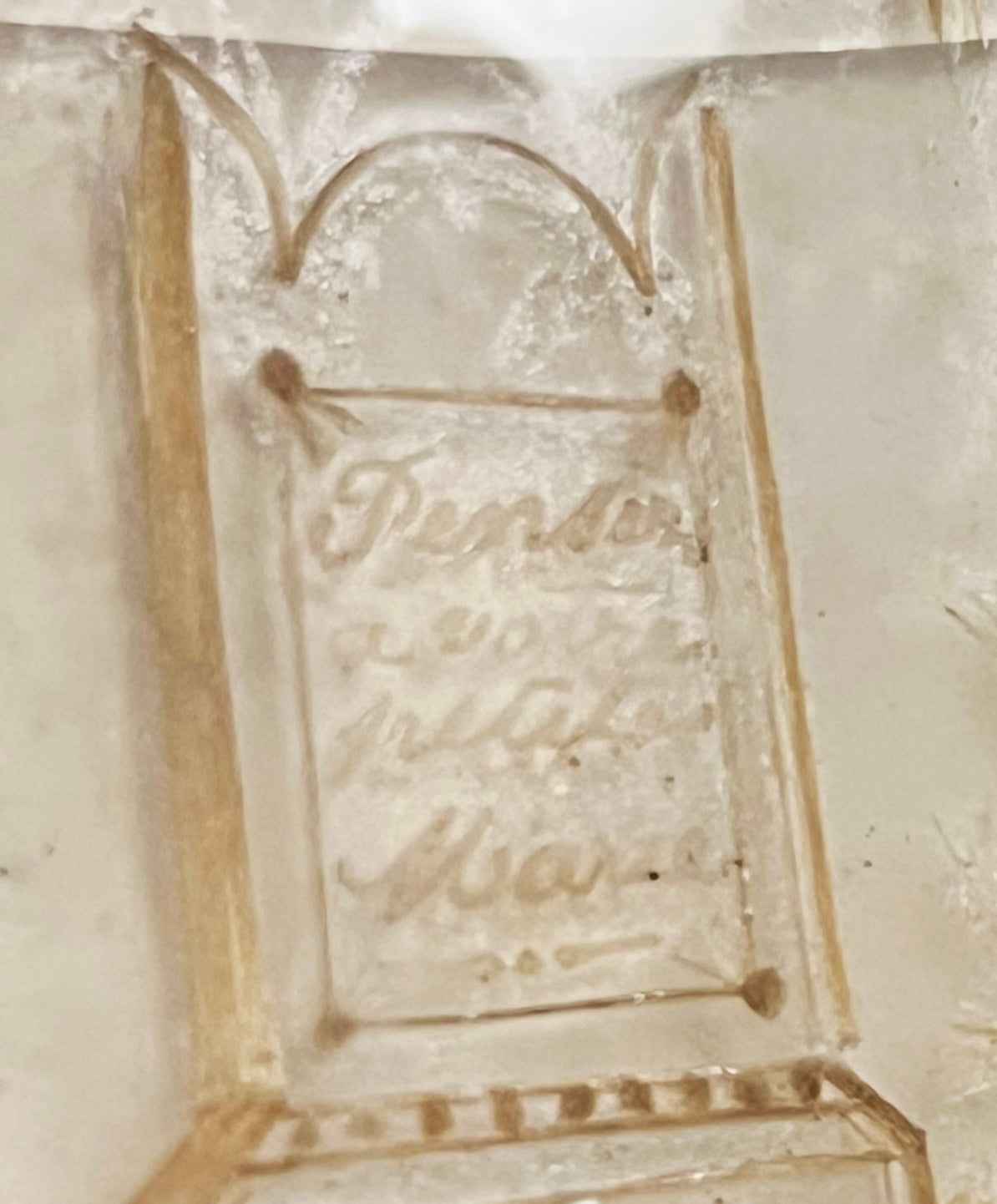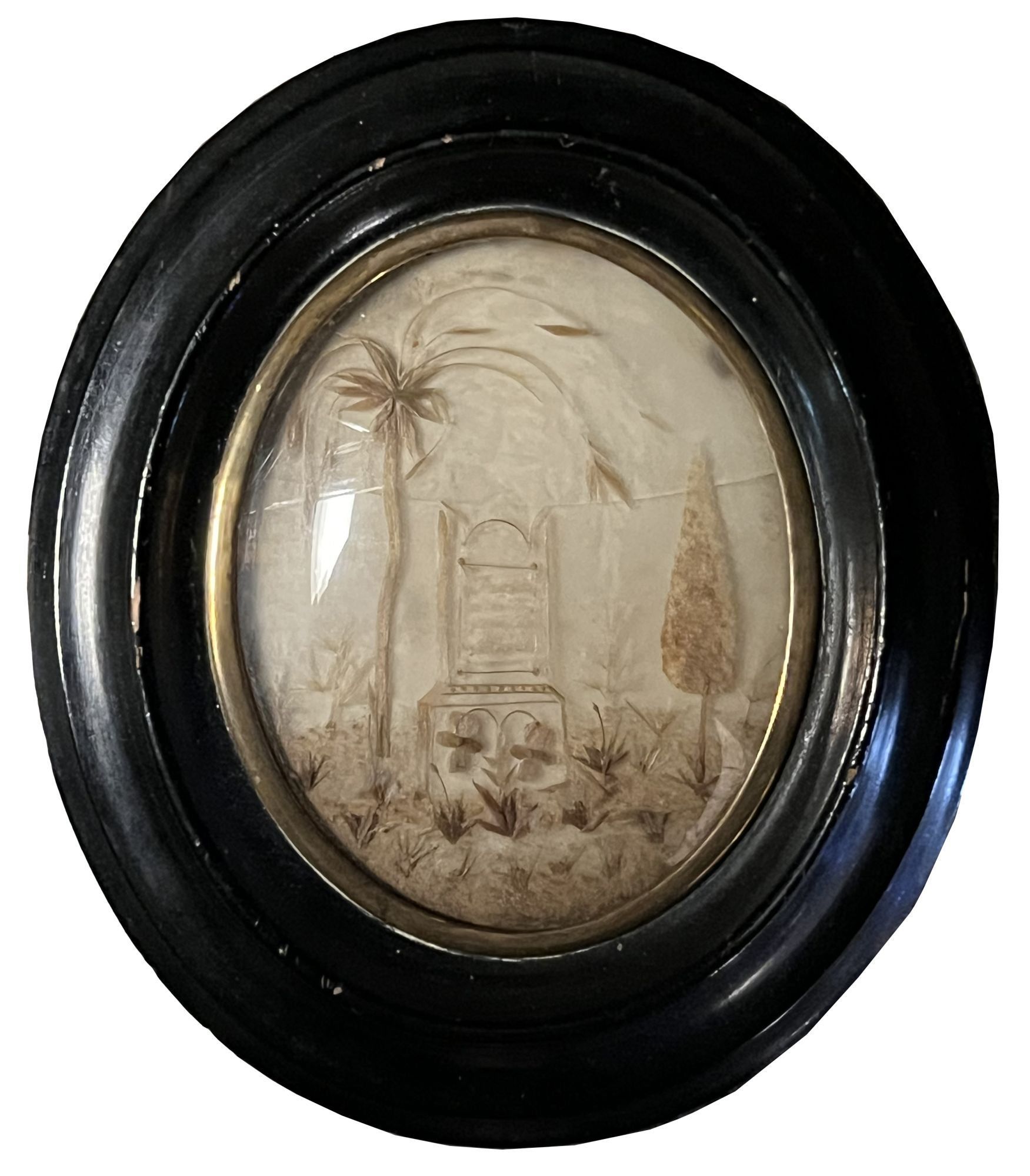 France, 1840. Single horizontal hairline crack in under glass. Wear to frame.. A scene depicting a headstone beneath a weeping tree. It is captions "penser a votre petite Marie" (thinking of your little Marie). grass and flowers at the base and a conifer nearby. All created with wispy snippets of hair. Delicate fine work. Housed in an oval frame with convex glass. Sight view 4.5" by 3.5". Frame 7" by 6