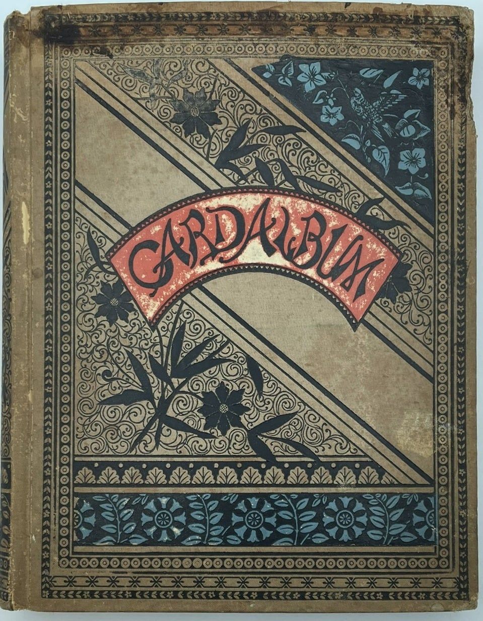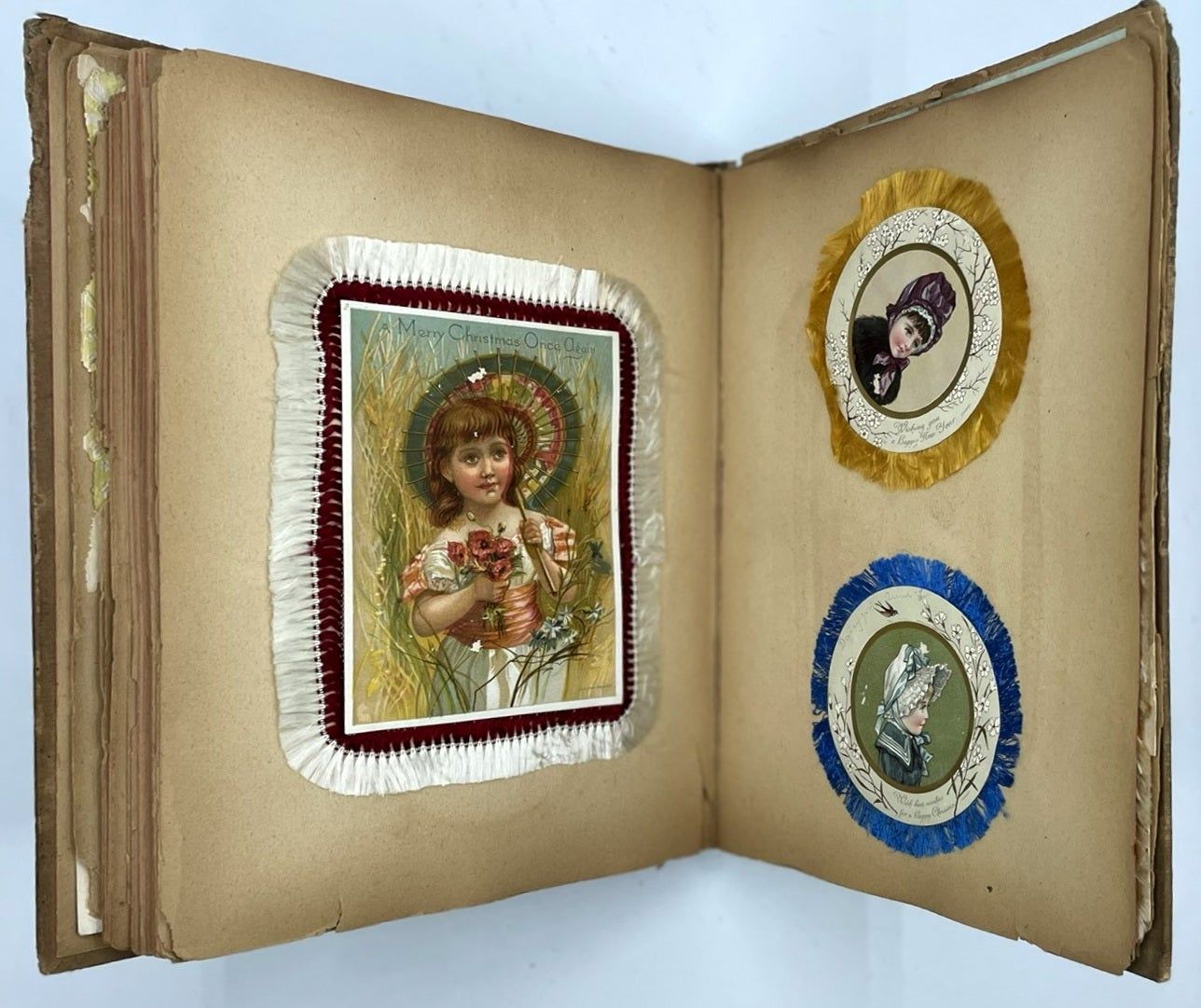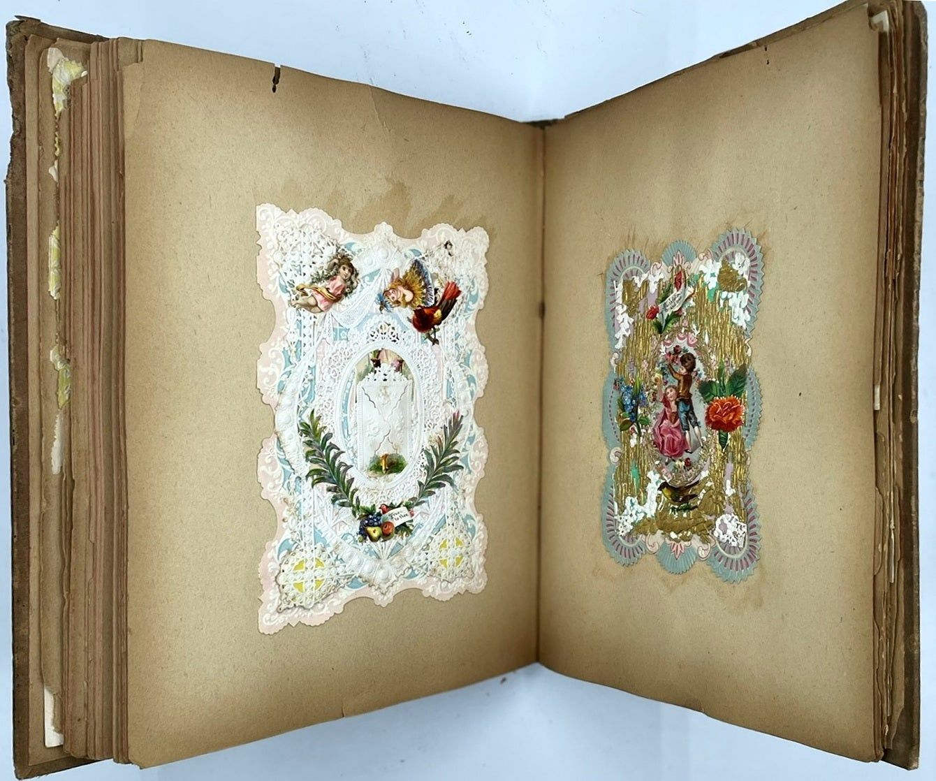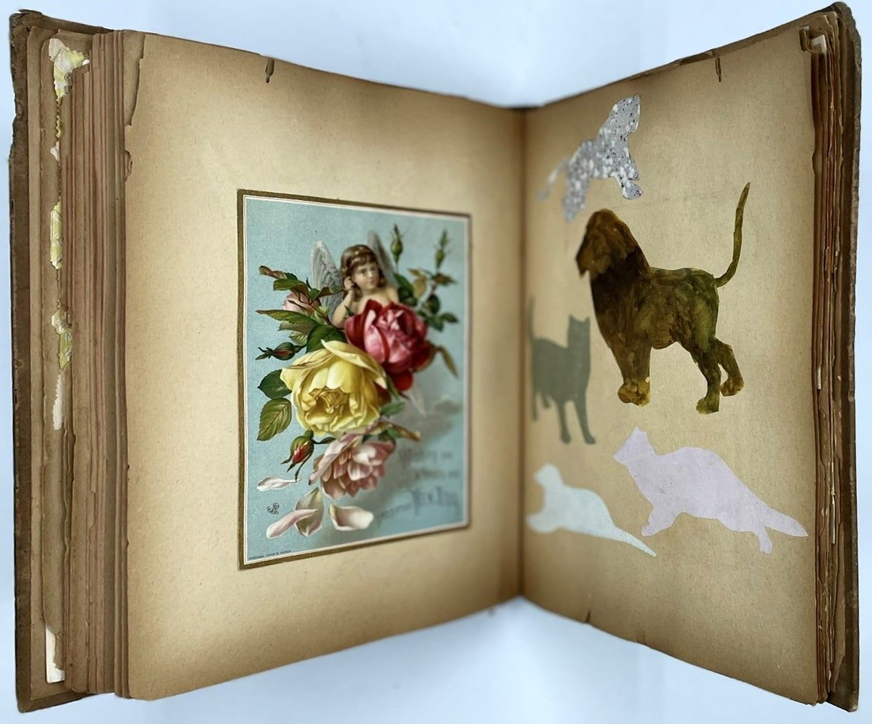 1880. Back strip detached from body of book. Browned pages - brittle with some edge chips.. If you are looking for an all inclusive Victorian scrap album, this album may fit the bill. It includes valentines, a reward of merit, a punch paper ABC cross-stitch, a pencil drawing of the state of Massachusetts complete with major cities, silk fringed greeting cards, two (2) hand made valentines, four (4) printed Greenaway prints that have been painted in watercolor by the child, greeting cards, album cards and miniature scraps throughout to decorate most pages. What makes this particularly interesting is the include of hand crafted Froebel's Kindergarten Art. There are 48 specimens interspersed throughout the album. They include both simple and complex paper weavings, folded paper cutouts, sewing cards, folded paper, nature drawings, pin prick and animal silhouettes. Over 125 items included in the album. Twenty-eight leaves/56 pages. Housed in a stamped Victorian album titled "Card Album"..