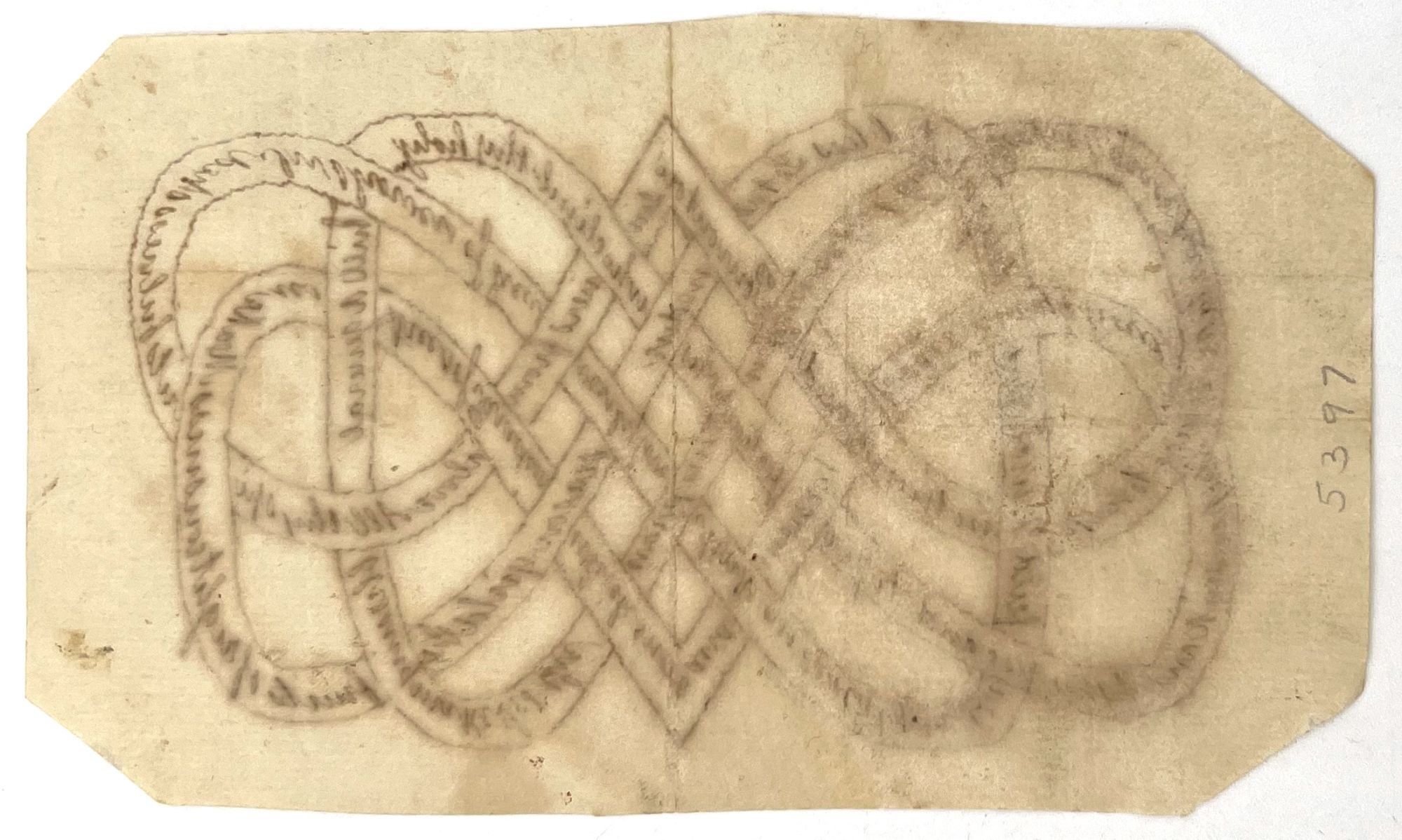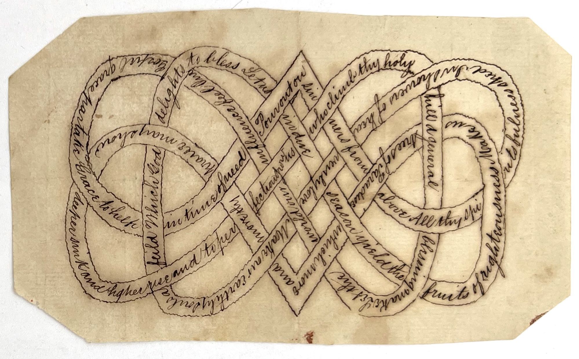 United States, 1850. Good. Light toning/dust soiling.. A clever love knot, made from interlocking ribbons of text. To read the message, the reader must turn the paper continuously. The message reads: "Make our earthly souls a field which God delights to bless Let us [?] season yield the fruits of righteousness Make us trees of Paradise which more and more thy praise may show deeper sink and higher rise and to perfection grow us who climb thy holy hill a general blessing makest the world our influence feel One Gospel grace partake Grace to help in time of need Pour out on sinners from above All thy spirits fullness shed In showers of heaven thy love." Pen and ink on laid paper fragment measuring approx. 3.5" by 6