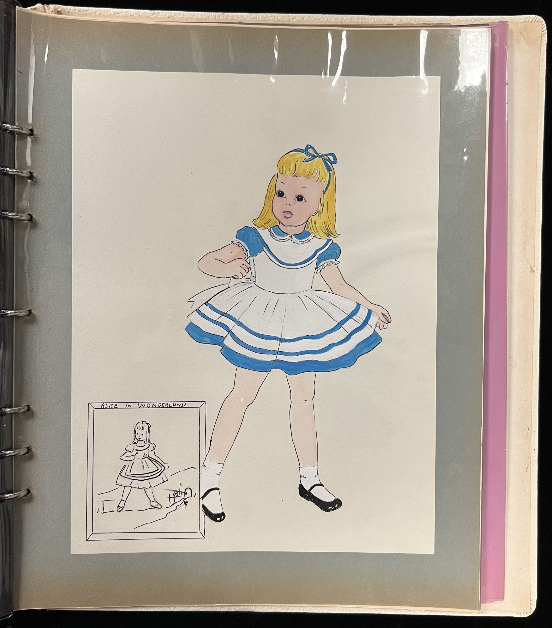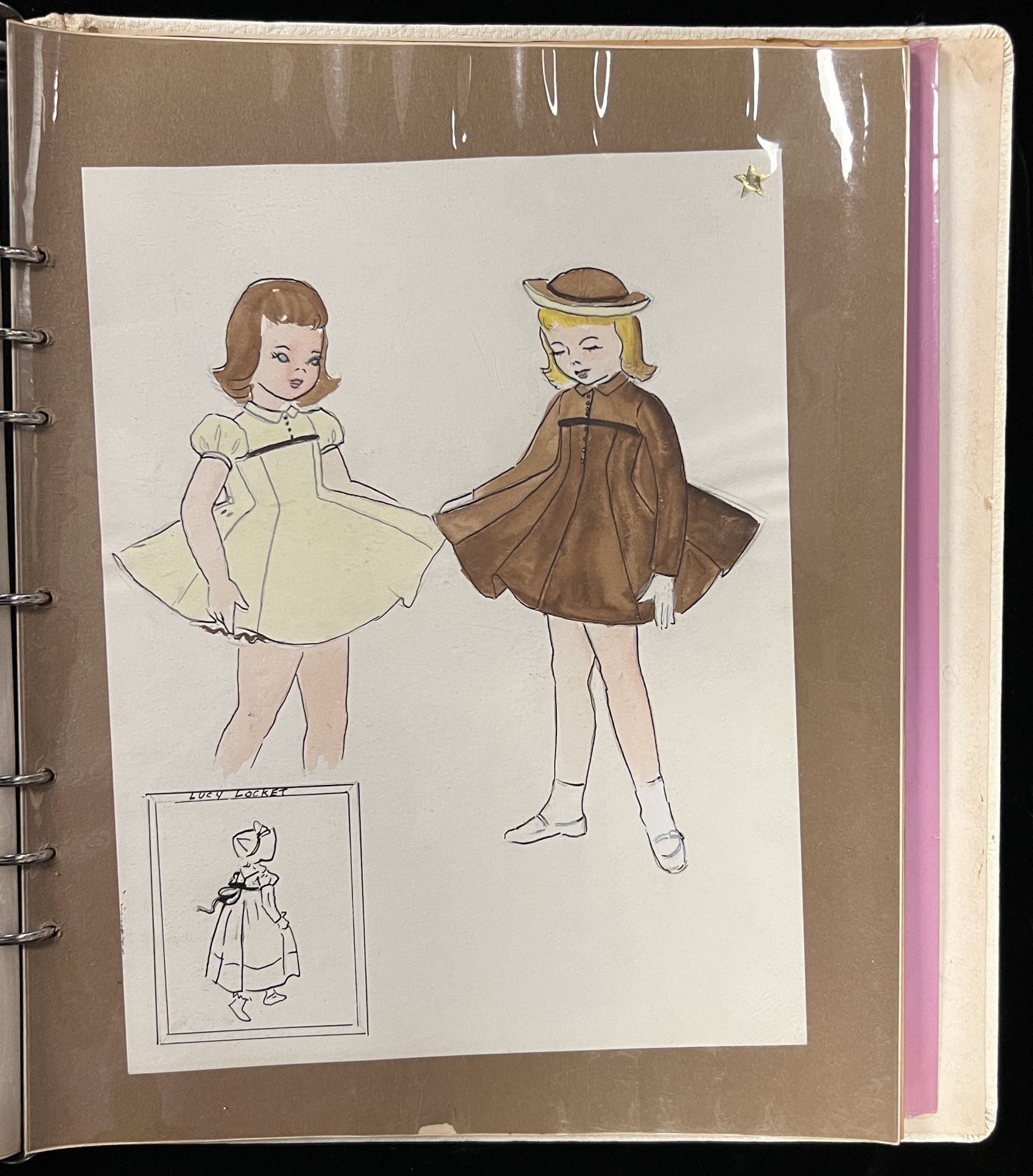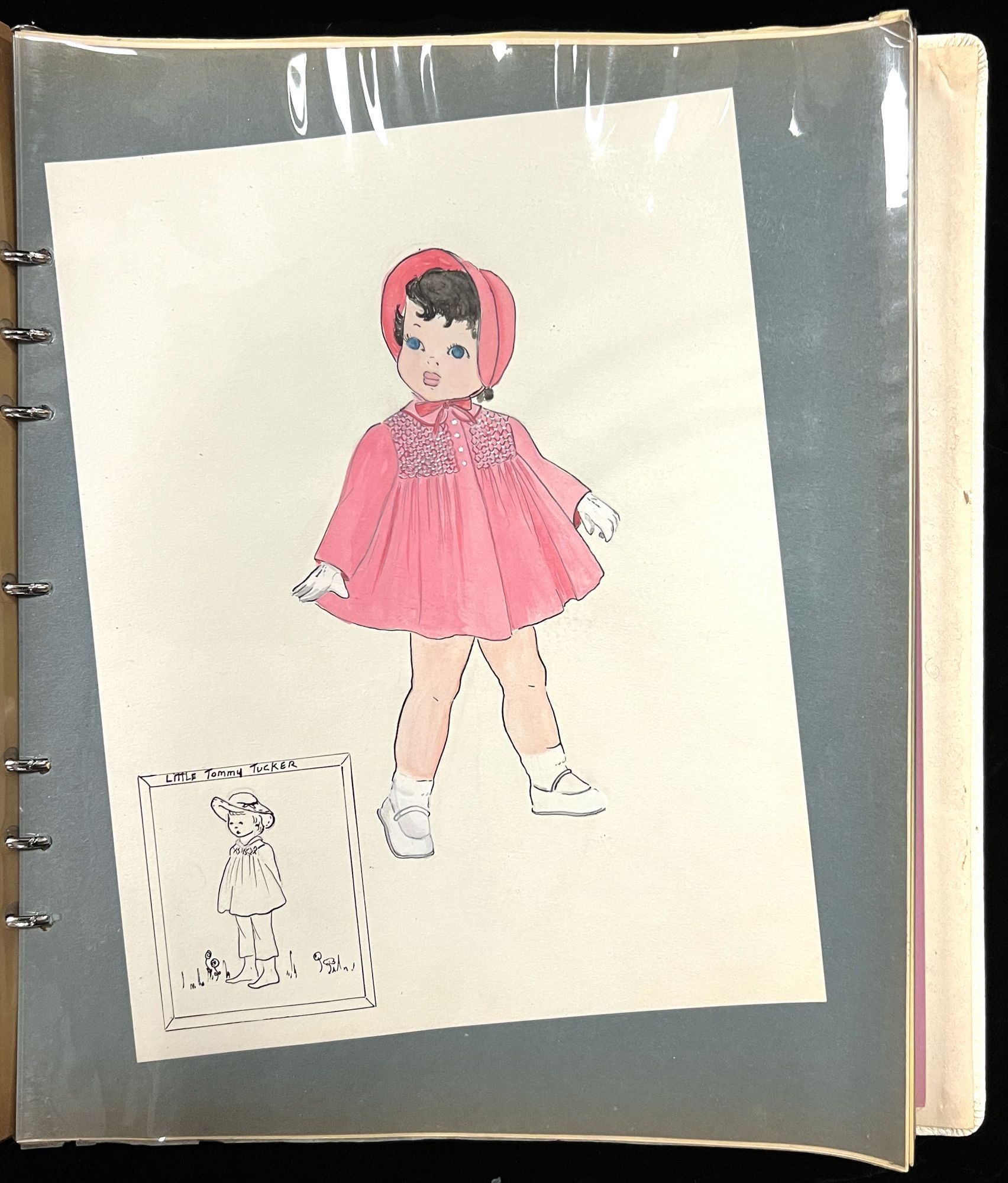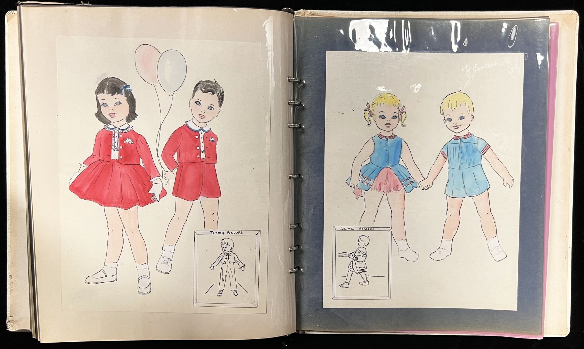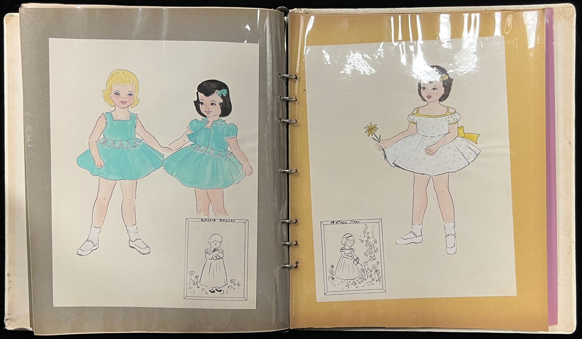 Boston, Massachusetts, 1956. Very good. Light toning, dust soiling. Rings in binder beginning to loosen.. An exceptional capstone project by a student at the Modern School of Fashion and Design in Boston, Massachusetts, named Joan Cornette, in 1956. Includes a lengthy thesis and approx. twenty-five (25) original fashion designs. A signed review from her faculty advisors notes its "finesse of detail" and high quality "Worthy of a publisher's consideration." The student, Joan M. Cornette (1934-2024) graduated from the School and went on to work at a women's clothing store as a buyer, where she also designed Christmas sweaters. She was also an avid and enthusiastic collector of porcelain dolls, and worked for Vogue designing dolls and outfits for their Ginny Doll line of dolls. Her obituary also lists her as having handmade a replica doll of her late Mother when she was a child, showing her keen creativity and precocity. This lifelong interest in dolls and children's clothing is very apparent in this project, and shows in real time her interests blooming. The project contains the following components: a 138-page typewritten dissertation on the history of children's fashion and "color psychology"; nine (9) contemporary professional photographs of children in latest fashions; a photo and typewritten letter with information about a collection of children's wear by the designer Eleanor Lambert, Inc.; a brochure and letter from the "House of Haute Couture for Children" Marcelle Julien; five (5) original pen and watercolor designs for infants; seven (7) original designs for toddlers; nine (9) for older children; three (3) original designs for matching brother and sister; and one (1) for mother and daughter. Each section of designs has a charming heading (e.g. "Lollipop Set" or "Sandbox Set". Each design is also charmingly based off a different children's story or nursery rhyme (e.g. Snow White, Little Bo Peep). She has also painted title pages for each section with images of children playing together. All is housed in the original textured cream cloth binder measuring approx. 15" by 12.5", stamped in gold. Appears complete. Cornette's final conclusion is striking and shows her passion for children and children's fashion: "I have maintained my theory throughout this thesis that children are individual personalities and should be treated as such when pertaining to the designing of clothes which suit them ... the child has a new place in the fashion world.