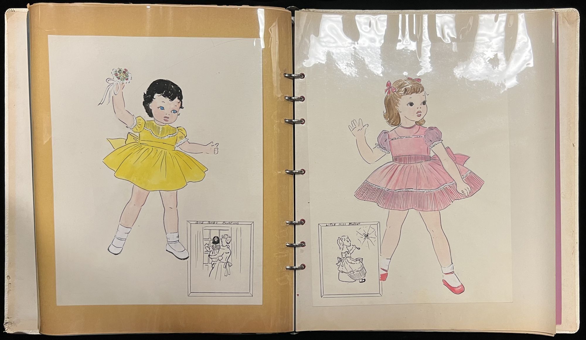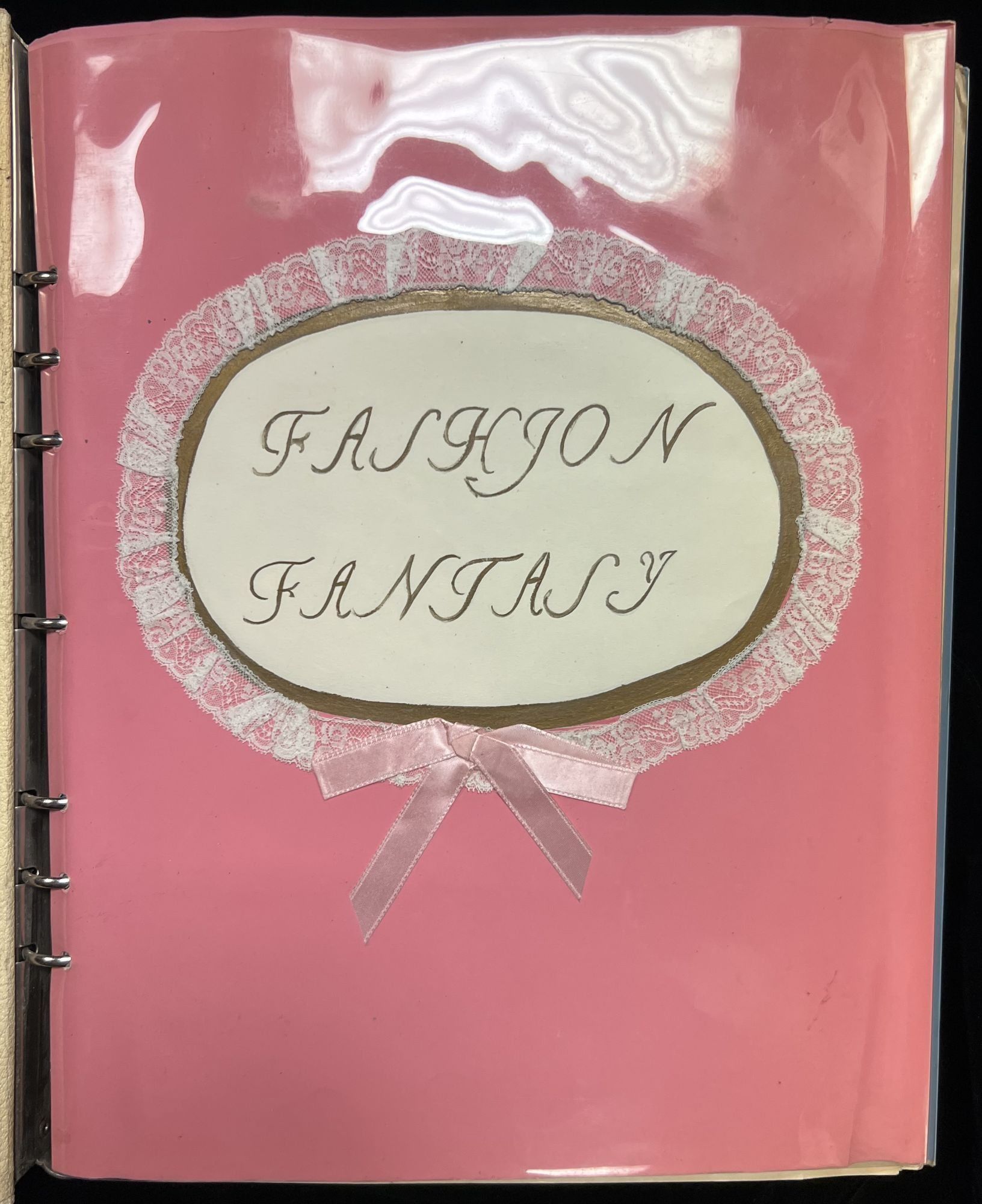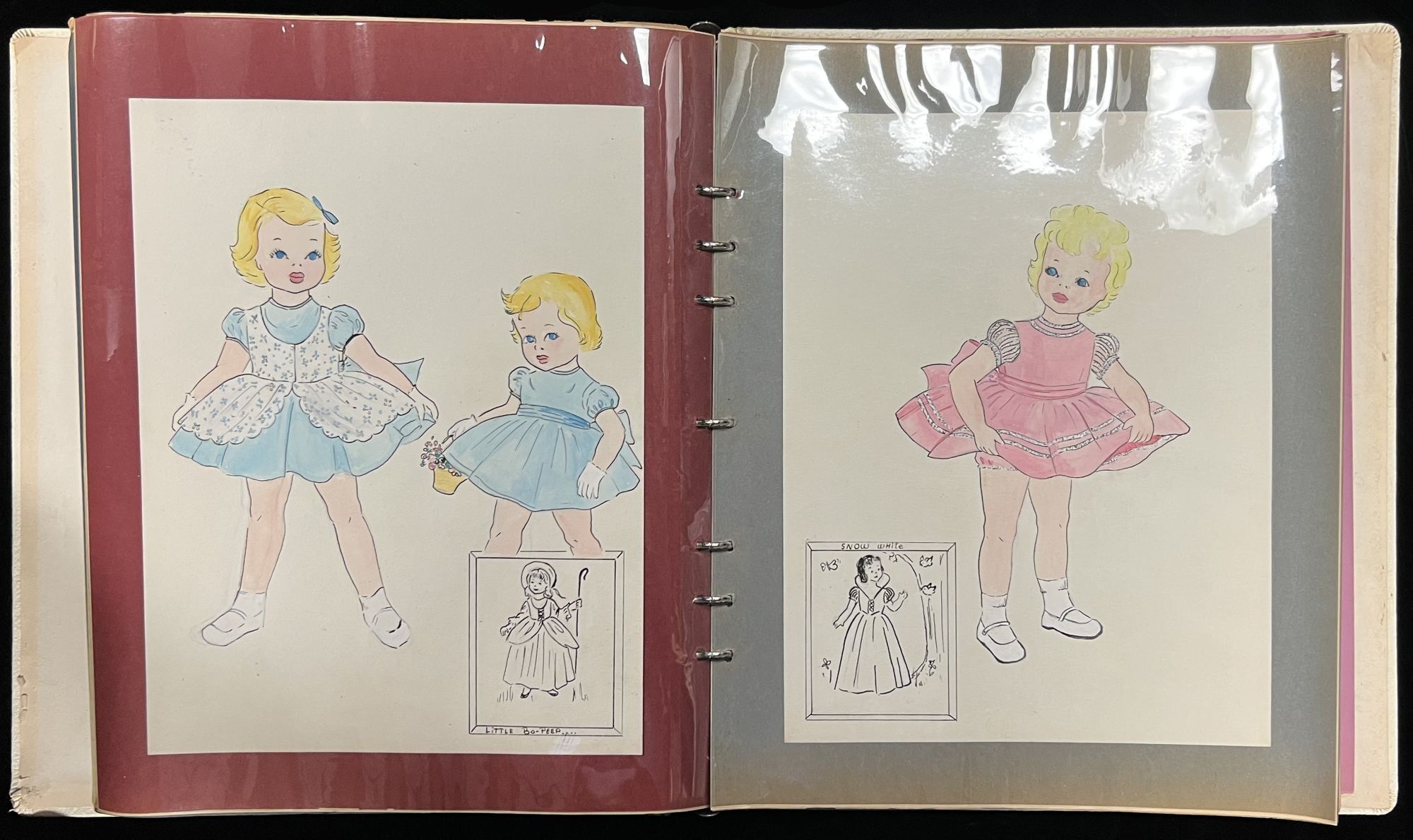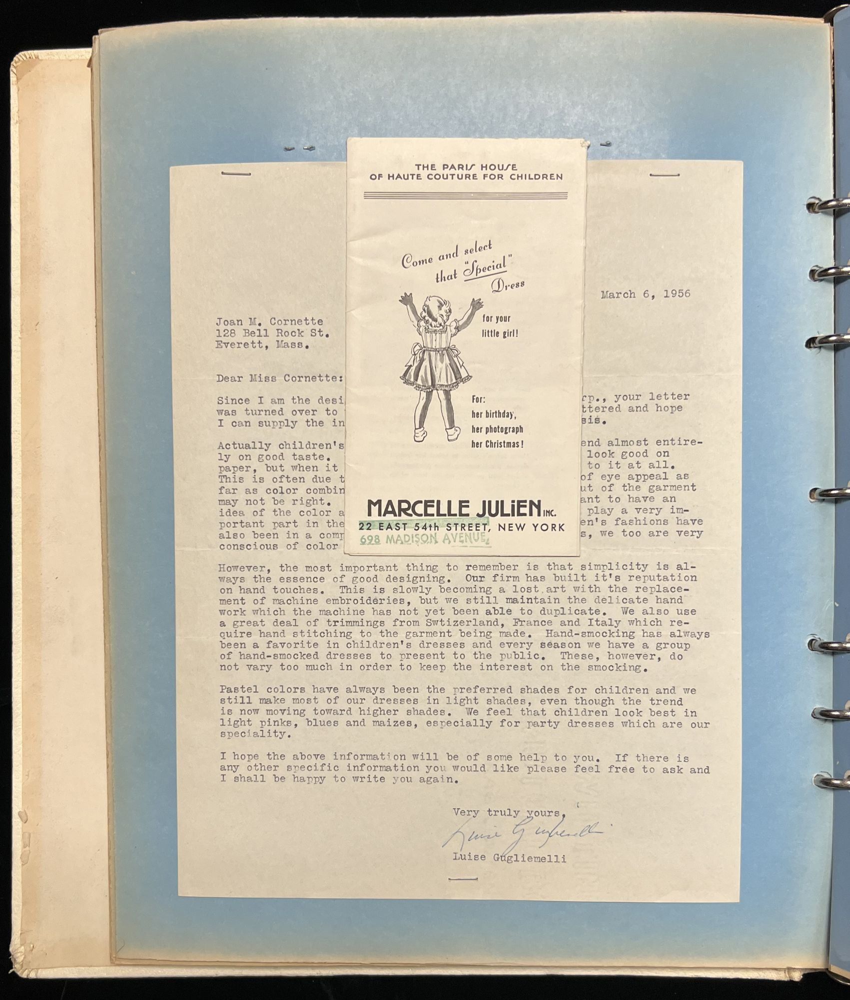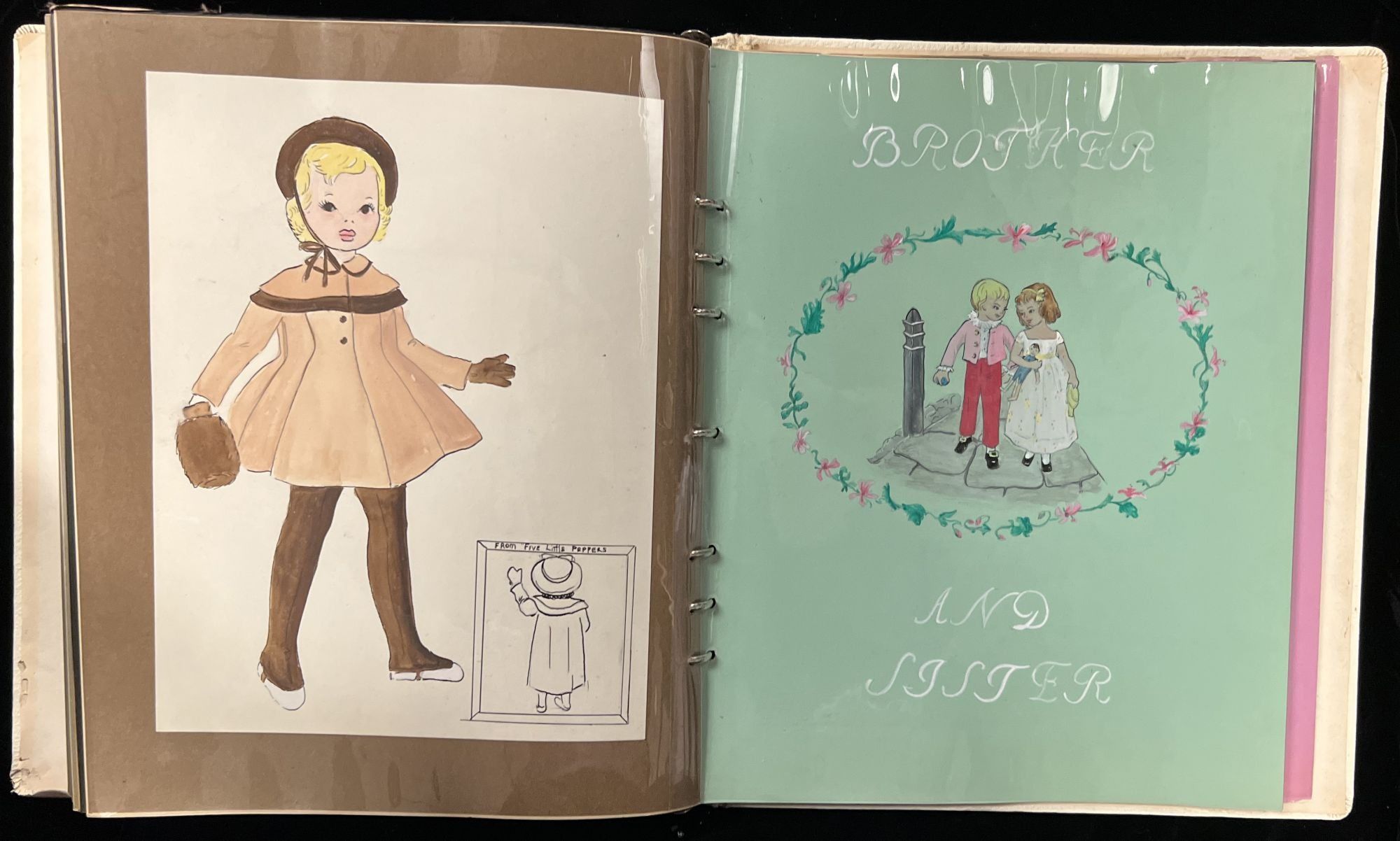 Boston, Massachusetts, 1956. Very good. Light toning, dust soiling. Rings in binder beginning to loosen.. An exceptional capstone project by a student at the Modern School of Fashion and Design in Boston, Massachusetts, named Joan Cornette, in 1956. Includes a lengthy thesis and approx. twenty-five (25) original fashion designs. A signed review from her faculty advisors notes its "finesse of detail" and high quality "Worthy of a publisher's consideration." The student, Joan M. Cornette (1934-2024) graduated from the School and went on to work at a women's clothing store as a buyer, where she also designed Christmas sweaters. She was also an avid and enthusiastic collector of porcelain dolls, and worked for Vogue designing dolls and outfits for their Ginny Doll line of dolls. Her obituary also lists her as having handmade a replica doll of her late Mother when she was a child, showing her keen creativity and precocity. This lifelong interest in dolls and children's clothing is very apparent in this project, and shows in real time her interests blooming. The project contains the following components: a 138-page typewritten dissertation on the history of children's fashion and "color psychology"; nine (9) contemporary professional photographs of children in latest fashions; a photo and typewritten letter with information about a collection of children's wear by the designer Eleanor Lambert, Inc.; a brochure and letter from the "House of Haute Couture for Children" Marcelle Julien; five (5) original pen and watercolor designs for infants; seven (7) original designs for toddlers; nine (9) for older children; three (3) original designs for matching brother and sister; and one (1) for mother and daughter. Each section of designs has a charming heading (e.g. "Lollipop Set" or "Sandbox Set". Each design is also charmingly based off a different children's story or nursery rhyme (e.g. Snow White, Little Bo Peep). She has also painted title pages for each section with images of children playing together. All is housed in the original textured cream cloth binder measuring approx. 15" by 12.5", stamped in gold. Appears complete. Cornette's final conclusion is striking and shows her passion for children and children's fashion: "I have maintained my theory throughout this thesis that children are individual personalities and should be treated as such when pertaining to the designing of clothes which suit them ... the child has a new place in the fashion world.