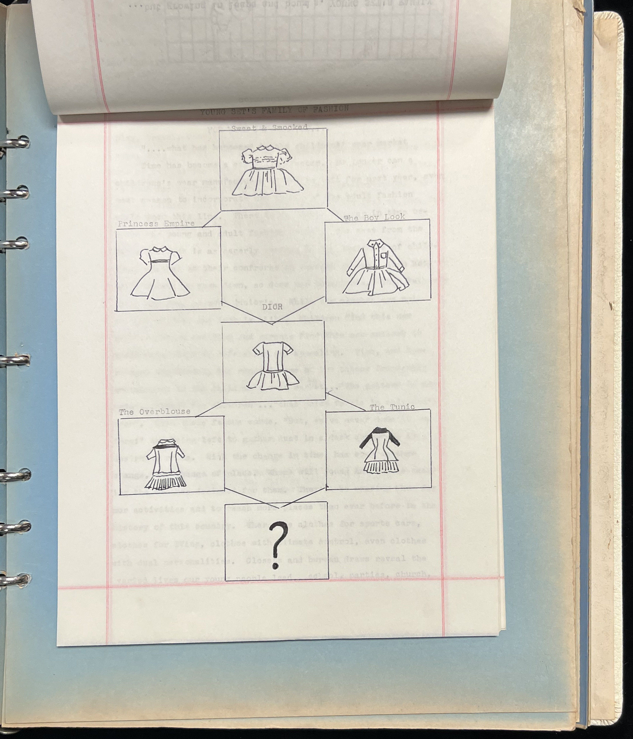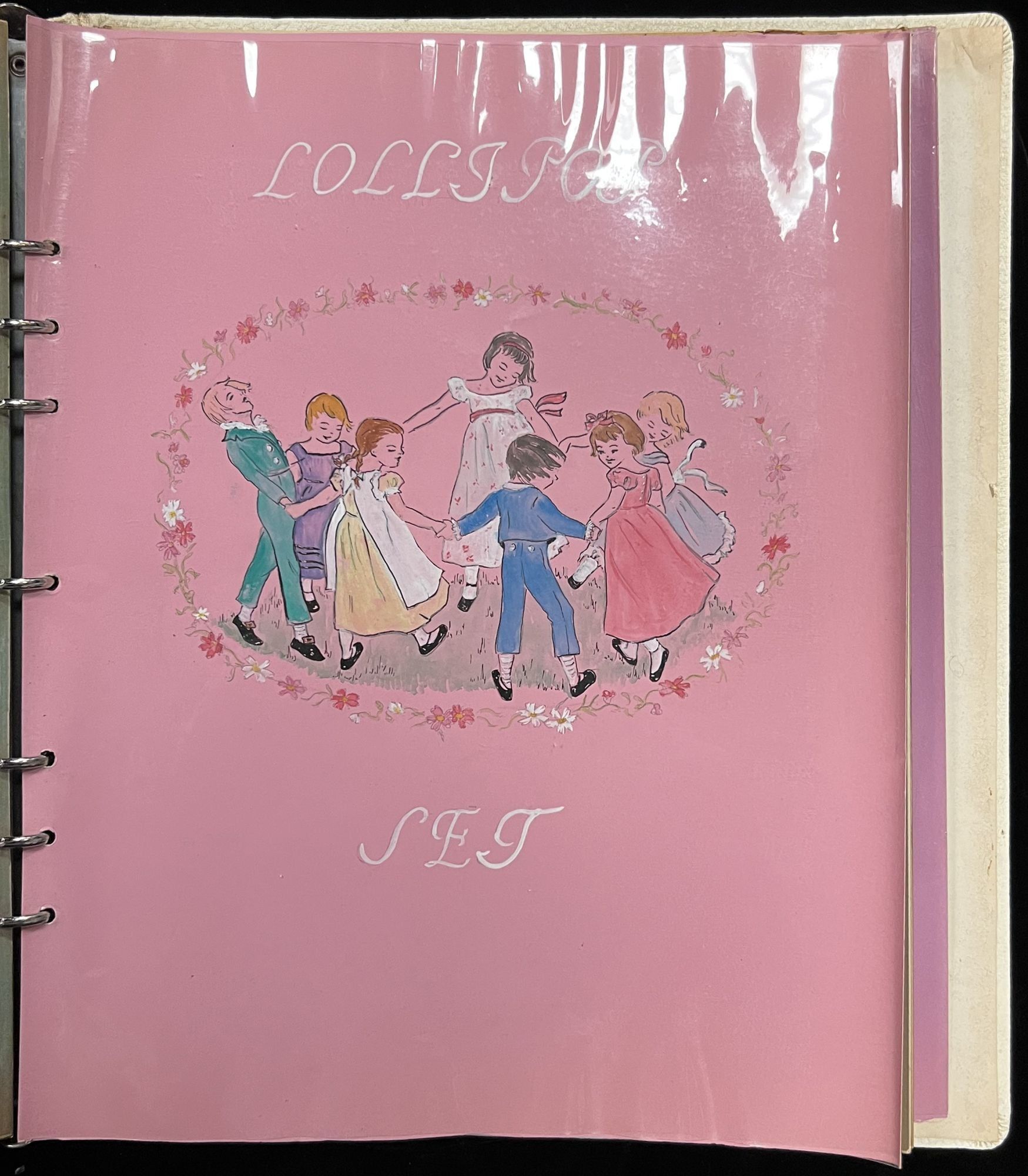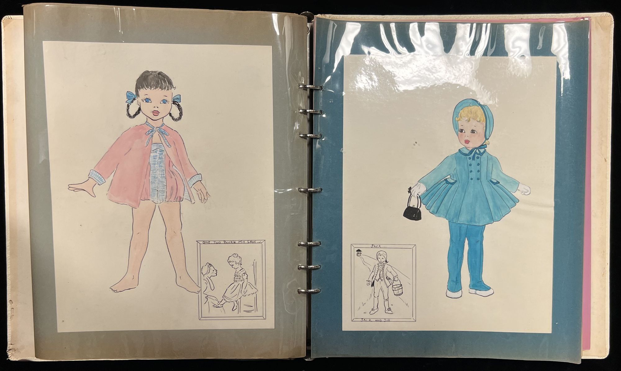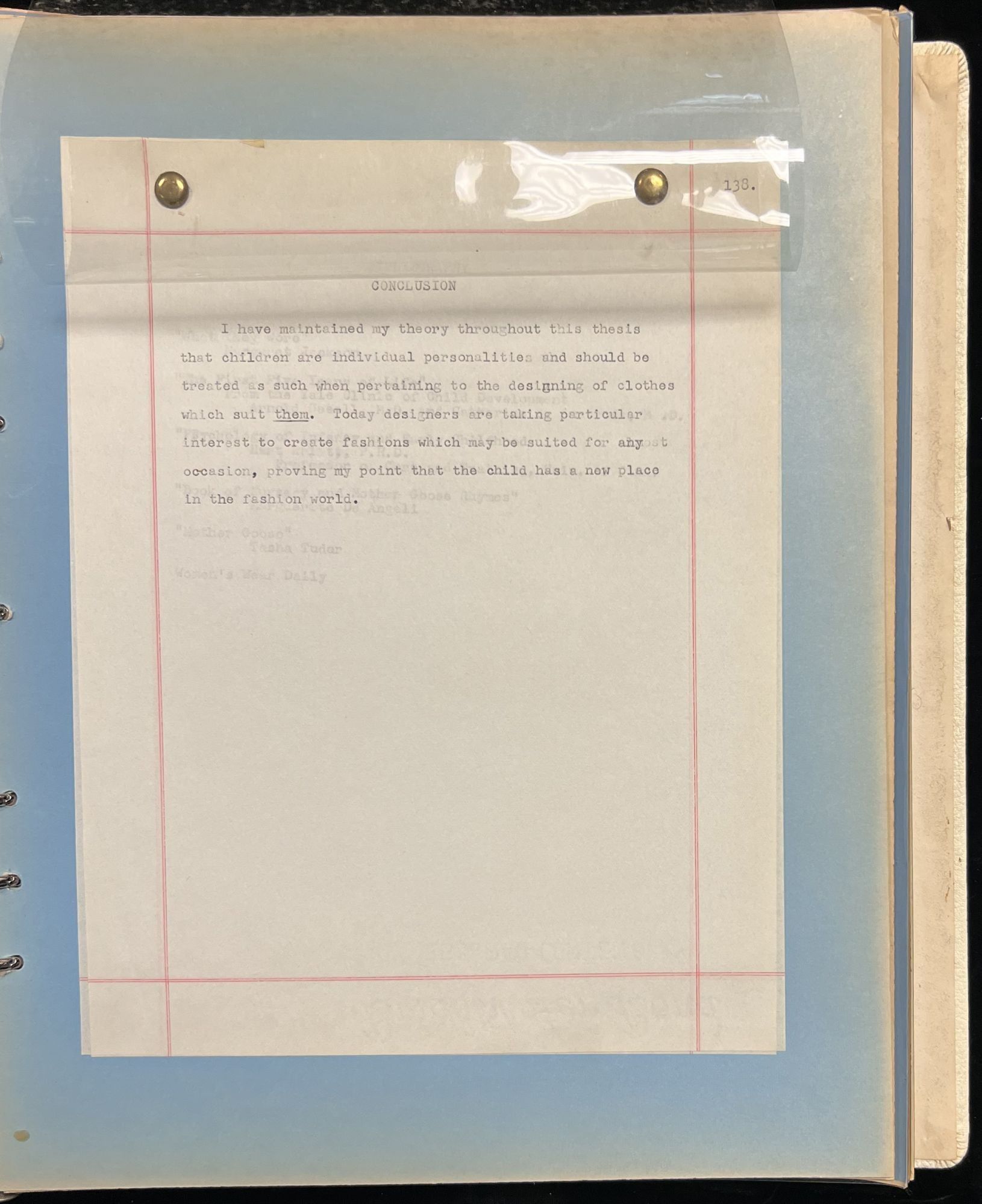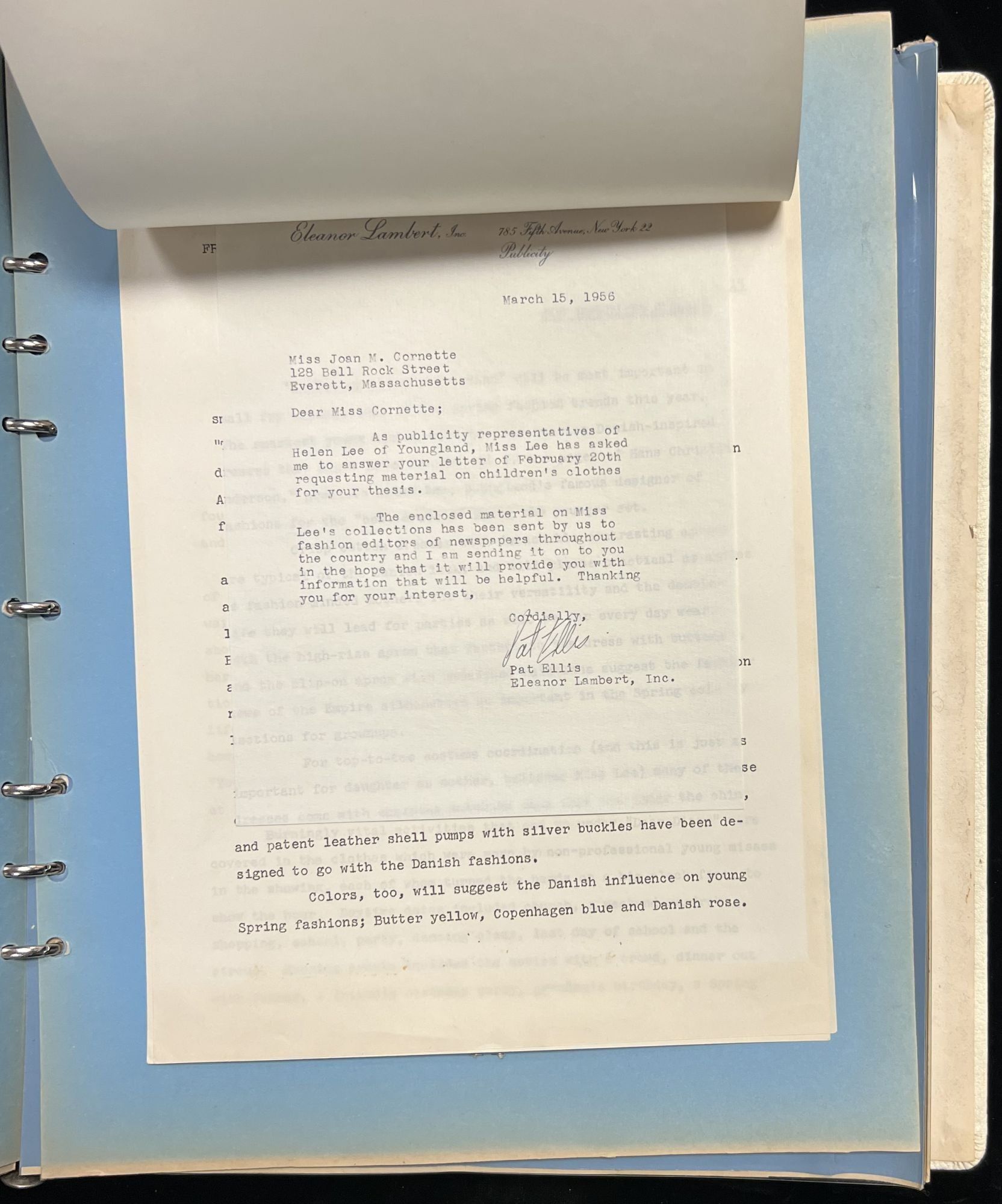 Boston, Massachusetts, 1956. Very good. Light toning, dust soiling. Rings in binder beginning to loosen.. An exceptional capstone project by a student at the Modern School of Fashion and Design in Boston, Massachusetts, named Joan Cornette, in 1956. Includes a lengthy thesis and approx. twenty-five (25) original fashion designs. A signed review from her faculty advisors notes its "finesse of detail" and high quality "Worthy of a publisher's consideration." The student, Joan M. Cornette (1934-2024) graduated from the School and went on to work at a women's clothing store as a buyer, where she also designed Christmas sweaters. She was also an avid and enthusiastic collector of porcelain dolls, and worked for Vogue designing dolls and outfits for their Ginny Doll line of dolls. Her obituary also lists her as having handmade a replica doll of her late Mother when she was a child, showing her keen creativity and precocity. This lifelong interest in dolls and children's clothing is very apparent in this project, and shows in real time her interests blooming. The project contains the following components: a 138-page typewritten dissertation on the history of children's fashion and "color psychology"; nine (9) contemporary professional photographs of children in latest fashions; a photo and typewritten letter with information about a collection of children's wear by the designer Eleanor Lambert, Inc.; a brochure and letter from the "House of Haute Couture for Children" Marcelle Julien; five (5) original pen and watercolor designs for infants; seven (7) original designs for toddlers; nine (9) for older children; three (3) original designs for matching brother and sister; and one (1) for mother and daughter. Each section of designs has a charming heading (e.g. "Lollipop Set" or "Sandbox Set". Each design is also charmingly based off a different children's story or nursery rhyme (e.g. Snow White, Little Bo Peep). She has also painted title pages for each section with images of children playing together. All is housed in the original textured cream cloth binder measuring approx. 15" by 12.5", stamped in gold. Appears complete. Cornette's final conclusion is striking and shows her passion for children and children's fashion: "I have maintained my theory throughout this thesis that children are individual personalities and should be treated as such when pertaining to the designing of clothes which suit them ... the child has a new place in the fashion world.