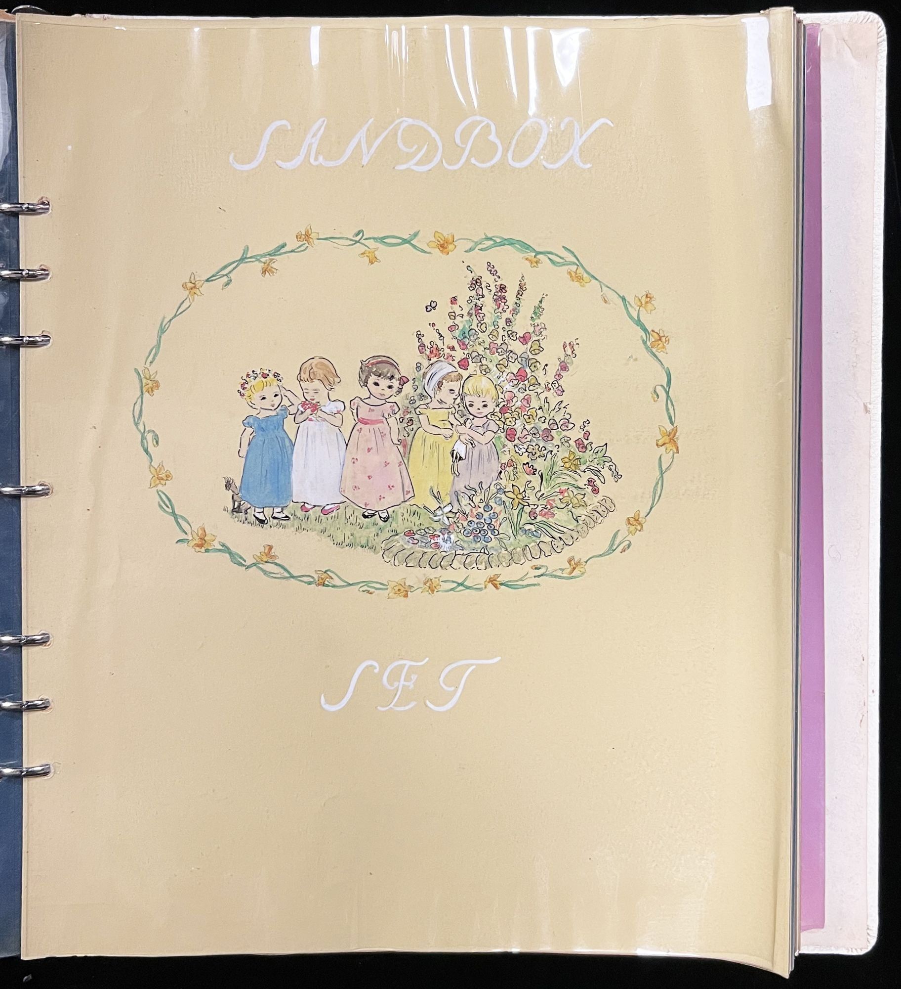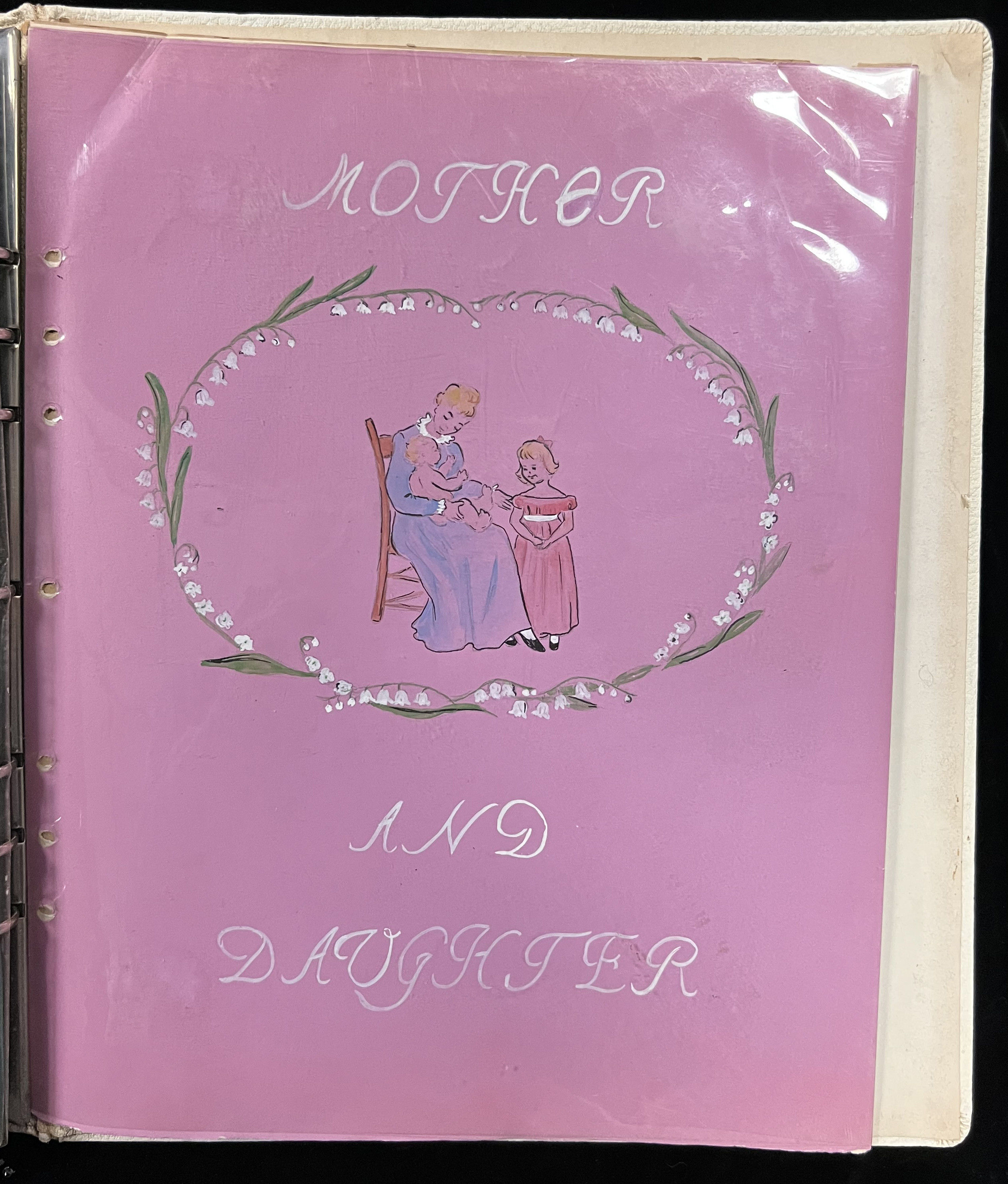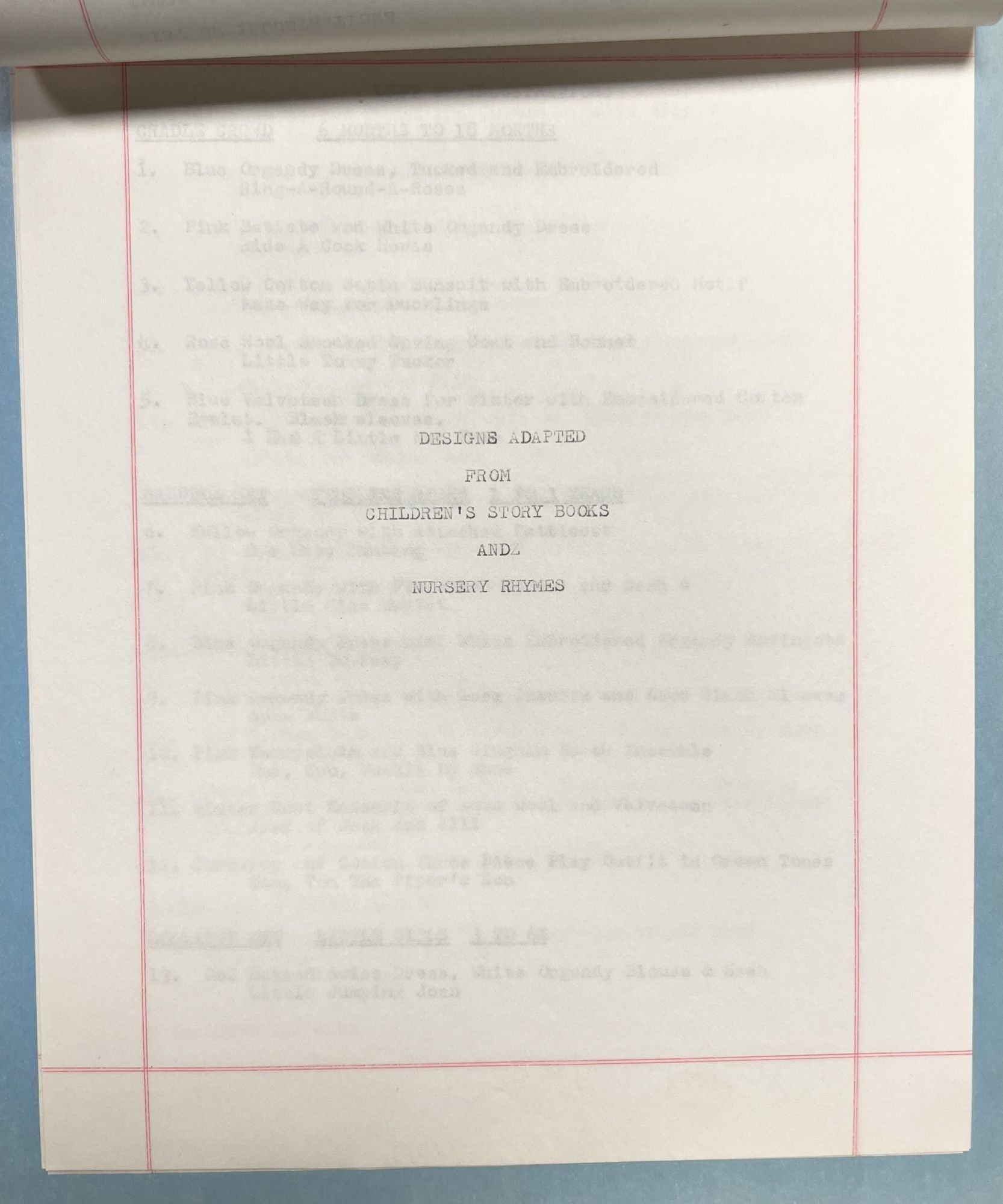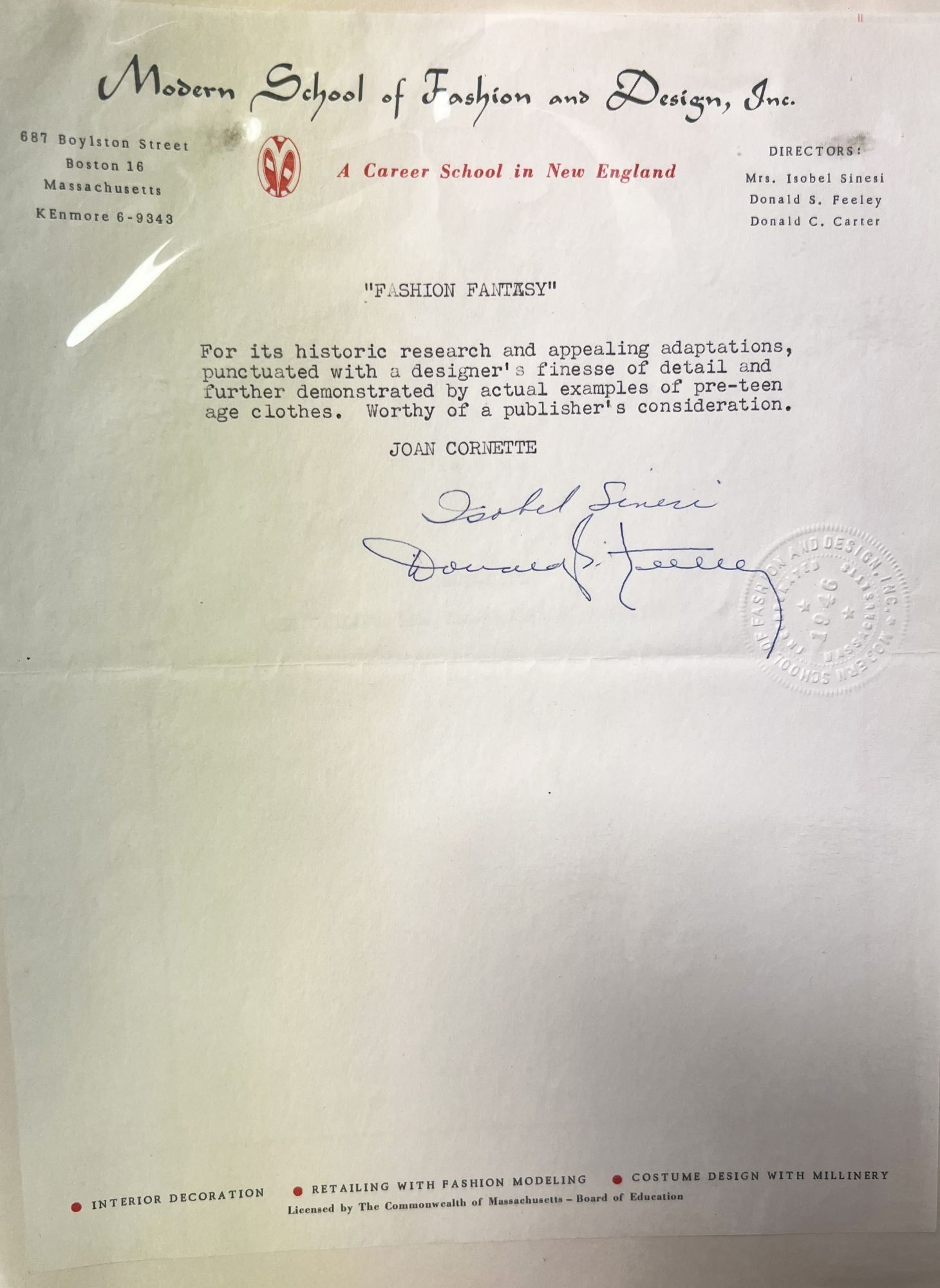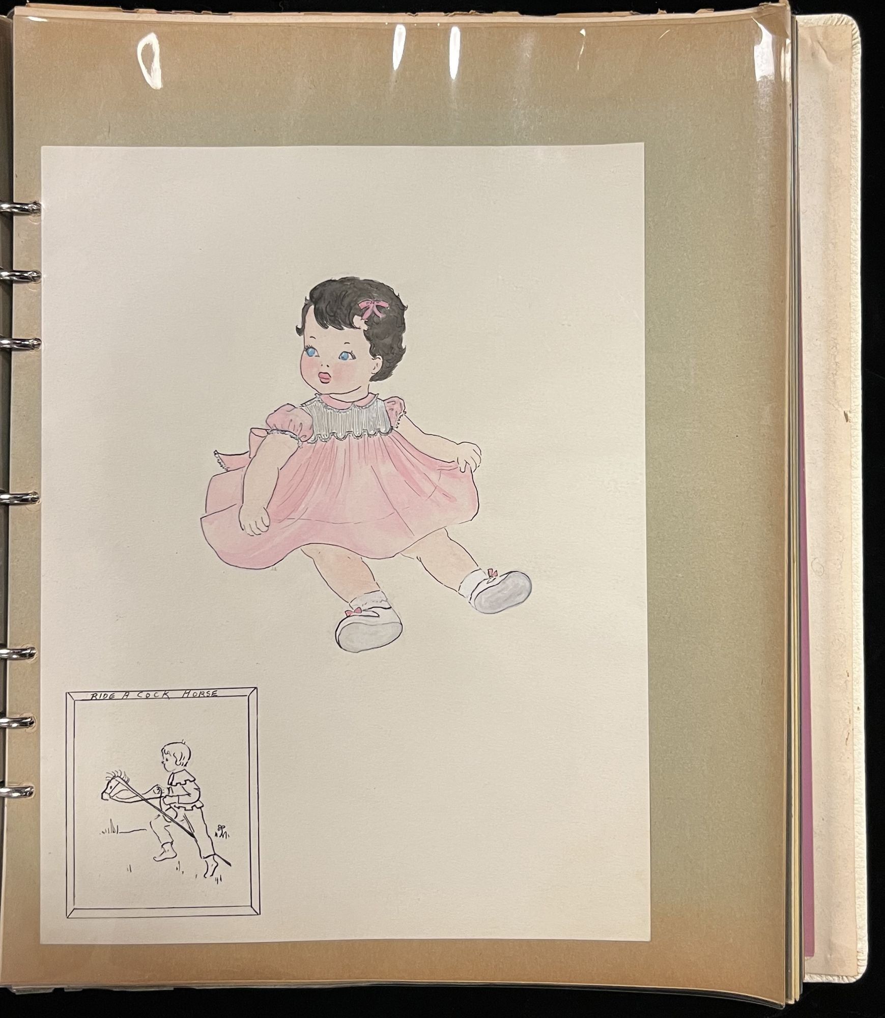 Boston, Massachusetts, 1956. Very good. Light toning, dust soiling. Rings in binder beginning to loosen.. An exceptional capstone project by a student at the Modern School of Fashion and Design in Boston, Massachusetts, named Joan Cornette, in 1956. Includes a lengthy thesis and approx. twenty-five (25) original fashion designs. A signed review from her faculty advisors notes its "finesse of detail" and high quality "Worthy of a publisher's consideration." The student, Joan M. Cornette (1934-2024) graduated from the School and went on to work at a women's clothing store as a buyer, where she also designed Christmas sweaters. She was also an avid and enthusiastic collector of porcelain dolls, and worked for Vogue designing dolls and outfits for their Ginny Doll line of dolls. Her obituary also lists her as having handmade a replica doll of her late Mother when she was a child, showing her keen creativity and precocity. This lifelong interest in dolls and children's clothing is very apparent in this project, and shows in real time her interests blooming. The project contains the following components: a 138-page typewritten dissertation on the history of children's fashion and "color psychology"; nine (9) contemporary professional photographs of children in latest fashions; a photo and typewritten letter with information about a collection of children's wear by the designer Eleanor Lambert, Inc.; a brochure and letter from the "House of Haute Couture for Children" Marcelle Julien; five (5) original pen and watercolor designs for infants; seven (7) original designs for toddlers; nine (9) for older children; three (3) original designs for matching brother and sister; and one (1) for mother and daughter. Each section of designs has a charming heading (e.g. "Lollipop Set" or "Sandbox Set". Each design is also charmingly based off a different children's story or nursery rhyme (e.g. Snow White, Little Bo Peep). She has also painted title pages for each section with images of children playing together. All is housed in the original textured cream cloth binder measuring approx. 15" by 12.5", stamped in gold. Appears complete. Cornette's final conclusion is striking and shows her passion for children and children's fashion: "I have maintained my theory throughout this thesis that children are individual personalities and should be treated as such when pertaining to the designing of clothes which suit them ... the child has a new place in the fashion world.