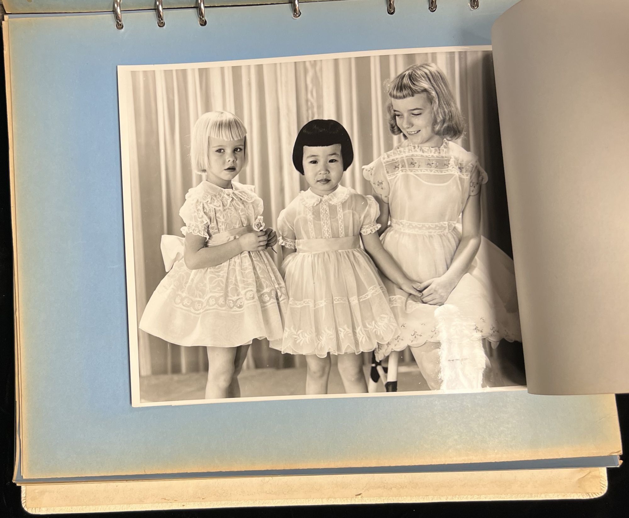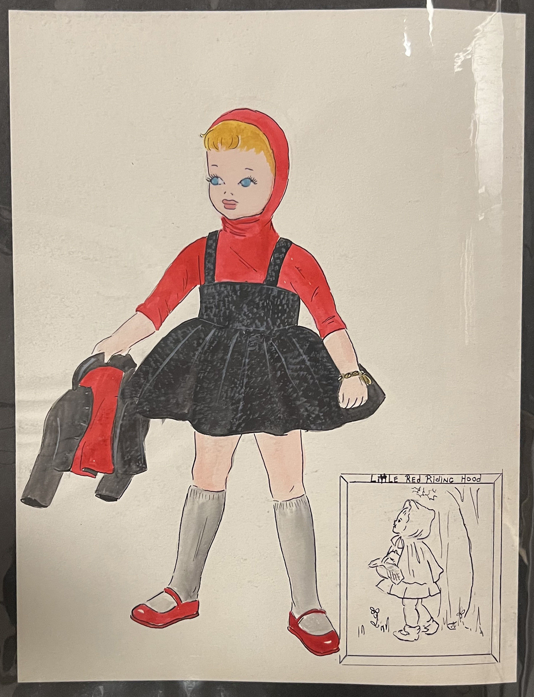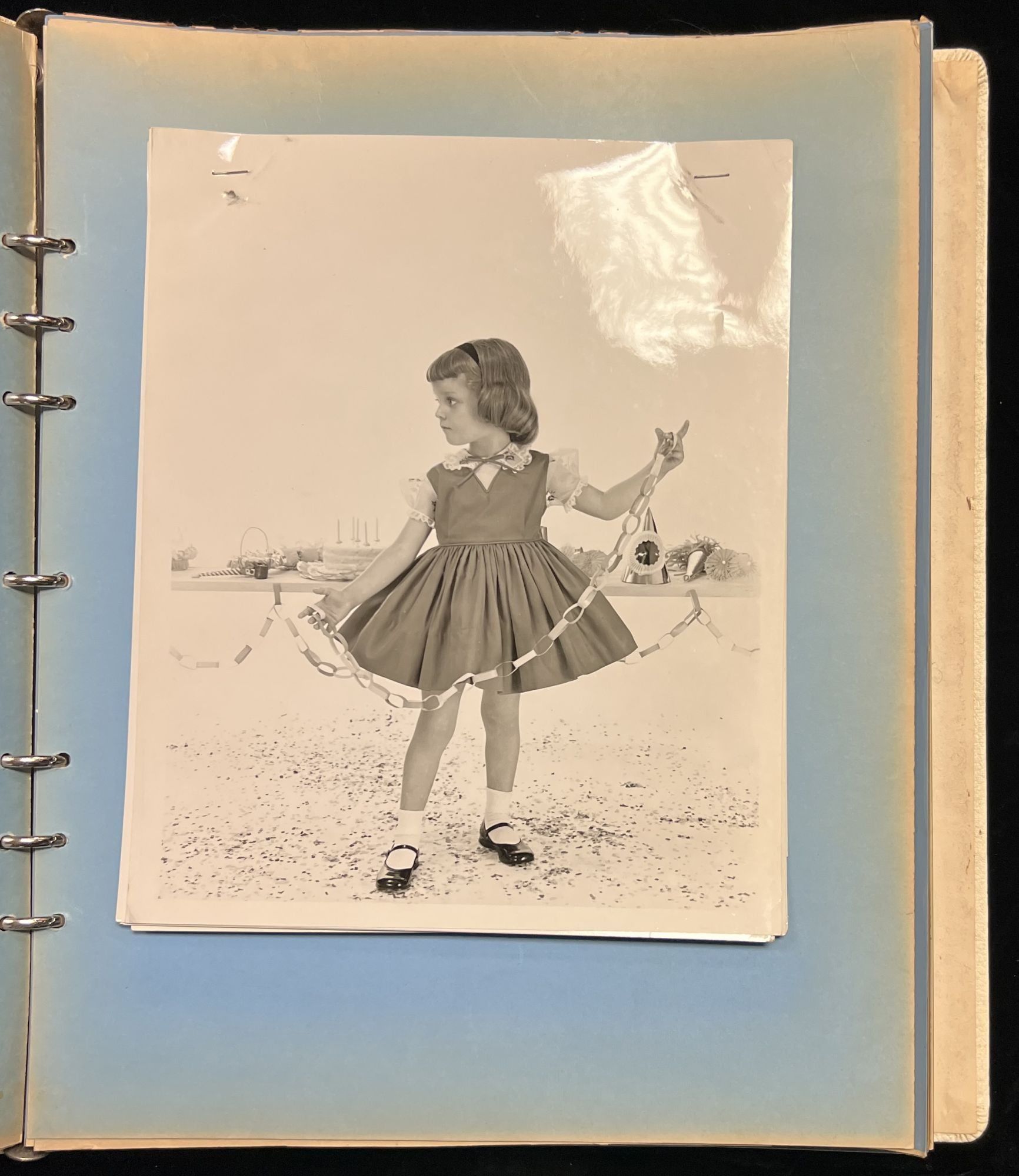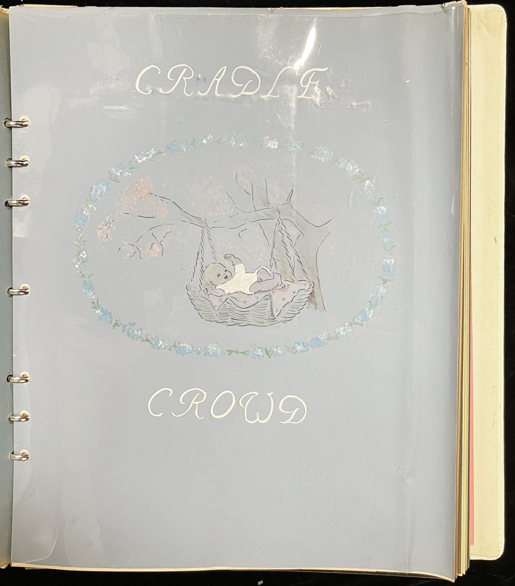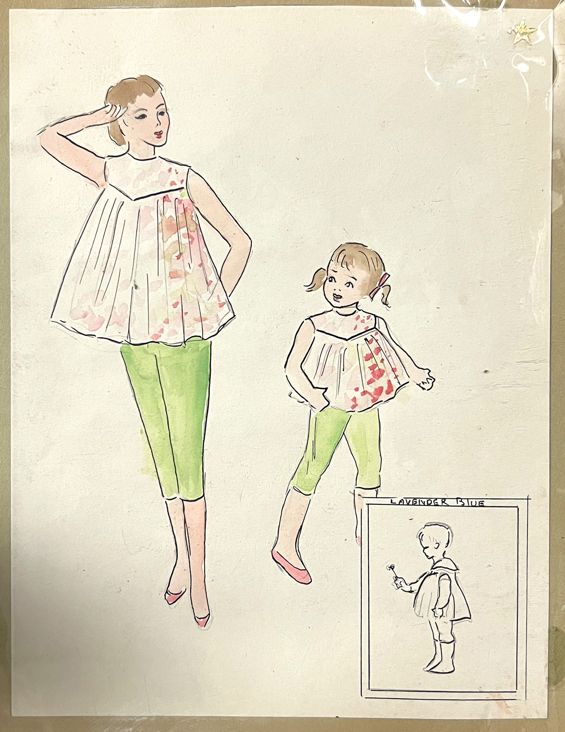 Boston, Massachusetts, 1956. Very good. Light toning, dust soiling. Rings in binder beginning to loosen.. An exceptional capstone project by a student at the Modern School of Fashion and Design in Boston, Massachusetts, named Joan Cornette, in 1956. Includes a lengthy thesis and approx. twenty-five (25) original fashion designs. A signed review from her faculty advisors notes its "finesse of detail" and high quality "Worthy of a publisher's consideration." The student, Joan M. Cornette (1934-2024) graduated from the School and went on to work at a women's clothing store as a buyer, where she also designed Christmas sweaters. She was also an avid and enthusiastic collector of porcelain dolls, and worked for Vogue designing dolls and outfits for their Ginny Doll line of dolls. Her obituary also lists her as having handmade a replica doll of her late Mother when she was a child, showing her keen creativity and precocity. This lifelong interest in dolls and children's clothing is very apparent in this project, and shows in real time her interests blooming. The project contains the following components: a 138-page typewritten dissertation on the history of children's fashion and "color psychology"; nine (9) contemporary professional photographs of children in latest fashions; a photo and typewritten letter with information about a collection of children's wear by the designer Eleanor Lambert, Inc.; a brochure and letter from the "House of Haute Couture for Children" Marcelle Julien; five (5) original pen and watercolor designs for infants; seven (7) original designs for toddlers; nine (9) for older children; three (3) original designs for matching brother and sister; and one (1) for mother and daughter. Each section of designs has a charming heading (e.g. "Lollipop Set" or "Sandbox Set". Each design is also charmingly based off a different children's story or nursery rhyme (e.g. Snow White, Little Bo Peep). She has also painted title pages for each section with images of children playing together. All is housed in the original textured cream cloth binder measuring approx. 15" by 12.5", stamped in gold. Appears complete. Cornette's final conclusion is striking and shows her passion for children and children's fashion: "I have maintained my theory throughout this thesis that children are individual personalities and should be treated as such when pertaining to the designing of clothes which suit them ... the child has a new place in the fashion world.