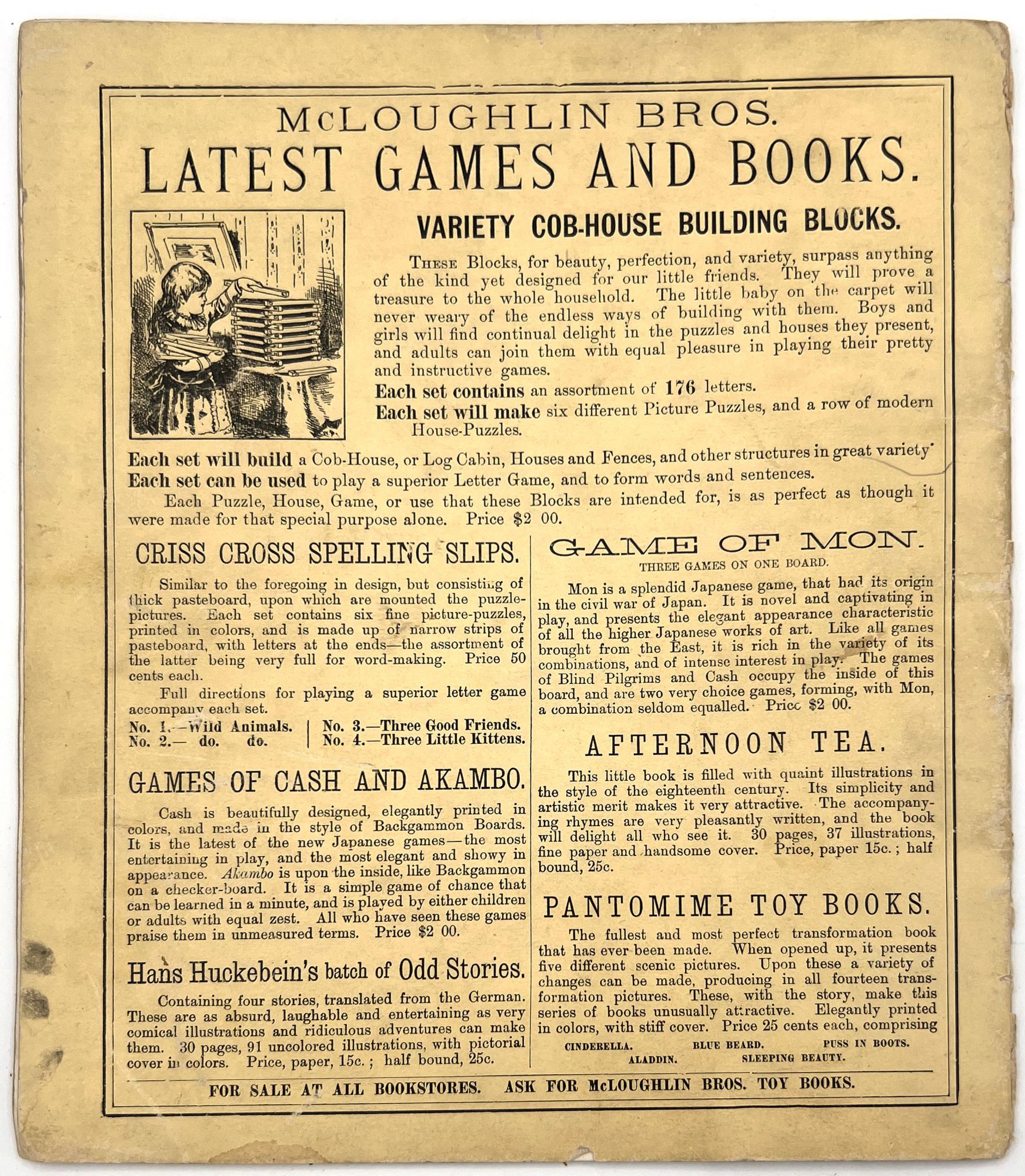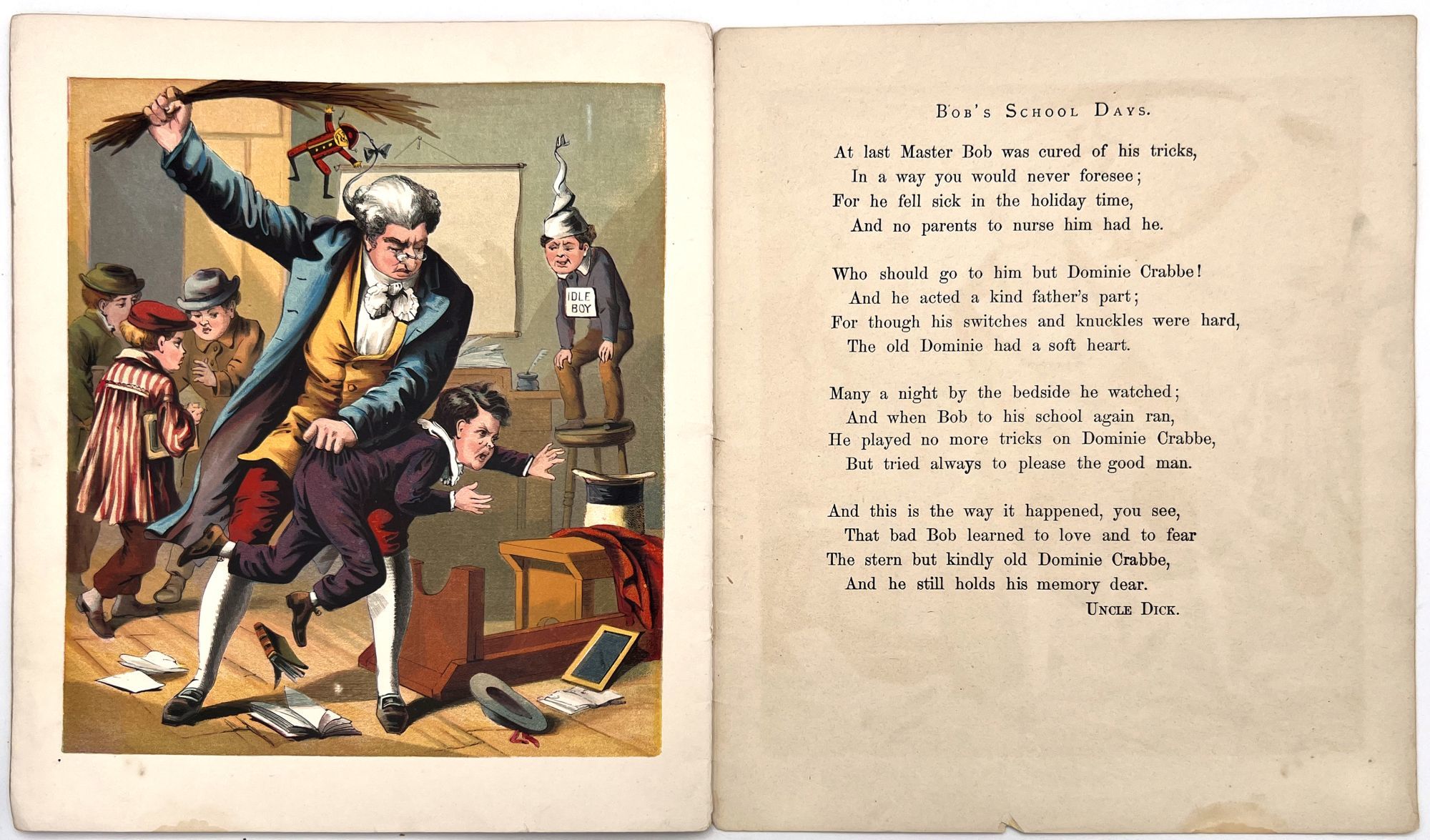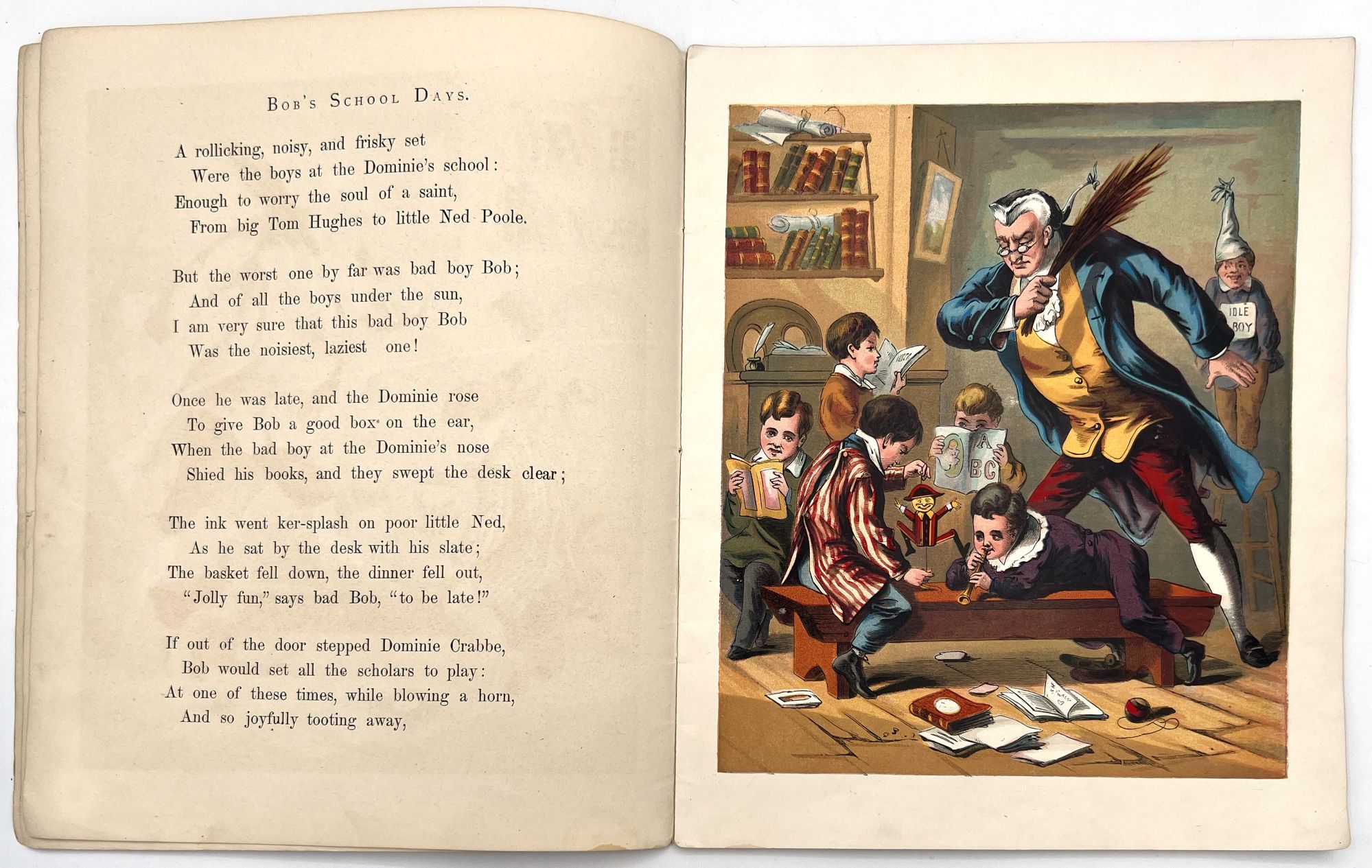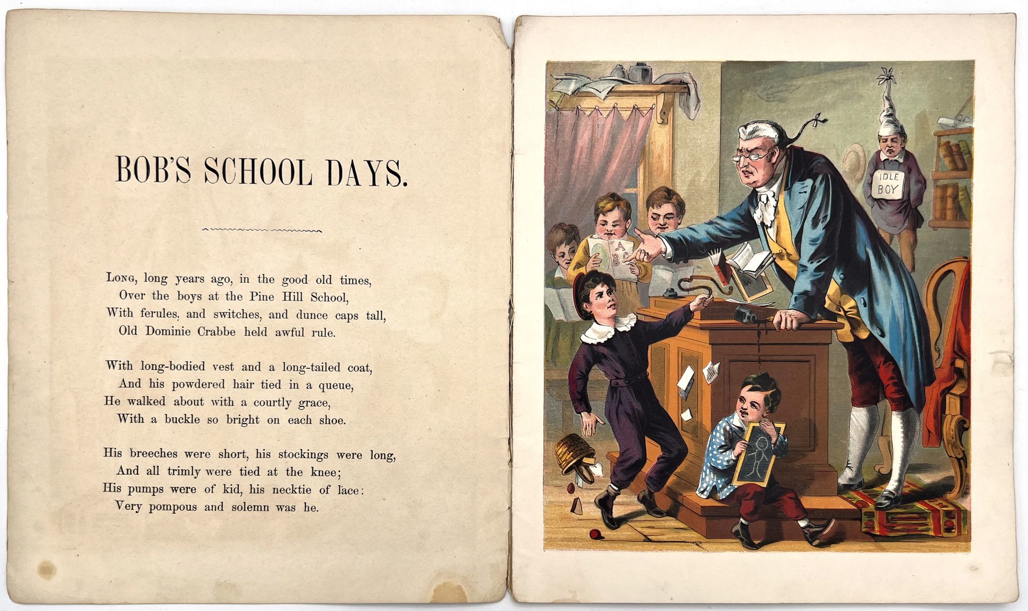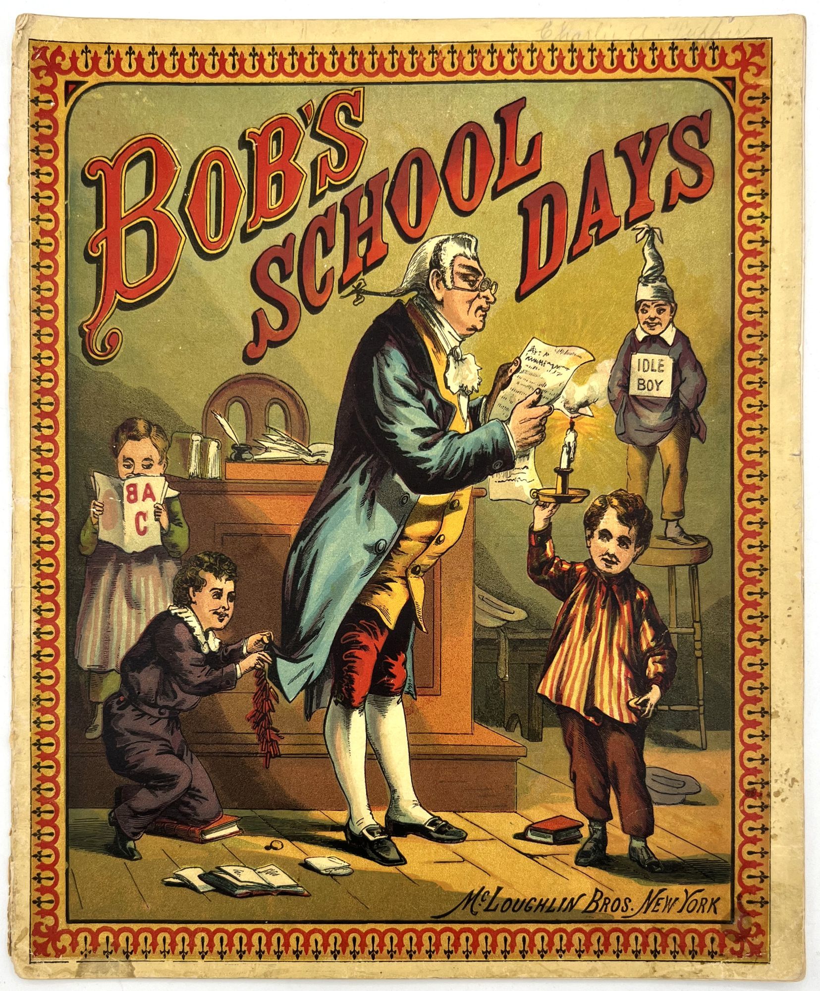 New York, New York: McLoughlin Bros, 1880. Good to very good. Spine worn with short tears and chipping. Some staining/spotting, light dust soiling.. A fun picture book for early readers by McLoughlin, telling the story of a mischievous school boy named Bob and his antics in the classroom. Includes six (6) full page chromolitho plates, two of which combine to span an entire opening and depict the chaos of the classroom. There are six pages of large text rhymes, including two printed on the inside of the wrappers. The wrappers depict a fun scene, including a strict schoolmaster, a cheeky boy playing with a candle flame, another boy tying something to the schoolmaster's coat, and an "Idle Boy" in the corner on a stool with a dunce cap. Single vol. (10.5" by 9.25"), ten unnumbered leaves printed on one side only, including 6 plates of chromolitho illus., in original illus. wrps.