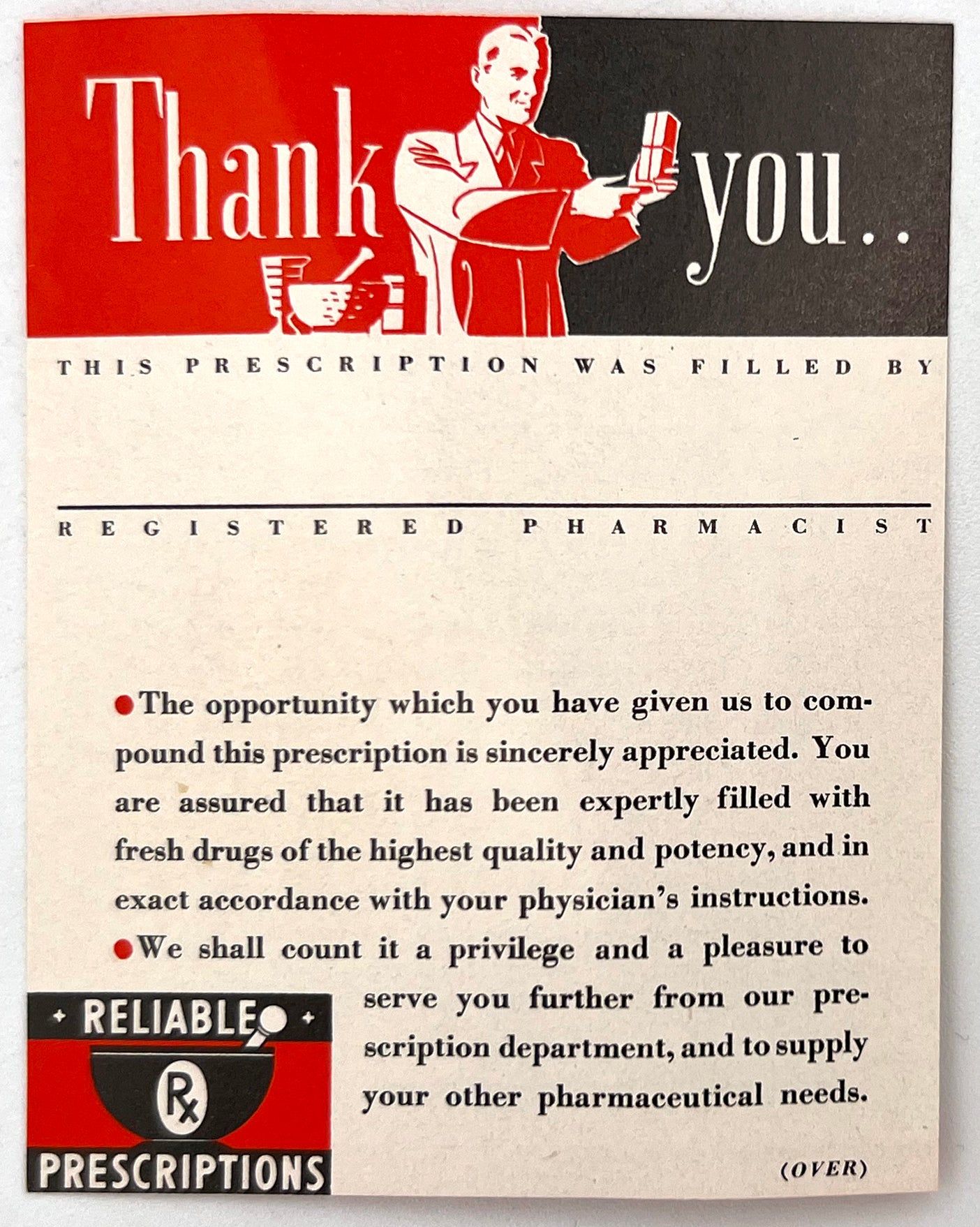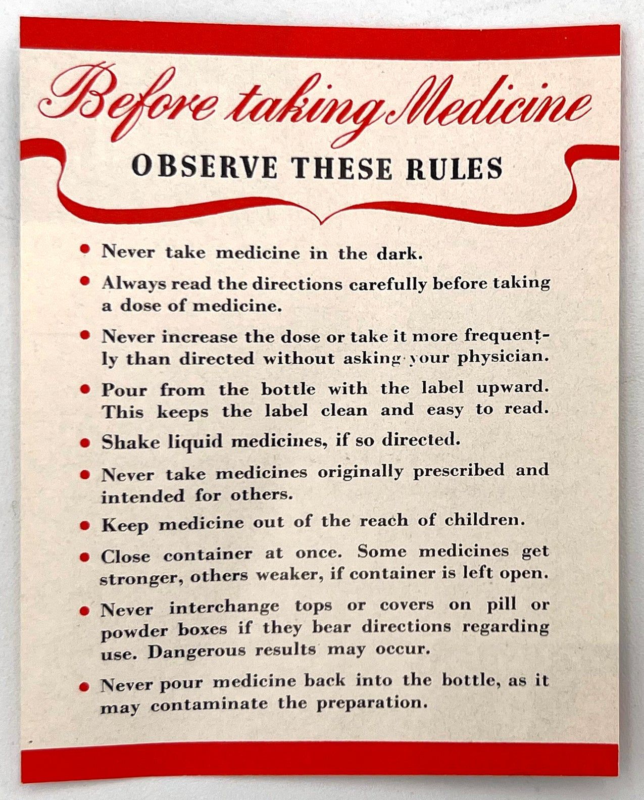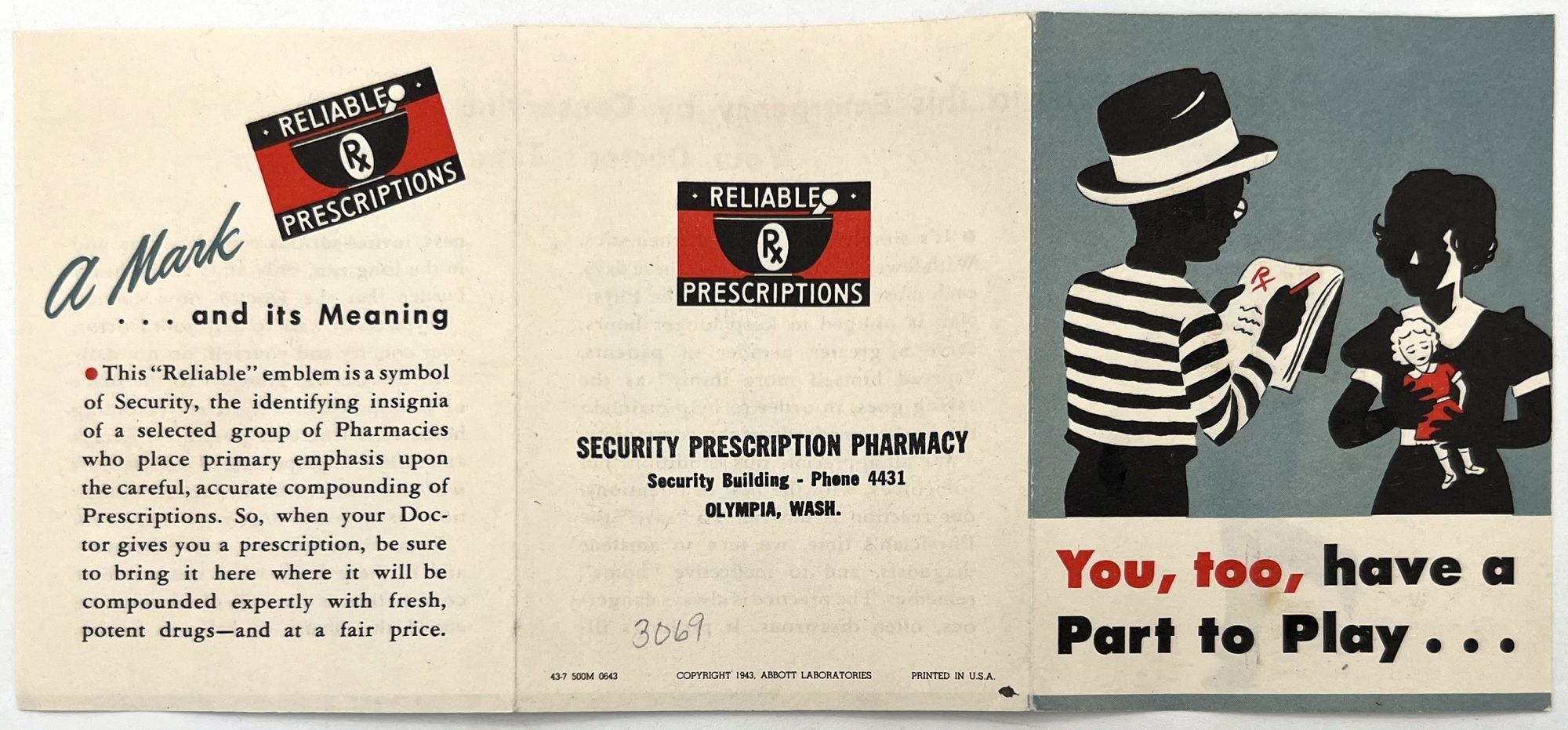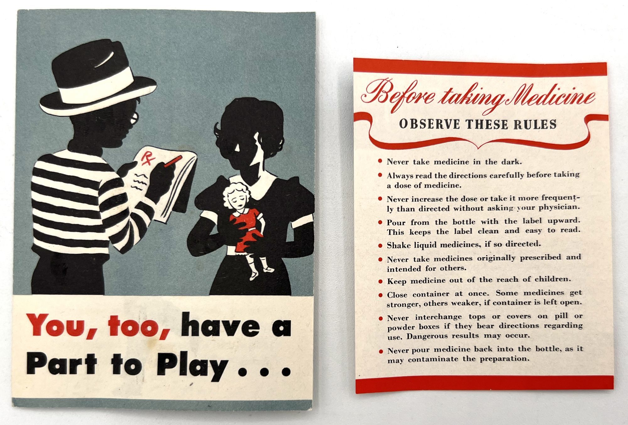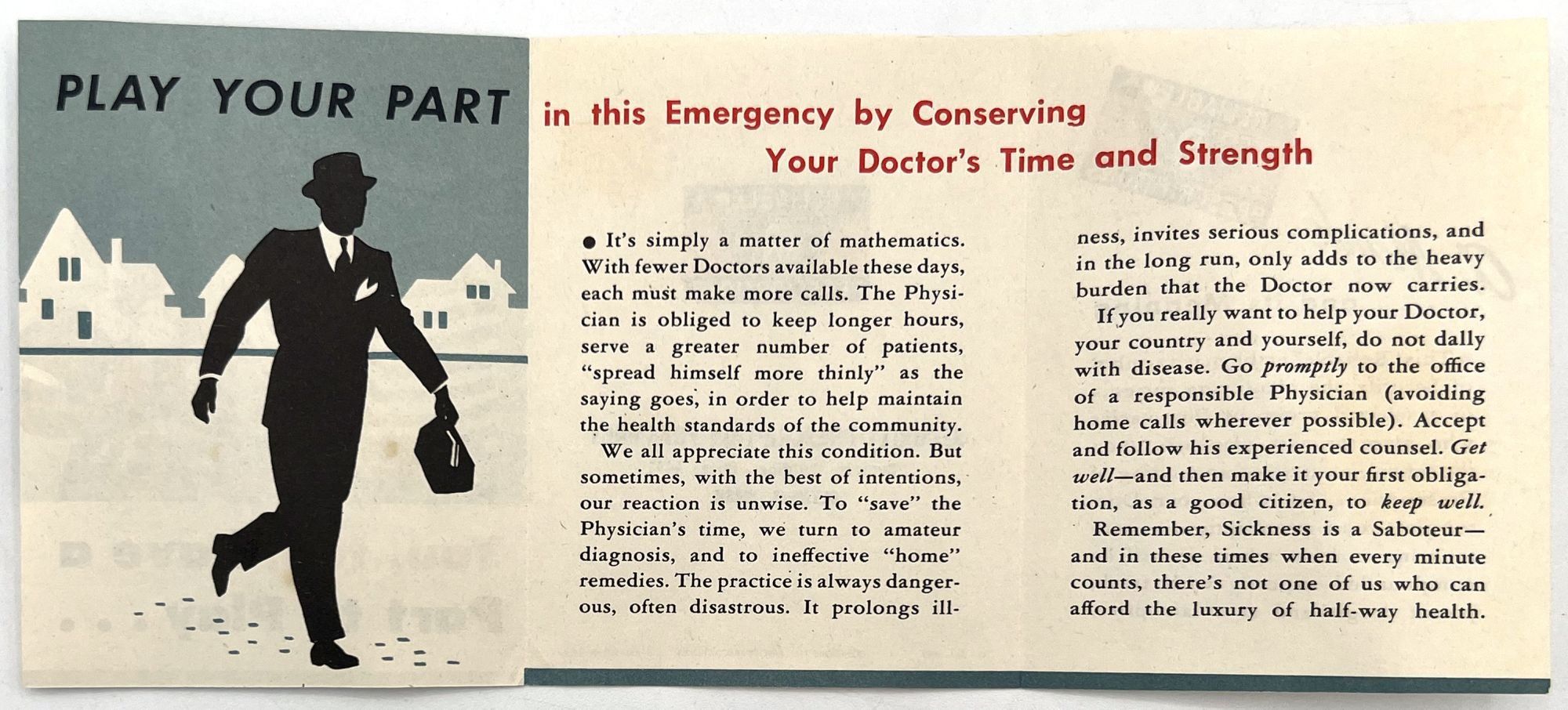 N.pl: Abbott Laboratories, 1943. Very good. Light toning.. PLAY YOUR PART in this Emergency by Conserving Your Doctor's Time and Strength". A WWII-era pharmaceutical leaflet, published in 1943 to educate the American public about the importance of keeping well, using prescriptions responsibly, and conserving the time of health practitioners during a time in history when their resources were spread very thin. Published by the pharmaceutical company Abbott Laboratories. Folding leaflet measures approx. 4" by 3" folded, 4" by 9" unfolded, with 3.5" by 2.75" printed insert with rules for being safe with prescriptions.