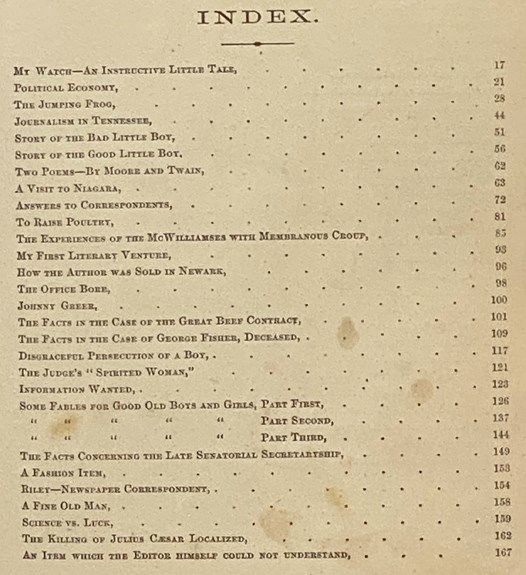 Hartford / Chicago: The American Publishing Company, 1875. First Edition. Hard Cover. Good/No Jacket. 0x0x0. First edition, second state (BAL 3364). Edges rubbed, boards and a few pages a bit soiled, ink name stamp on front endpaper. 1875 Hard Cover. 320 pp. Blue cloth, gilt and black titles and decorations. A collection of short stories, with one nonfiction piece (The Case of George Fisher), by the author of The Adventures of Huckleberry Finn, known for his satirical works and his honest look at American society.