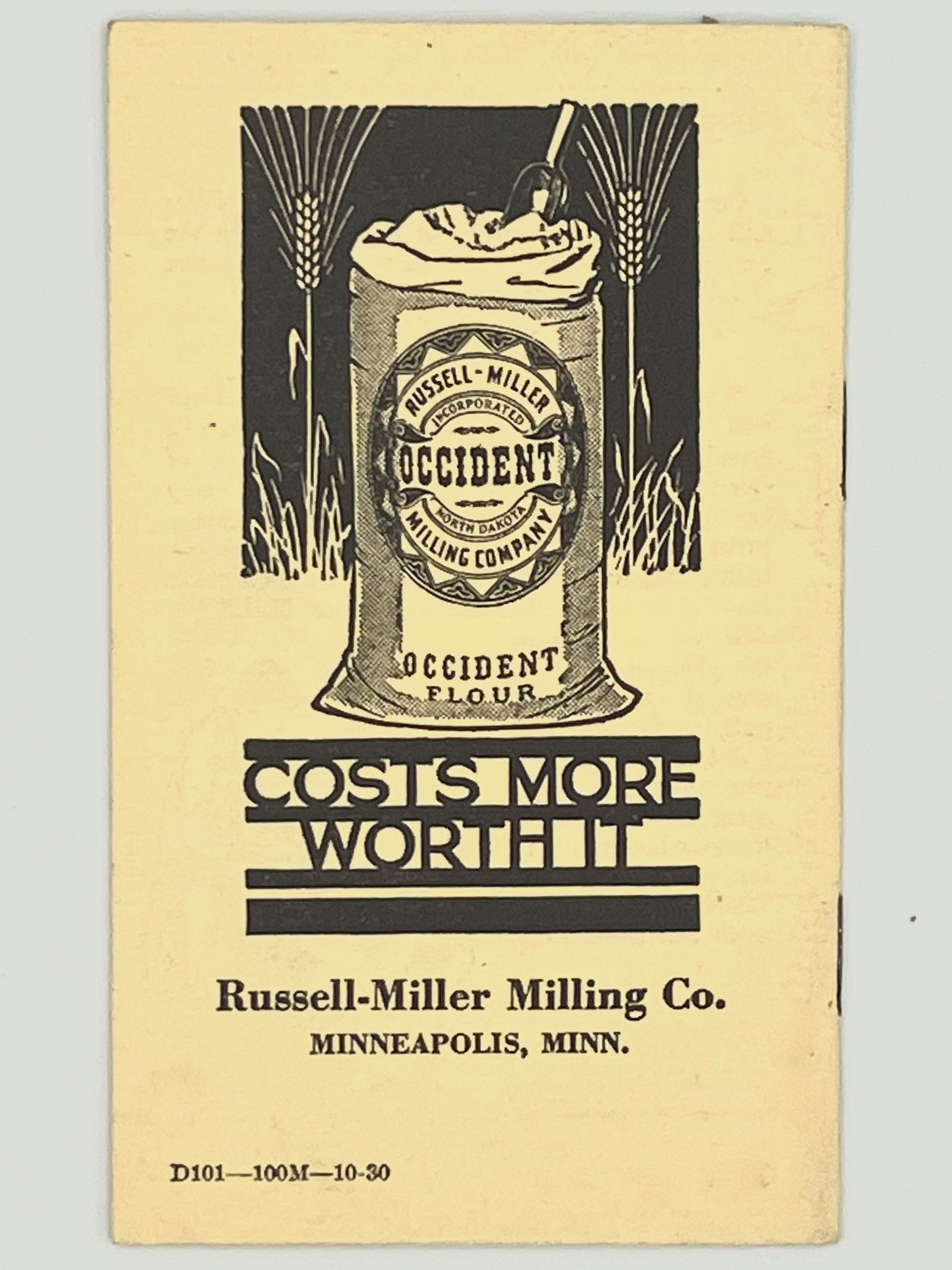 Minneapolis: Russell-Miller Milling Co., c. 1920s. Staplebound. Cream illustrated wraps. Near fine. 15 pages. 12.5 x 7.5 cm. Fictional "travelogue" or narrative describing the process of milling through the eyes of two young women from Minneapolis. Russell-Miller Milling Company was established in 1882 by John Russell and Arthur Miller in Valley City, North Dakota, on the banks of the Sheyenne River. The company quickly became known for its high-quality Occident brand flour, a name chosen to reflect its western origins in wheat production. Illustrated throughout. Light soiling to top 2 cm. of front cover, otherwise crisp and clean.
