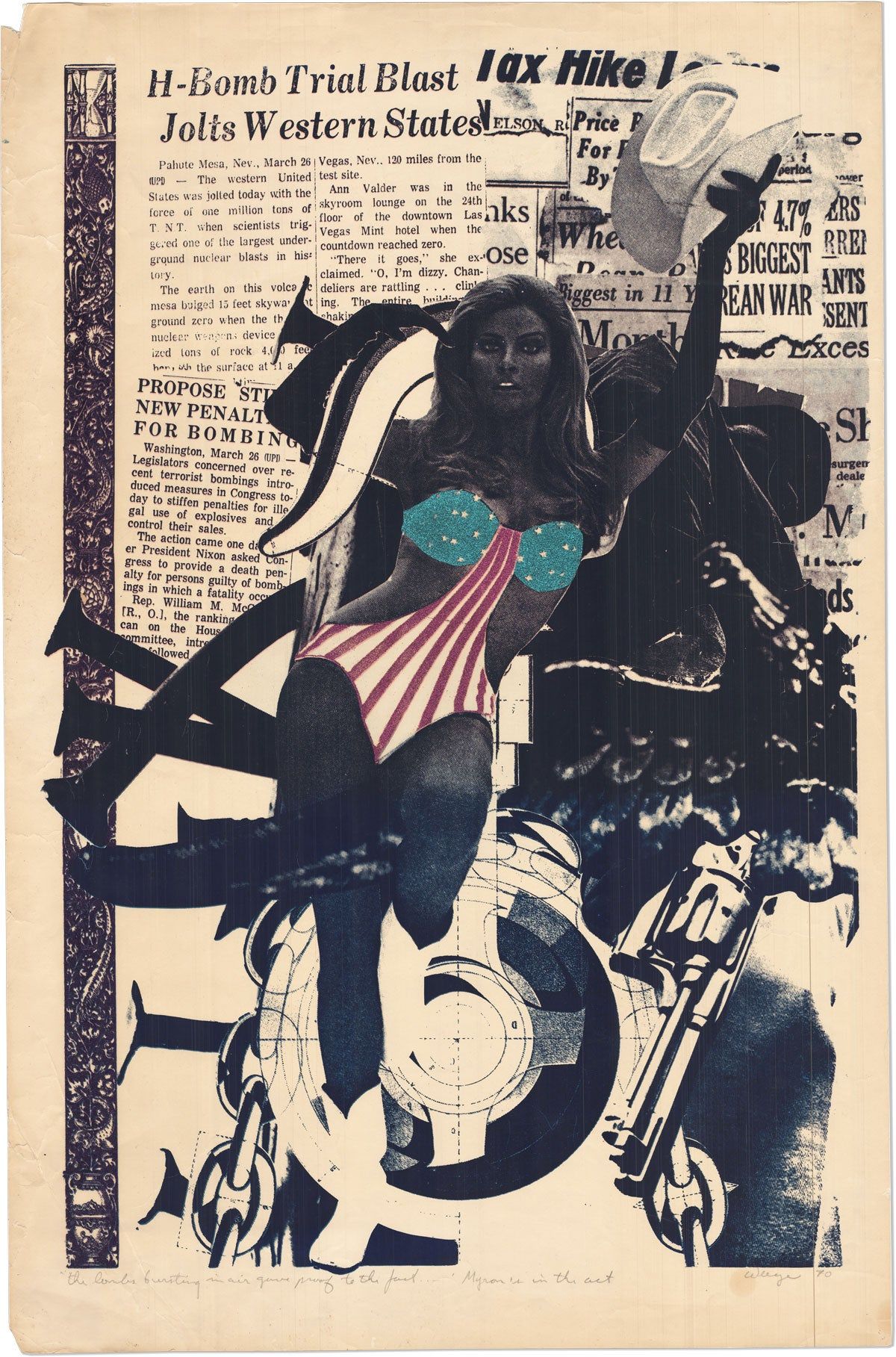 A quintessential Weege work from his early period, a satirical mash-up of American cheesecake and small arms weaponry printed against a background of topical text concerning atomic warfare. The stars and stripes on the cowgirl's unitard are highlighted with an applied coat of glitter-paint. The "Myron" referred to in the title is presumably Myron Tupa, Weege's college roommate at the University of Wisconsin, from whose collection the piece was acquired.