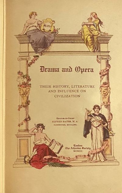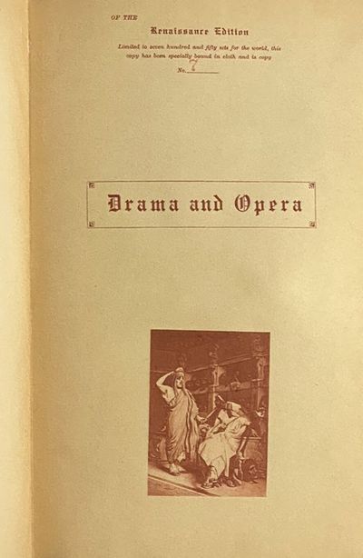 London: The Athenian Society, 1903. Limited Edition. Hard Cover. Very Good/No Jacket. Rahn, A.D.; Cabanel, Alexander; Russell, A.; Stuck, Franz; et al. Limited edition, #7 of 750 sets. Front hinge of volume 11 and both hinges of volume 12 just beginning to weaken, spine very slightly faded, closed tears to edges of a few pages, but overall a nicely preserved set. 1903 Hard Cover. Twenty-four volumes in twelve. 334, 349; 334, 344; 336, 348; 348, 344; 344, 336; 336, 344; 336, 336; 336, 344; 352, 352; 336, 344; ix, 349, 353; vi, 354, viii, 364 pp. Red cloth, elaborate gilt decorations and titles, top edges gilt. Color frontispieces and etched and engraved plates by various artists. A history of theatre, dramatic works, and the opera from ancient Greek times through the early twentieth century. Includes: Greek Drama, Greek and Roman Drama; Oriental Drama, Religious Drama; Italian Drama, Spanish and Portuguese Drama; French Drama; French Drama, German Drama; German Drama; British Drama; British Drama; Scandinavian Drama, Russian Drama; American Drama; The Opera; The Opera.