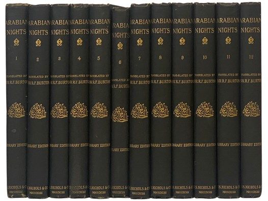 London: H.S. Nichols & Co, 1894. First Thus. Hard Cover. Very Good/No Jacket. 0x0x0. First Smithers edition, also called the Library Edition (Penzer p. 117-123). Sixth volume appears to be supplied, and from a slightly different format (it is slightly shorter, and the fore edge is not deckled, but the design is otherwise the same). Minor cosmetic wear, ink name on front endpaper of each volume, front hinge of first volume just beginning to weaken, flyleaves of each volume toned. 1894 Hard Cover. Complete in twelve volumes, a reissue of the 1885 Benares edition (which was printed by the Kamashastra Society for private subscribers only), edited by Leonard C. Smithers. 8vo. According to the preface, "In Lady Burton's edition, which was a reprint of the first ten volumes only of the original issue, it was thought advisable to omit no fewer than 215 pages; in this edition, which comprises the whole sixteen volumes (the entire work), more than four-fifths of these omitted passages have been restored. These few omissions are also rendered necessary by the pledge which Sir Richard gave to his Subscribers that no cheaper edition of the entire work should be issued; but in all other respects the original text has been reproduced with scrupulous fidelity. The reader has here, therefore, the most complete English edition of The Nights that can ever be published, the extreme grossness of the few words and passages omitted absolutely precluding their appearance." A reissue of the scarce 1885 Kamashastra Society edition (which generally sells for $4000 - 8000), following the same cover design. Black cloth, gilt titles and decorations, top edge gilt. Burton's translation of The Arabian Nights remains the authoritative version of this extensive collection of stories, and also stands as a unique example of liberality in publishing during the Victorian era. Despite the salacious content of many of the narratives, the first printed English version remained true to Burton's precise and inclusive translation. Burton was somewhat of a trailblazer in this regard, also publishing an authoritative version of the now-famous Kama Sutra.