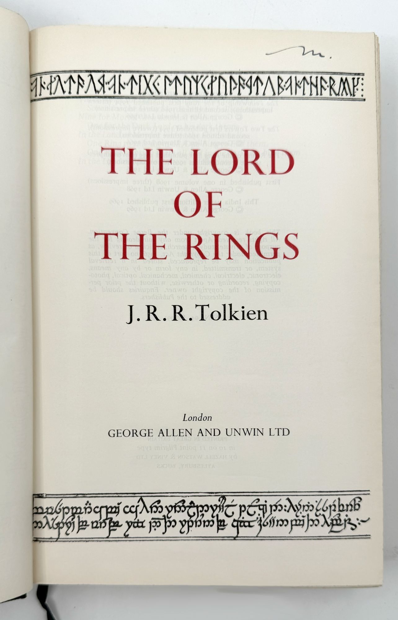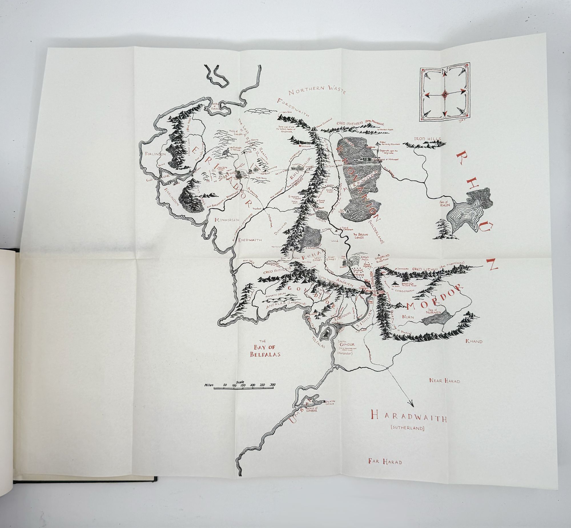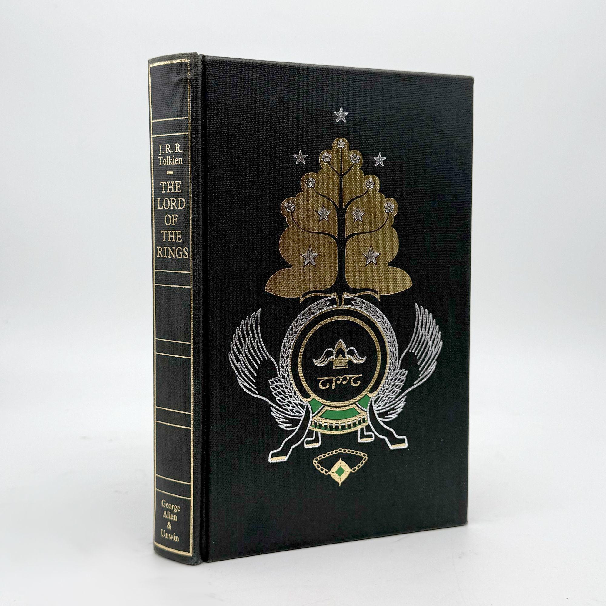 London: George Allen and Unwin Ltd, 1969. India Paper Edition. Illustrated, with pull-out maps; 1193 pp. 8vo. Black buckram with multicolored gilt designs on cover and gilt spine. Onionskin block slightly shaken from reading, magazine image of Tolkien pasted to front pastedown, and front hinge tender at head and foot of spine. India Paper Edition. Illustrated, with pull-out maps; 1193 pp. 8vo. The India paper edition used the text of the first single volume paperback edition of the previous year, but expanded to include appendices. The cover design is based on one of Tolkein's designs for the jacket of The Return of the King. Hammond pp. 143-144