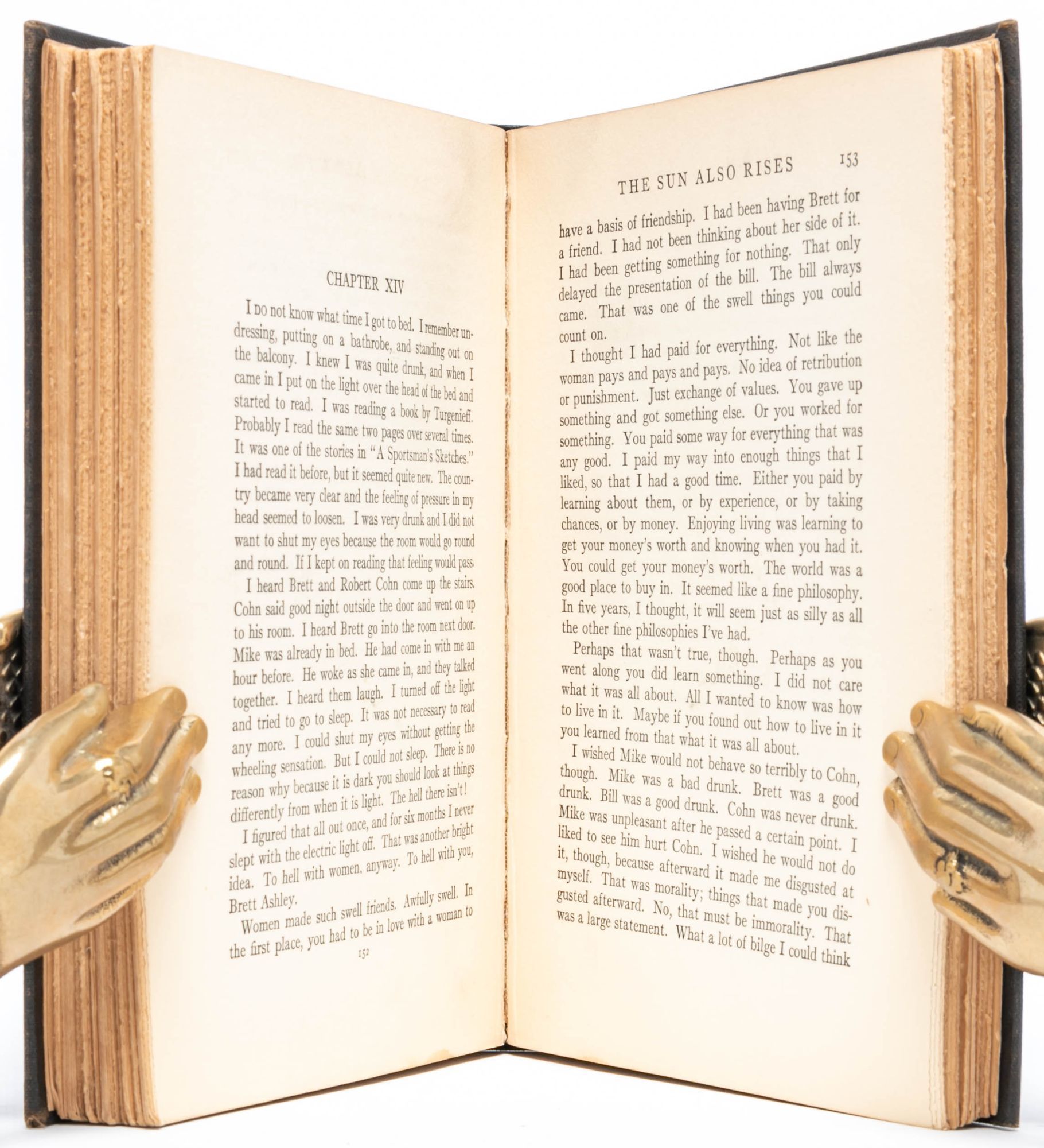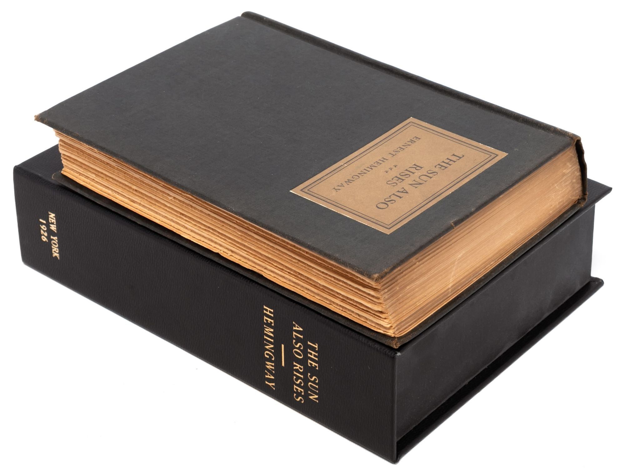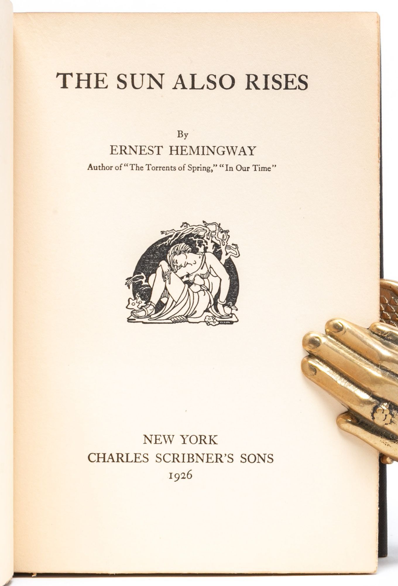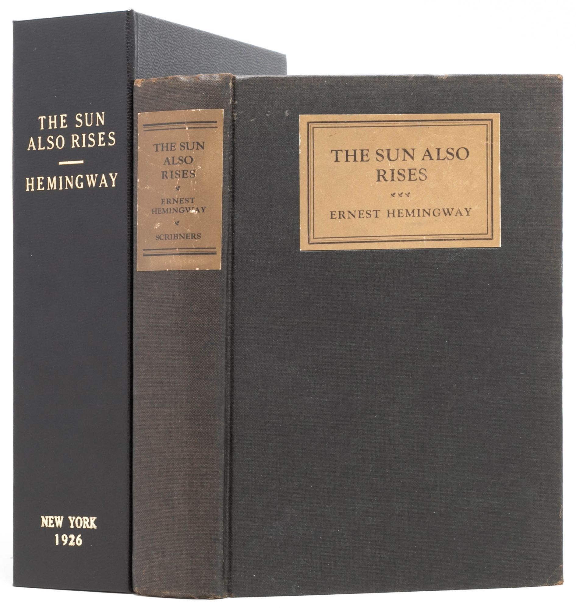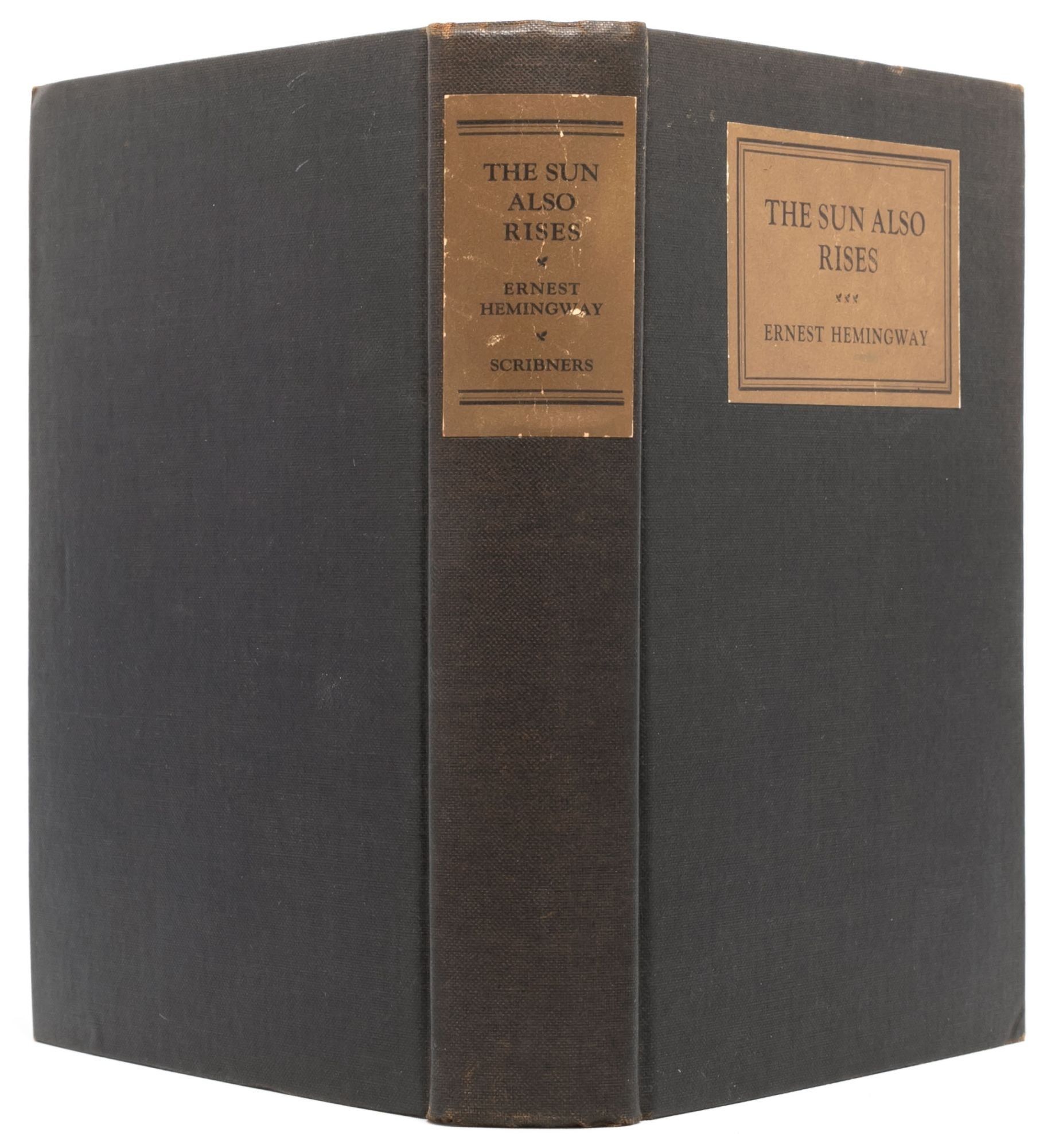 Hemingway's classic novel - a roman à clef about a group of American and British expats in Spain, centered around the characters of Jake Barnes and Lady Brett Ashley. Based on Hemingway's own experiences in Spain in the 1920s, visiting there with his wife and friends and watching bullfighting, it is without question one of the great American novels. Perhaps the most important to depict the Lost Generation, the novel was an immense success – college students began to emulate the dress and manner of the characters and Hemingway was made a household name. Interestingly enough, the first printing of the novel was only around 5000 copies, but this, and a second printing of a few thousand copies, quickly sold out. "Hemingway writes as if he had never read anybody's writing, as if he had fashioned the art of writing himself" (contemporary review in The Atlantic). Very Good +.