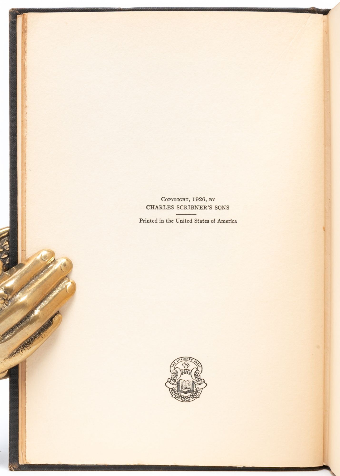 New York: Charles Scribner's Sons, 1926. First edition. Very Good +. First state, with "stoppped" on page 181 uncorrected. Original black publisher's cloth, retaining the delicate gold paper labels to spine and front board. A Very Good+ copy of the book. Offsetting from a small envelope on the rear flyleaf, some discoloration to the front flyleaf as well. Housed in a black custom clamshell case.