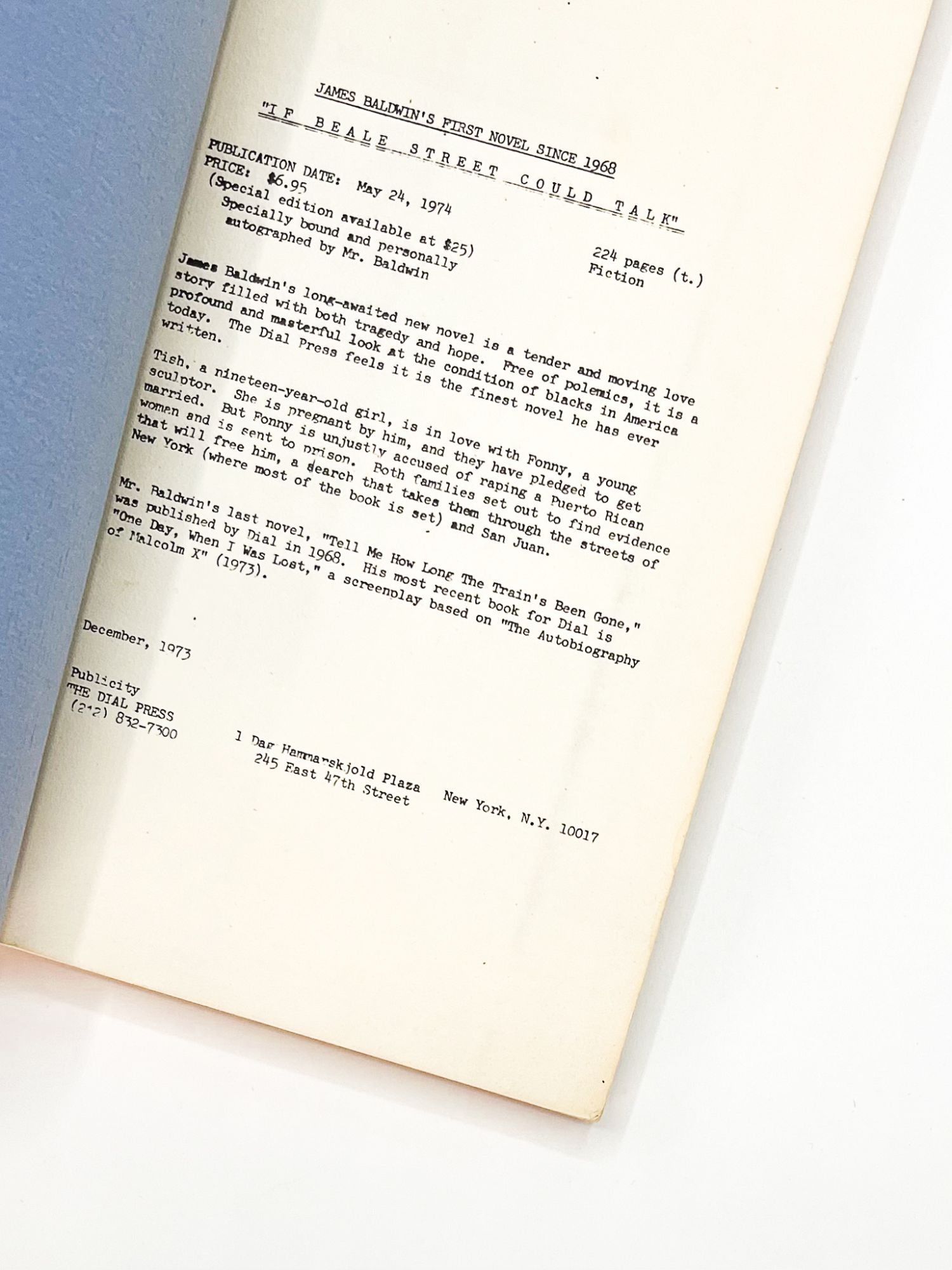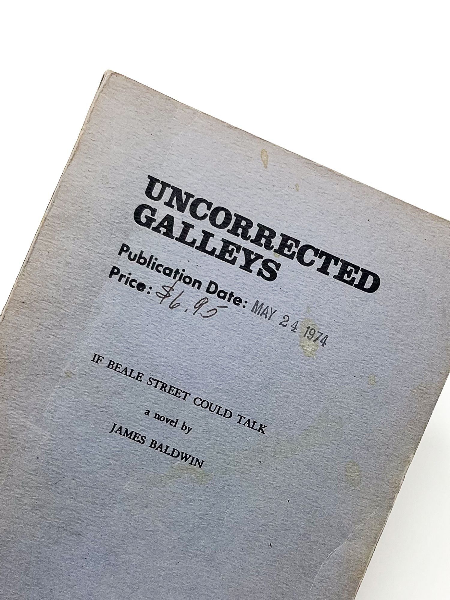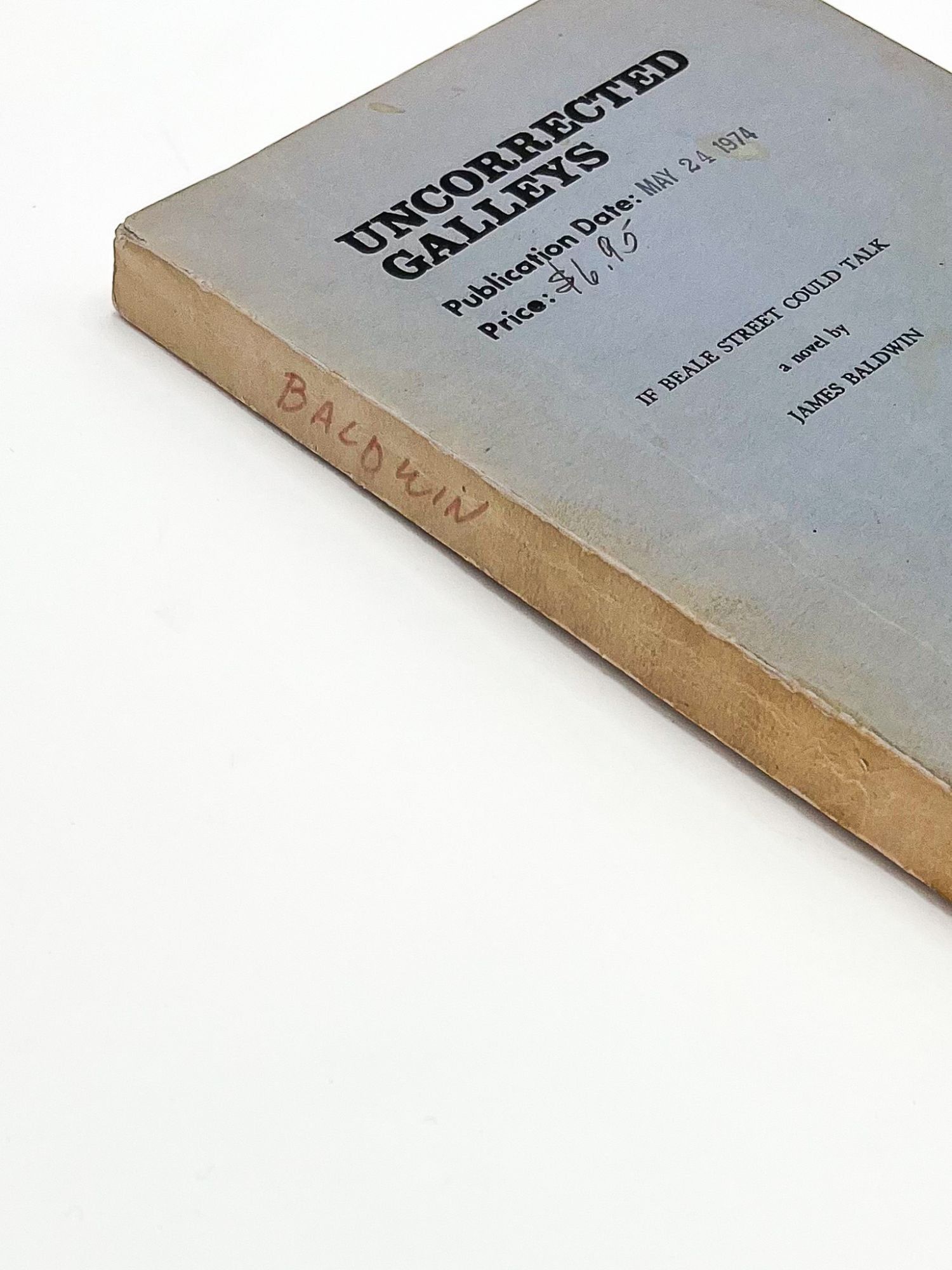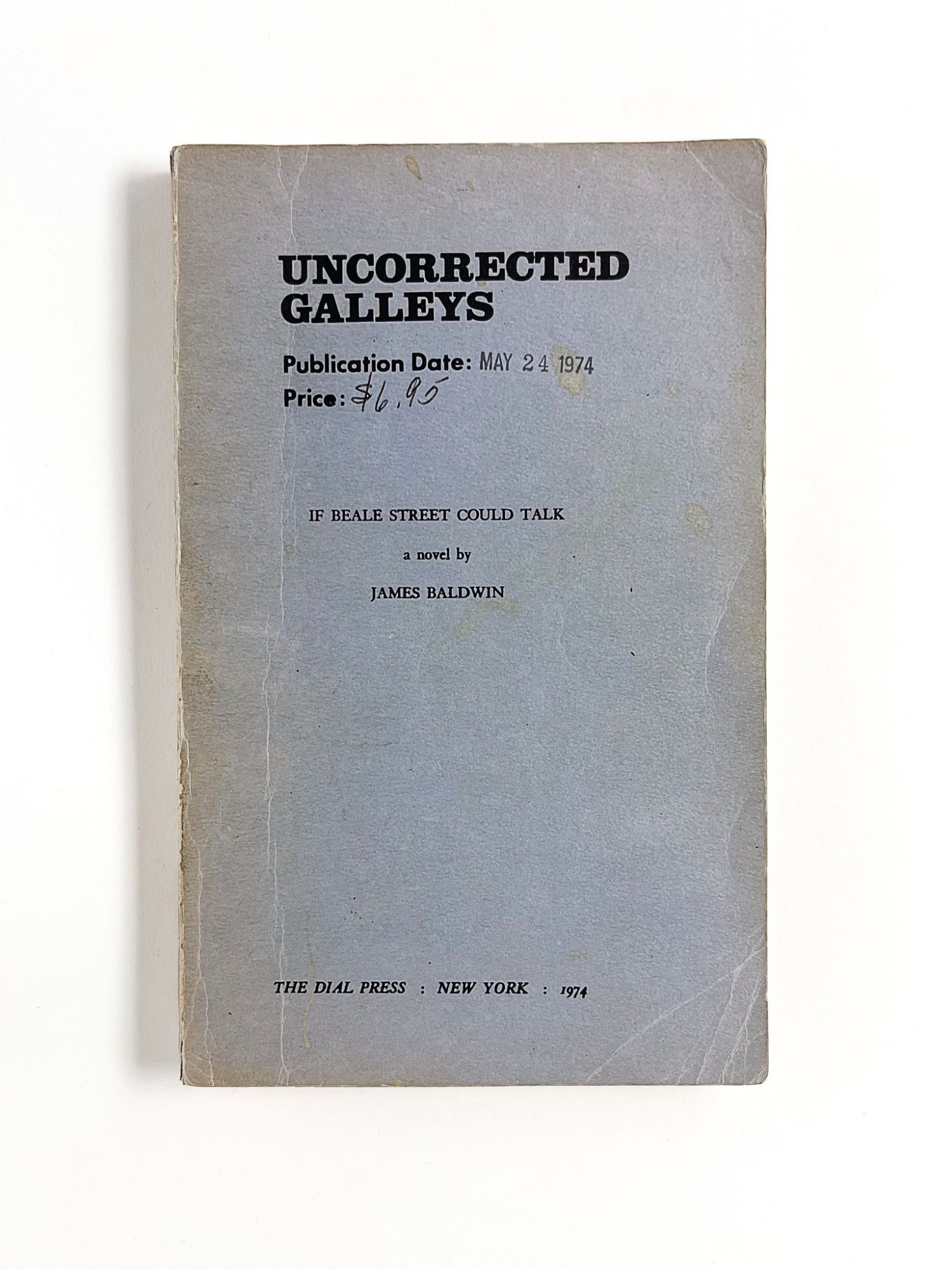 New York: The Dial Press, 1974. Very good.. Rare uncorrected galleys of the first edition, made up from sheets from the limited edition (and with an unsigned limitation page), of Baldwin's great novel centered around a Harlem love story. With every year that passes since Barry Jenkins's shimmering and triumphant 2018 film adaptation of Baldwin's love story, the contemporary critical reaction to the novel — hostility to the very concept of a love story, that base and contemptible form; contempt for the unmistakable stamp of human affections and the ineradicable stain of sentimentality on every page — becomes trickier to understand in context. Anatole Broyard, vibrating with absolute contempt in THE NEW YORK TIMES, brought out the biggest gun of 1974 when he wrote that BEALE STREET "could make it equally well as a 'gothic novel'" — so successful has been the genre's rehabilitation that the word, like "romance," no longer functions lethally as an unanswerable insult. The firing pin is rusty, the trigger is stuck, the gun will not go off. A deeper reading came from the unfailing Joyce Carol Oates, who likewise noted the "very traditional celebration of love" at the novel's heart, but found nothing there to mock or denigrate: "IF BEALE STREET COULD TALK is a moving, painful story. It is so vividly human and so obviously based upon reality, that it strikes us as timeless—an art that has not the slightest need of esthetic tricks" (Oates). Rare in this format. 8.5'' x 5.25''. Original blue printed wrappers. Publicity leaf, dated December 1973, lists publication date as May 24, 1974 with price of $6.95 for trade and $25 for signed limited edition. [14], 189, [1] pages. Spine toned and titled "Baldwin" in pen; some mild creasing, soil to wraps. Penned notes, marginalia, and other reader marks, presumably a contemporary reviewer's, throughout. A few unobtrusive stains internally. Overall sound.