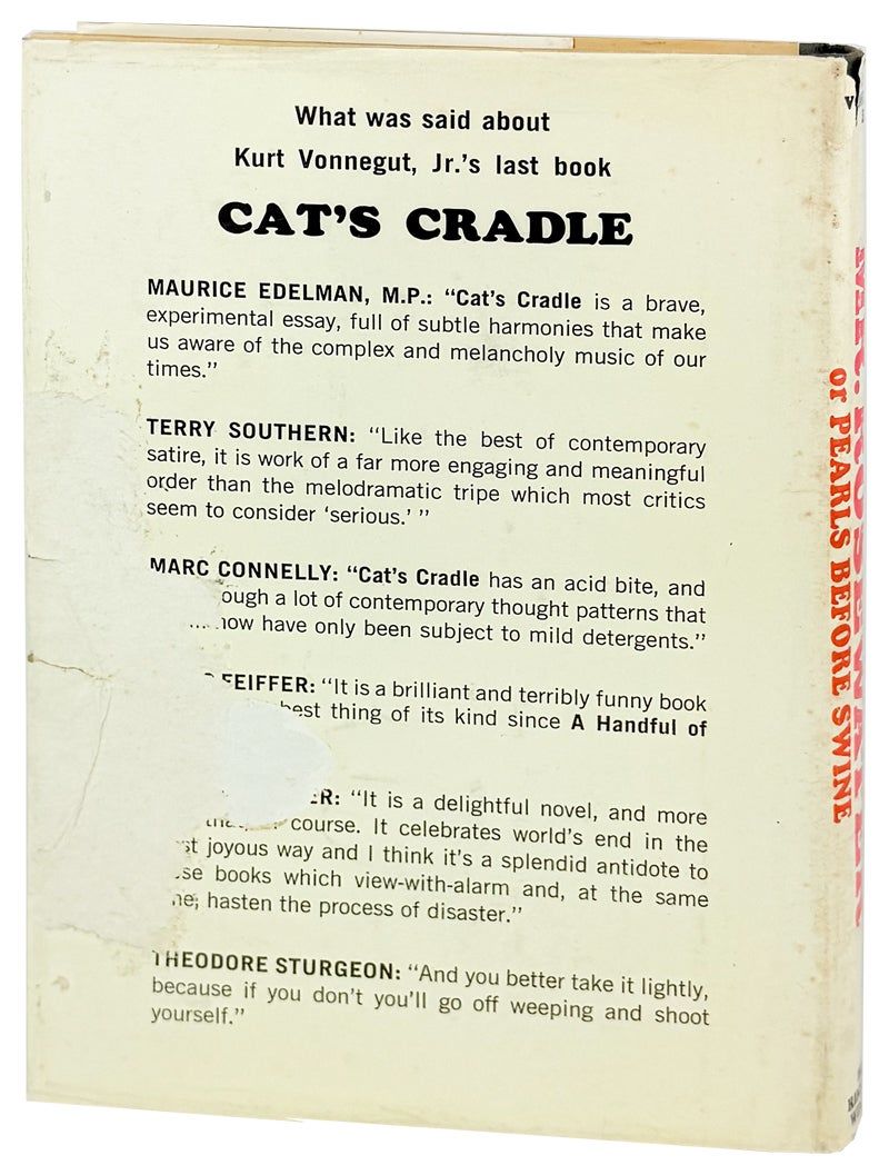 New York: Holt, Rinehart and Winston, 1965. Very Good/Very Good. New York: Holt, Rinehart and Winston, 1965. First Edition. Octavo. 217pp. Illustrated dust jacket with $4.95 price present. Gray cloth spine over colored paper-covered boards; "Examination Copy" stamped on front free endpaper. Damage to rear panel and flap affecting text with a few adjacent tears; general rubbing; foxing, principally to verso. Boards bumped at bottom corners; a few smudges at spine ends. Binding sound and, aside from stamp, unmarked. Even with dust jacket damage, still a Very Good copy of Vonnegut's post-modern satire, his fifth published novel.
