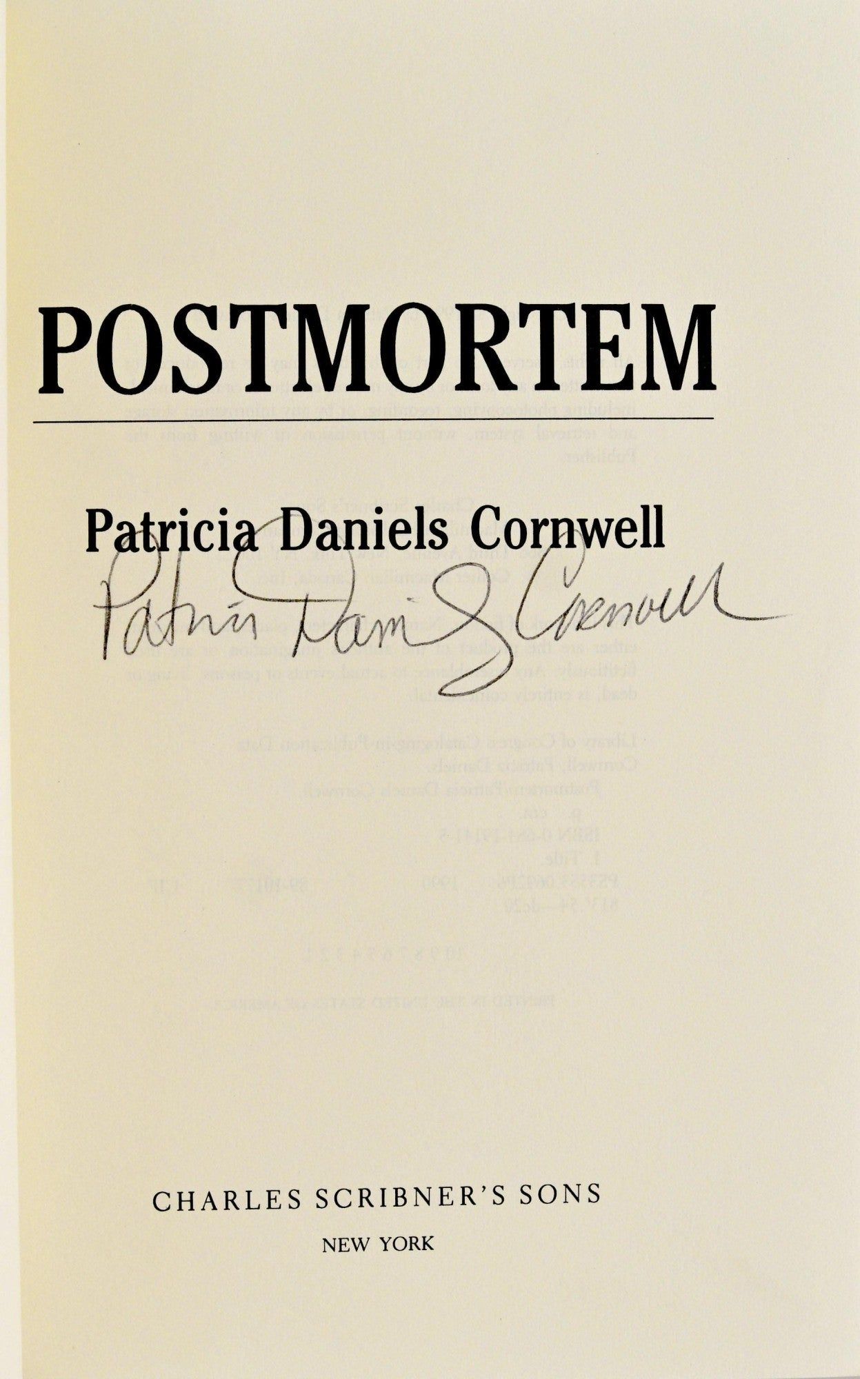 New York: Charles Scribner’s Sons, 1990. Hard Cover. Near Fine binding/Near Fine dust jacket. Signed. 8vo; in quarter black cloth over red boards; with titling on the spine in silver; 293 pages; a near fine copy in a near fine dust jacket protected by mylar; signed Patricia Daniels Cornwall on the title page.~~A beautiful copy of Patricia Daniels Cornwall’s first mystery novel introducing Dr.Kay Scarpetta. Near Fine binding / Near Fine dust jacket.